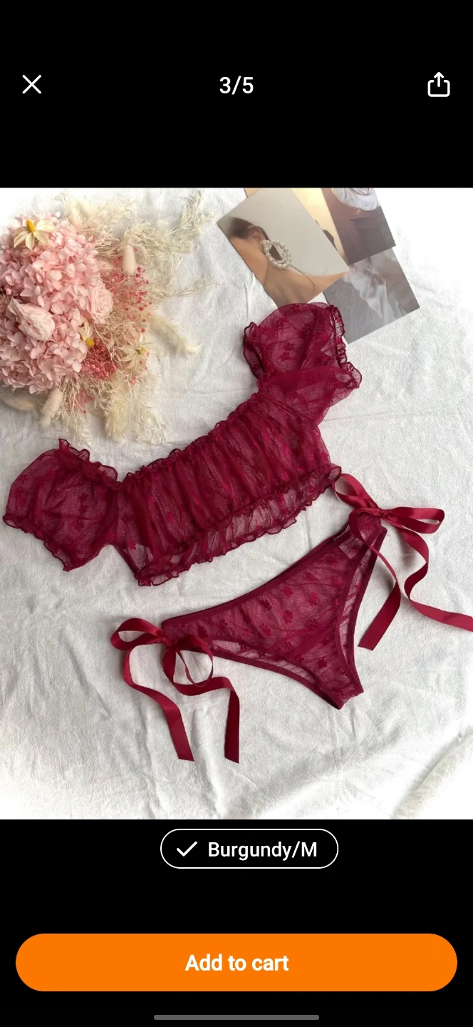 Stunning burgundy lace lingerie set. Features off-the-shoulder top and matching briefs. Includes delicate ribbon ties. Size Medium. pick up only please