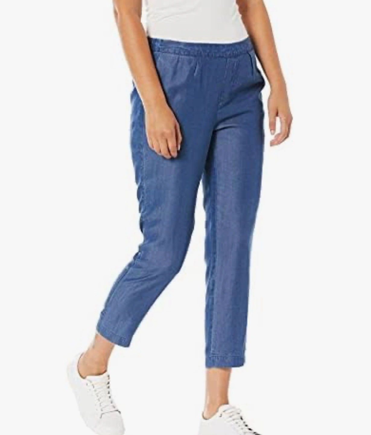 Comfortable pull-on ankle pants. Relaxed fit. Blue denim. Elastic waistband. Side pockets. Great for casual wear.