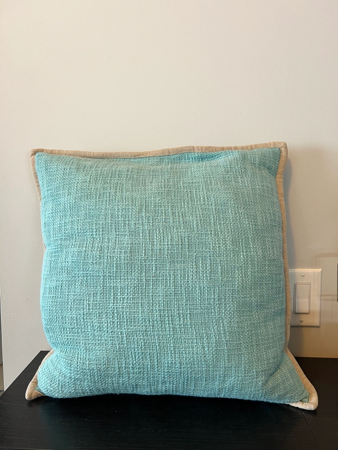 Beautiful teal pillow cover. Neutral coloured trim. Soft, textured fabric. Zipper closure.