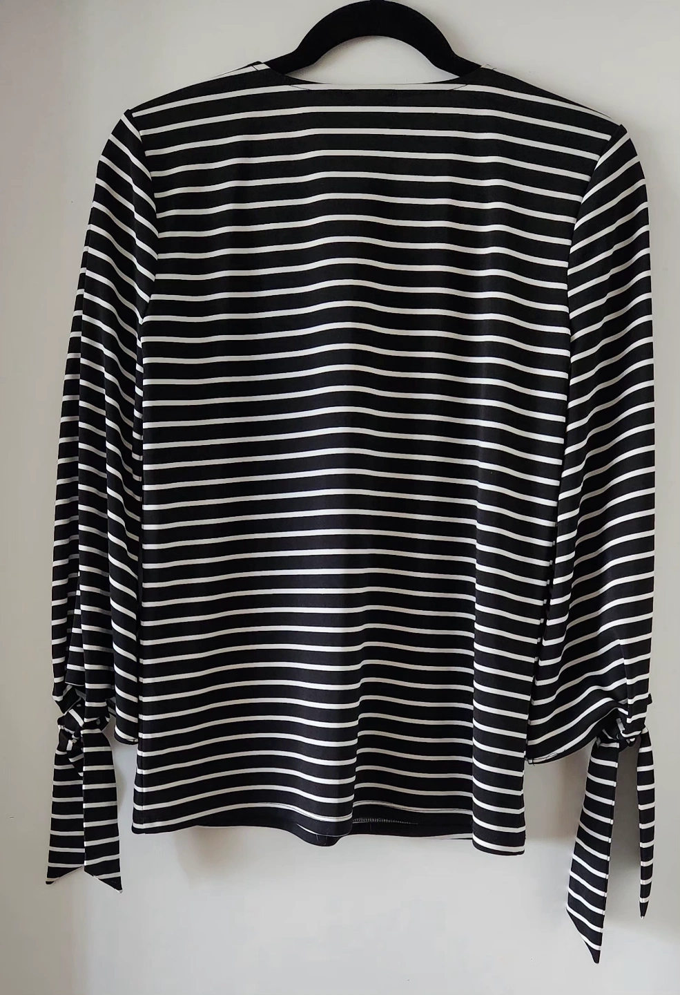 Anne Taylor Factory black and white striped blouse. V-neck with three-quarter sleeves featuring a tie detail. Women's size small. Perfect condition.