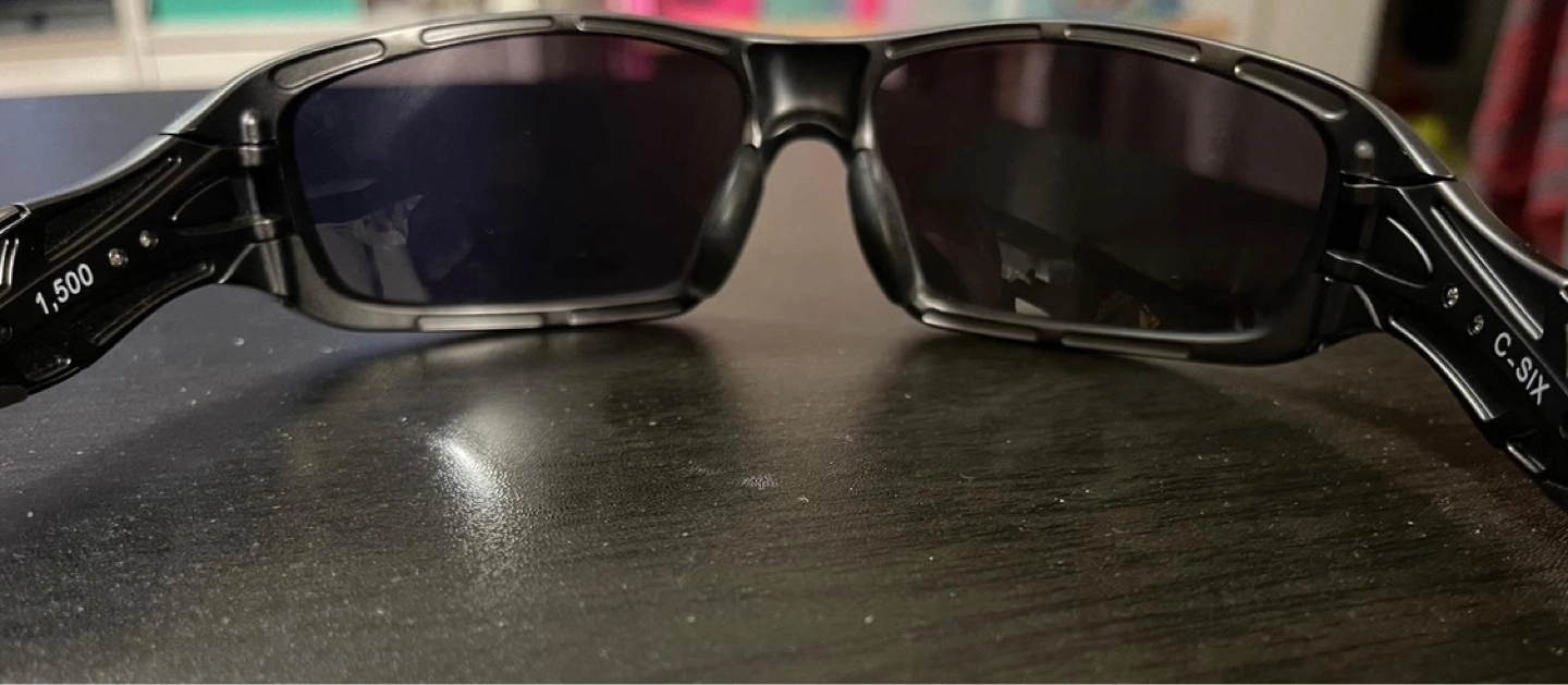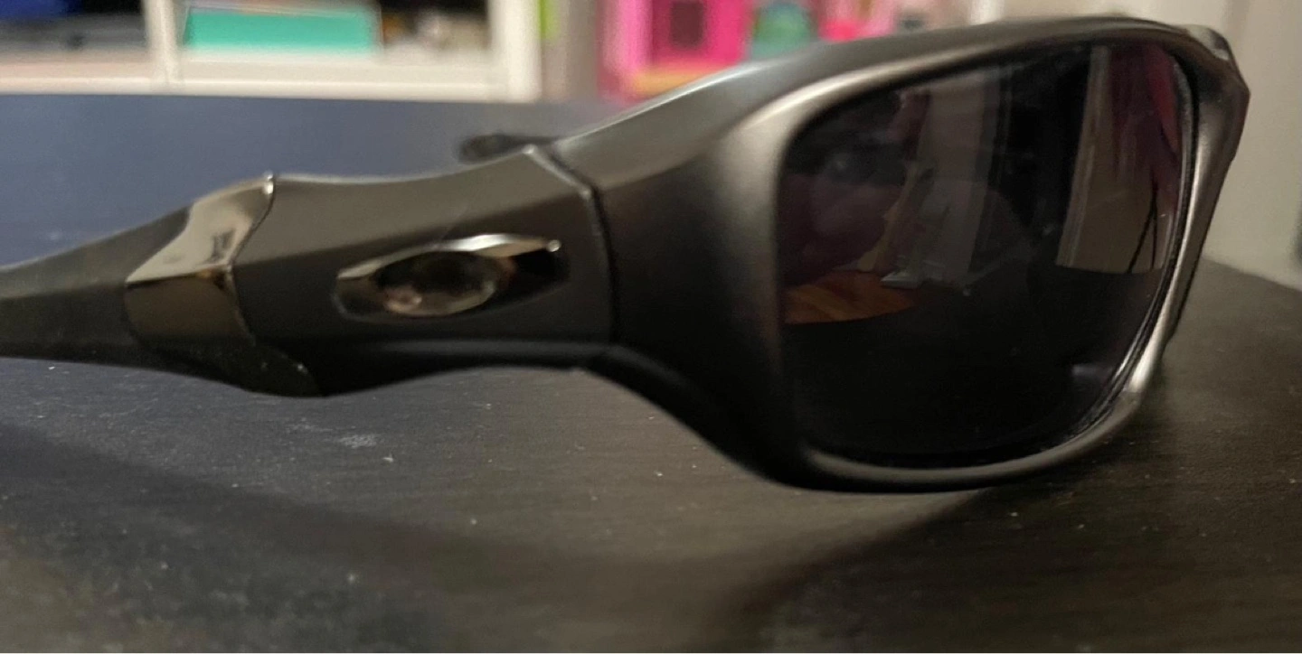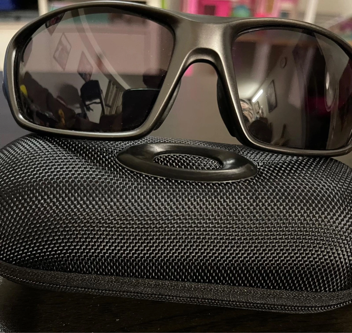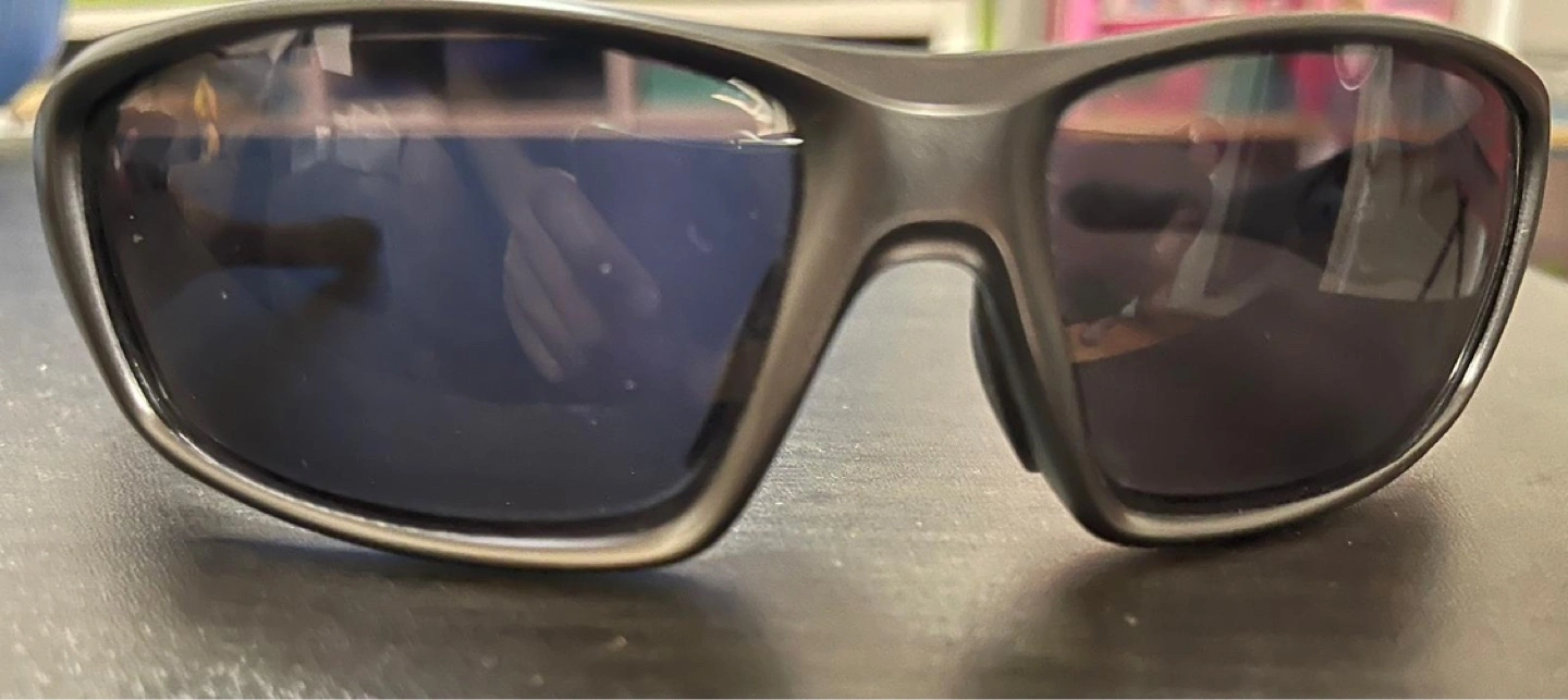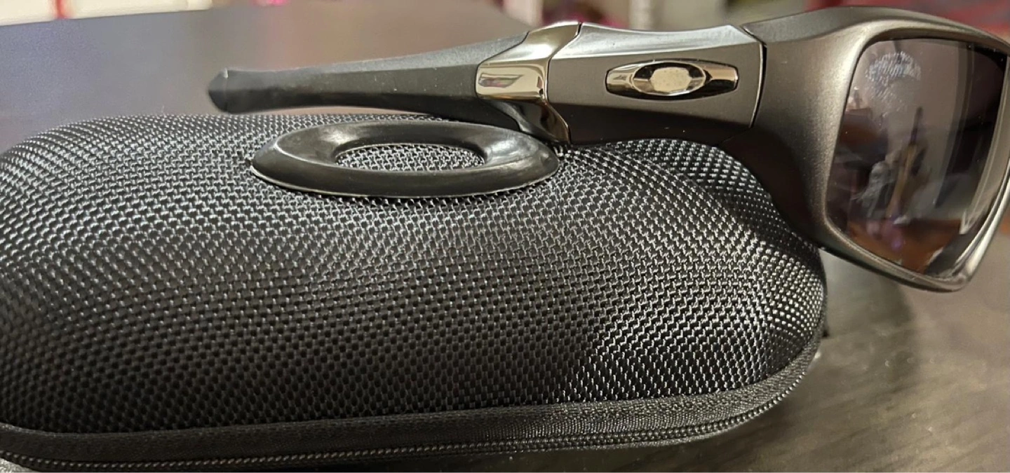 Men's Oakley sunglasses, dark grey frames, dark lenses. Includes hard case. Great for outdoor activities.