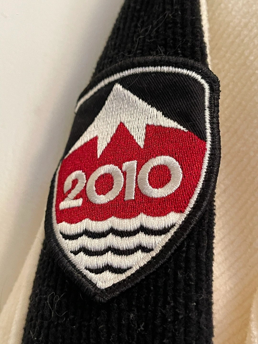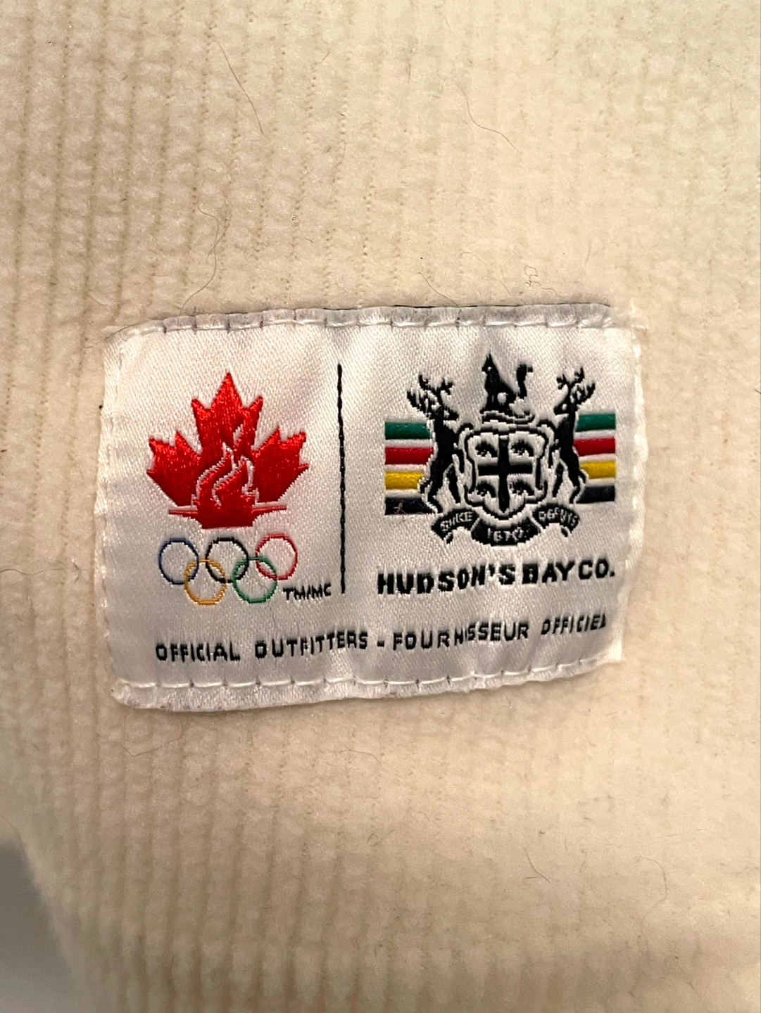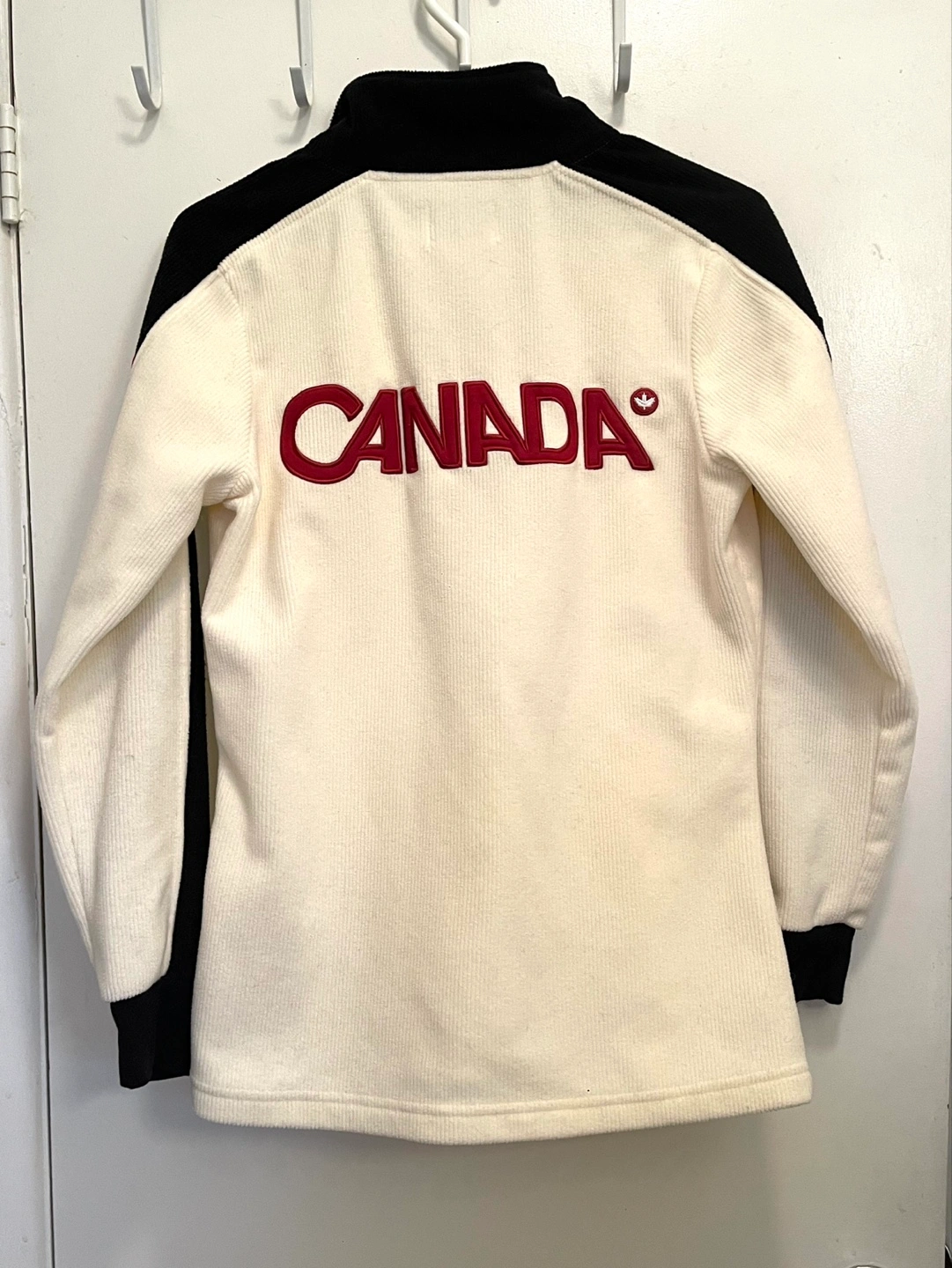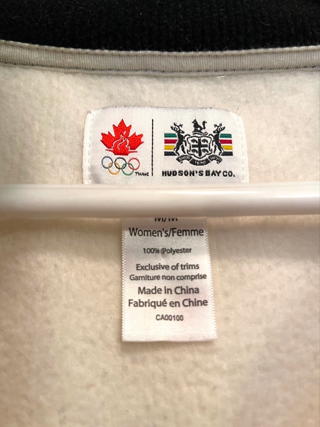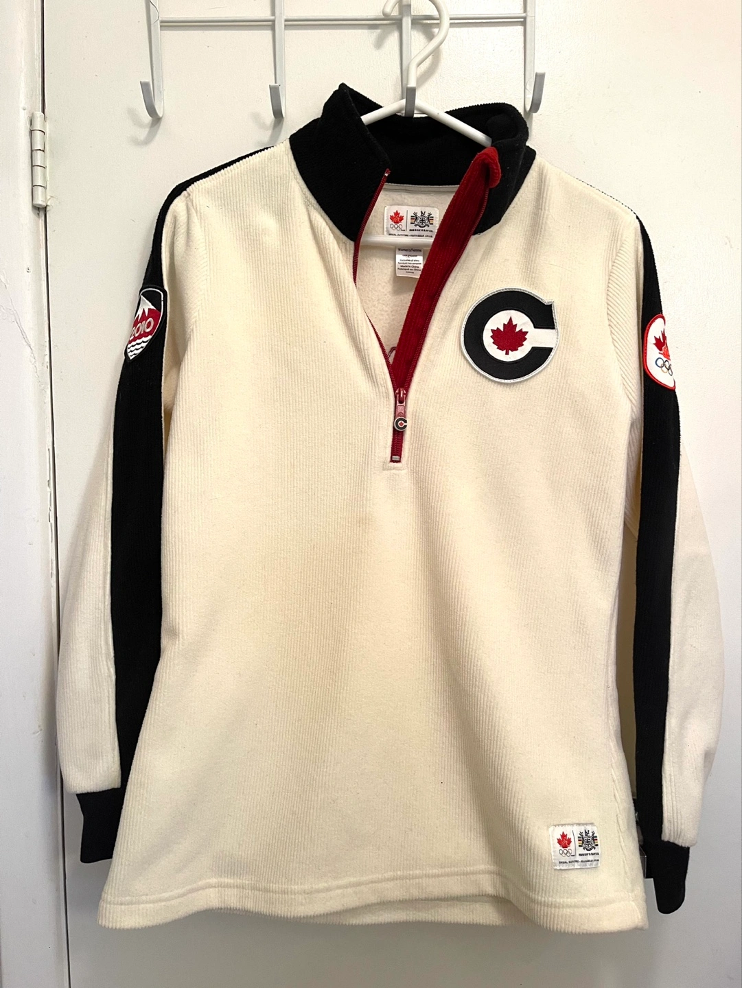 Women's 1/4 zip chenille sweater in excellent, nearly new condition. Cream coloured body with black ribbed accents. Features embroidered patches, including the 2010 Vancouver Olympics logo and Canada logo. 100% polyester. Official outfitter.