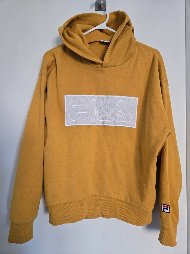 Mustard yellow thick and cozy hoodie No size tag but S-M Unsure if it's auth Fila or not? Price reflects this.