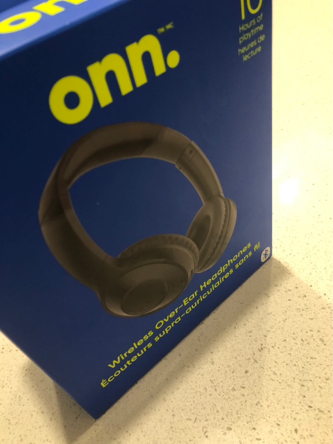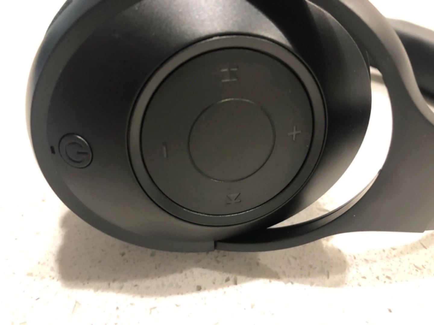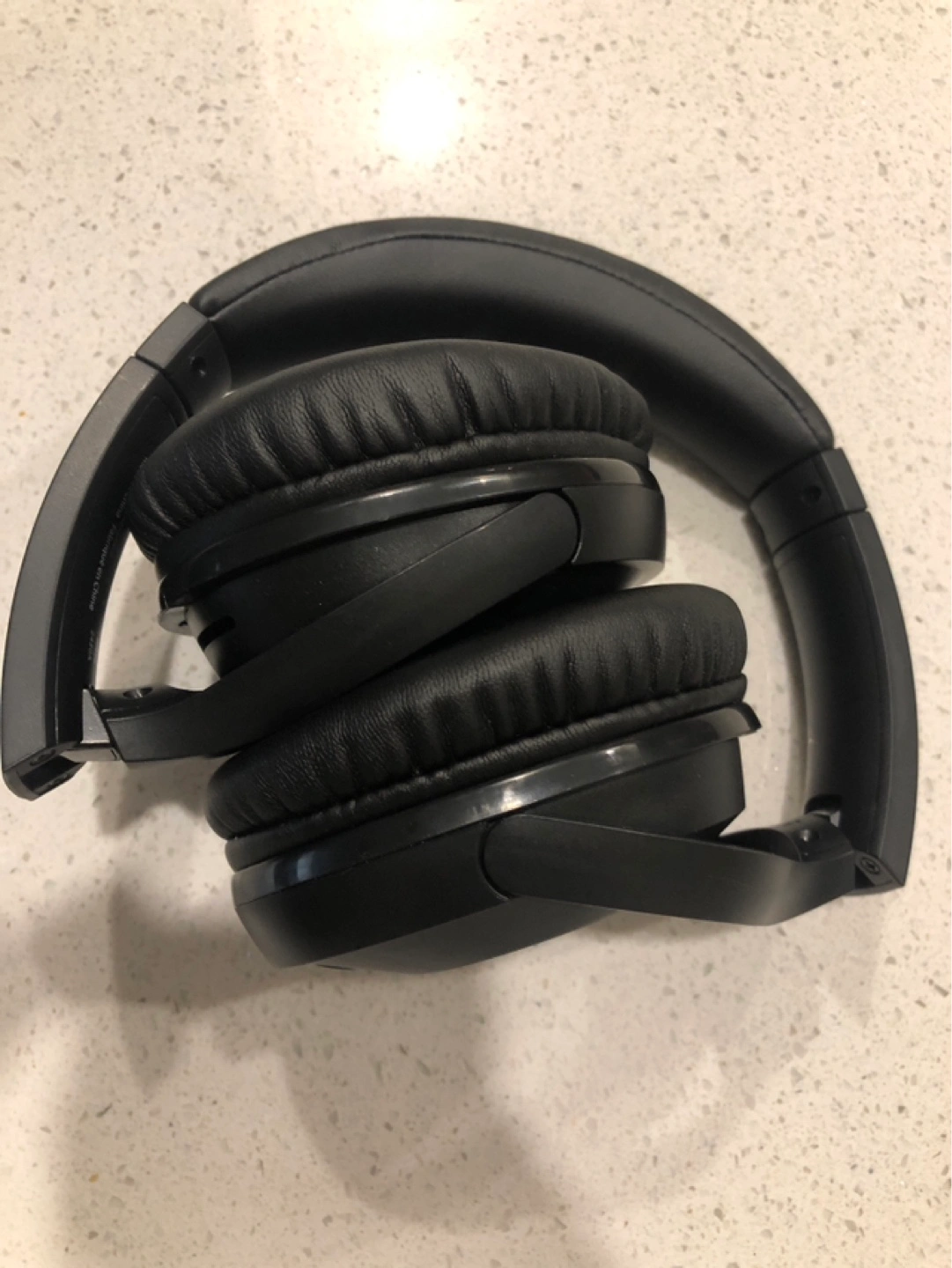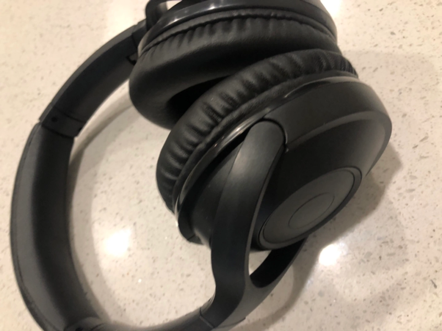 Black wireless over-ear headphones. Comfortable fit. Includes controls for volume and playback. Excellent sound quality. Long battery life.