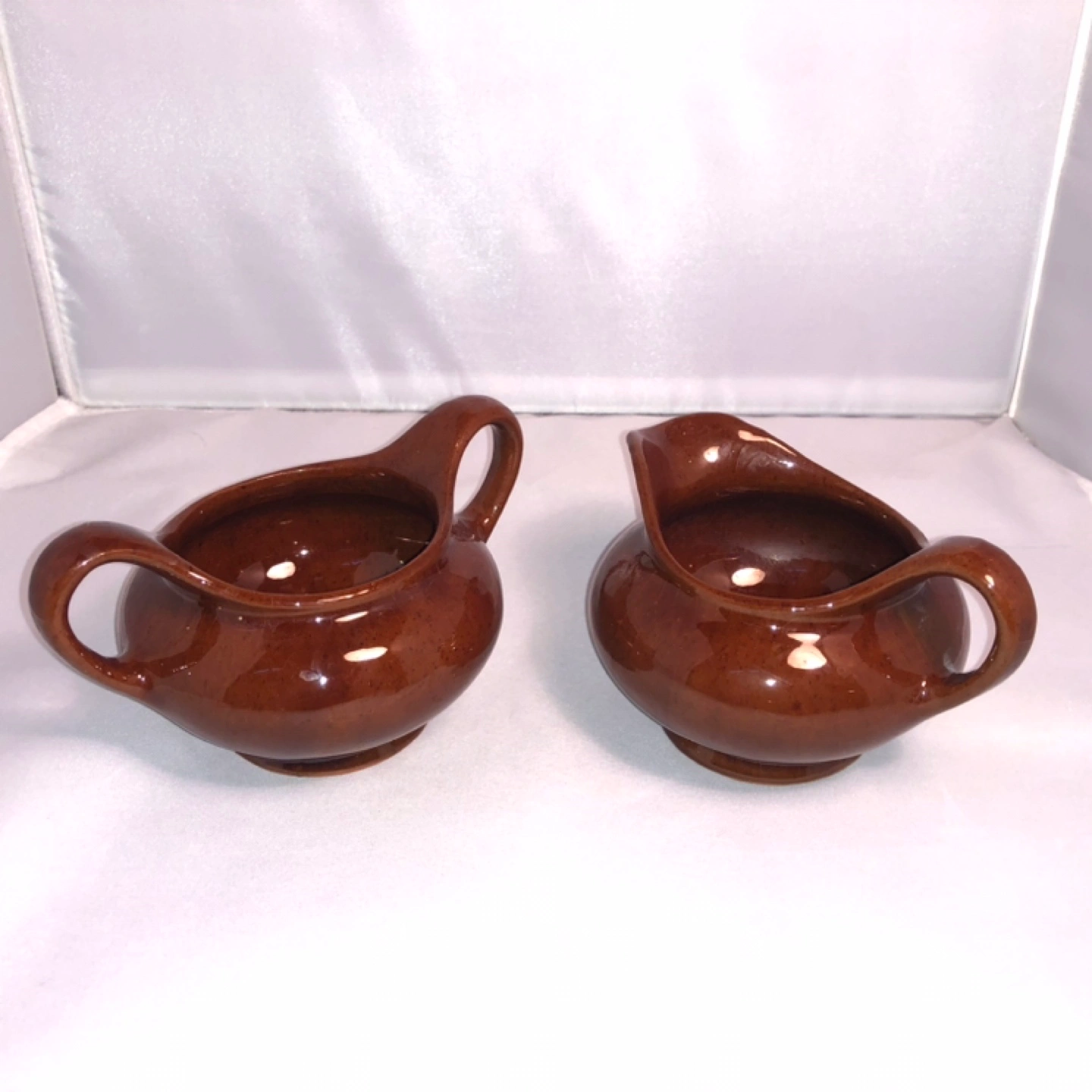Adorable vintage creamer and sugar bowl set by Evangeline of Canada. Warm chocolate brown pottery. Unique design. Perfect for adding a touch of vintage charm to your kitchen. Asking $25.