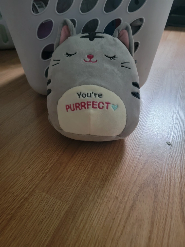 Grey cat Squishmallow plush toy. Says "You're Purrfect" on its belly. Soft and cuddly.