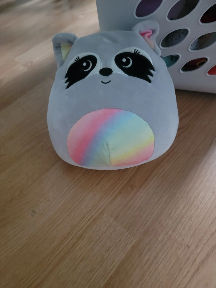 Grey raccoon Squishmallow plush toy. Features a rainbow-coloured belly. Soft and cuddly.