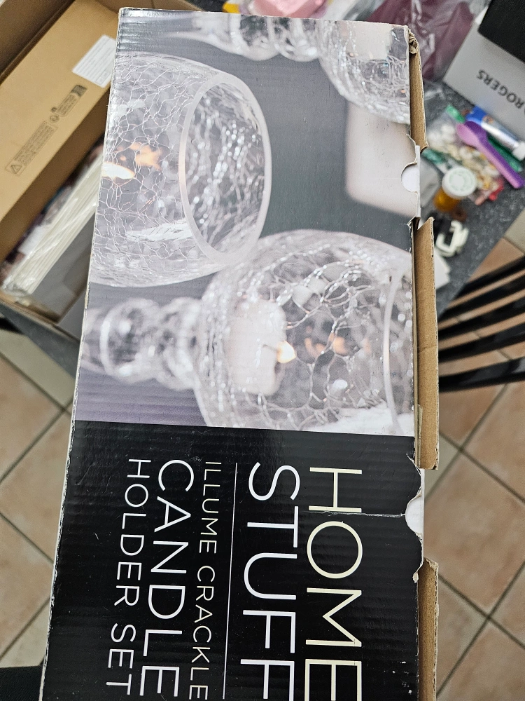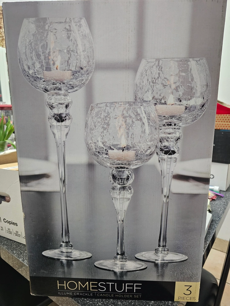 Three-piece candle holder set. Crackle glass design. Varying heights. New in box. Dimensions on box. Pick up only.