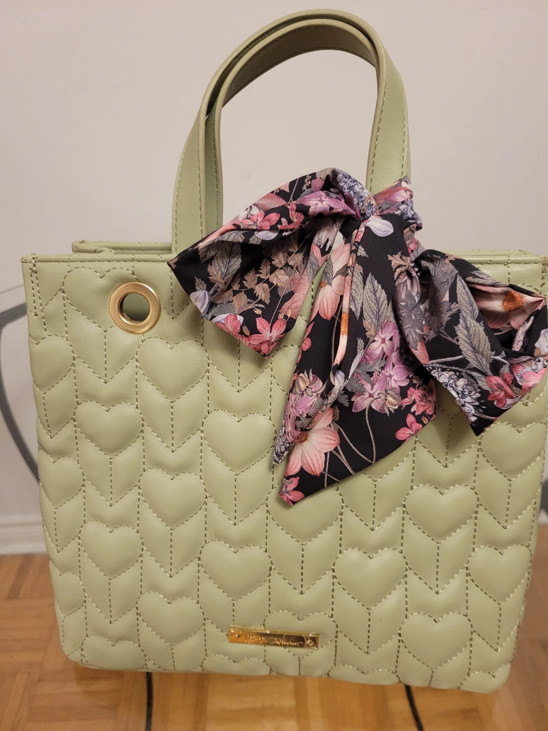 Brand New Never Used Adorable Sage Green Quilted Tote Bag. Features a heart pattern and gold hardware. Includes a floral scarf. Perfect for summer and everyday use. Pick-Up only. * Pick up at 100 Wellesley St. E - Tue, Thur & Weekends - All day - Other Days - Evening as from 6:30 pm * If interested, only send me your pick-up plan. I will not respond to automated messages.