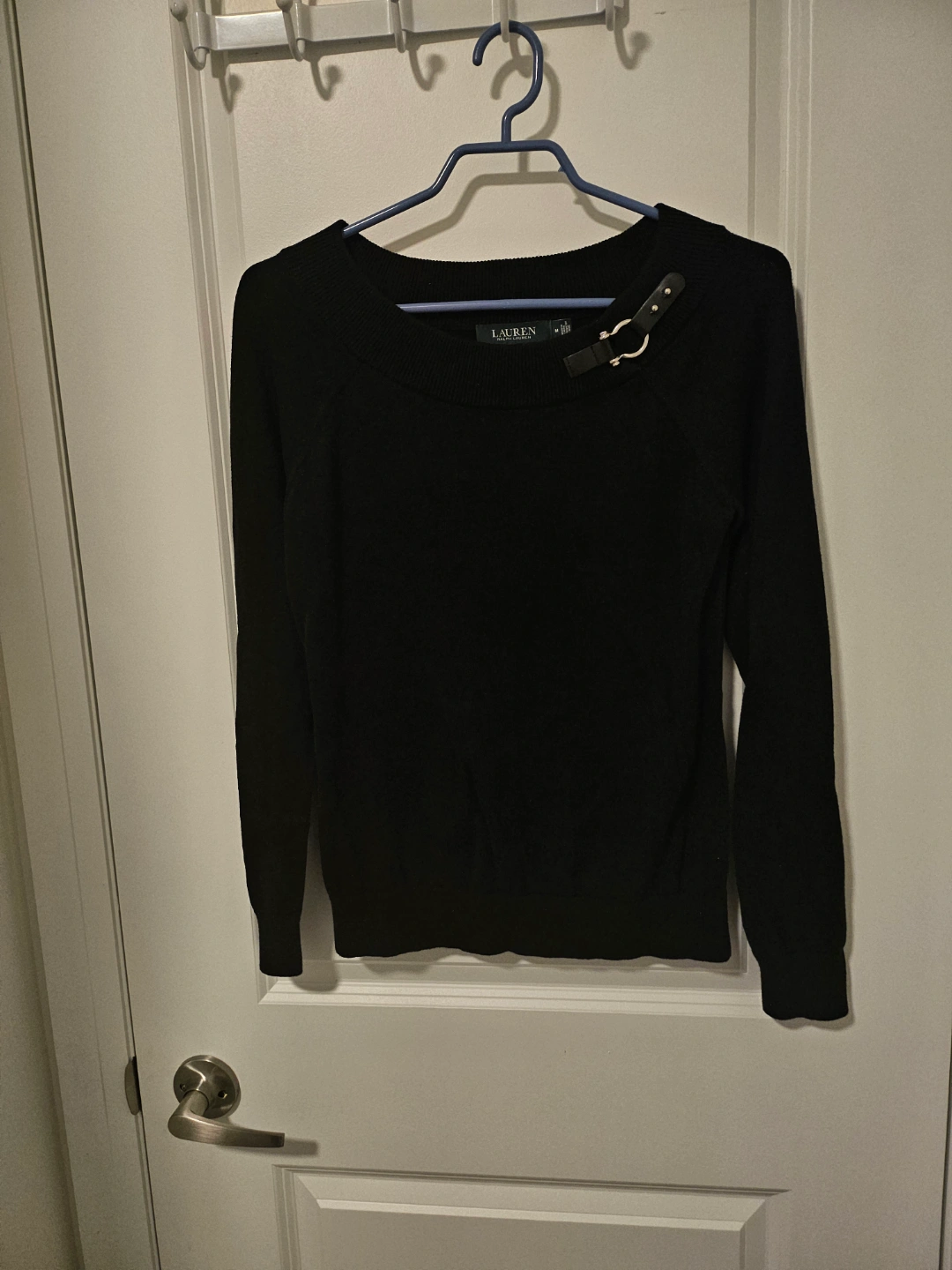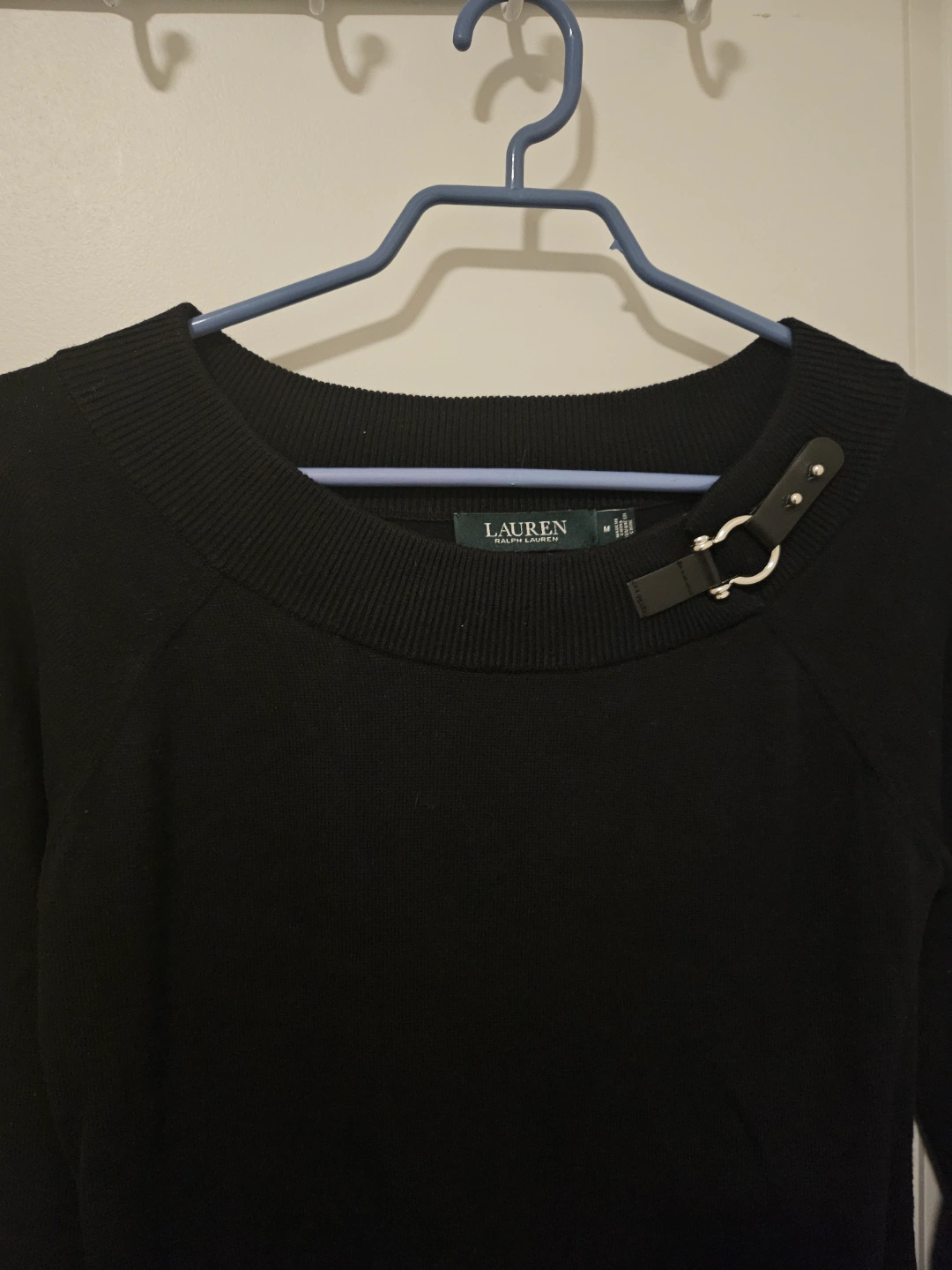 Black sweater, size medium. Features a unique shoulder detail. Long sleeves, round neckline. Soft material.