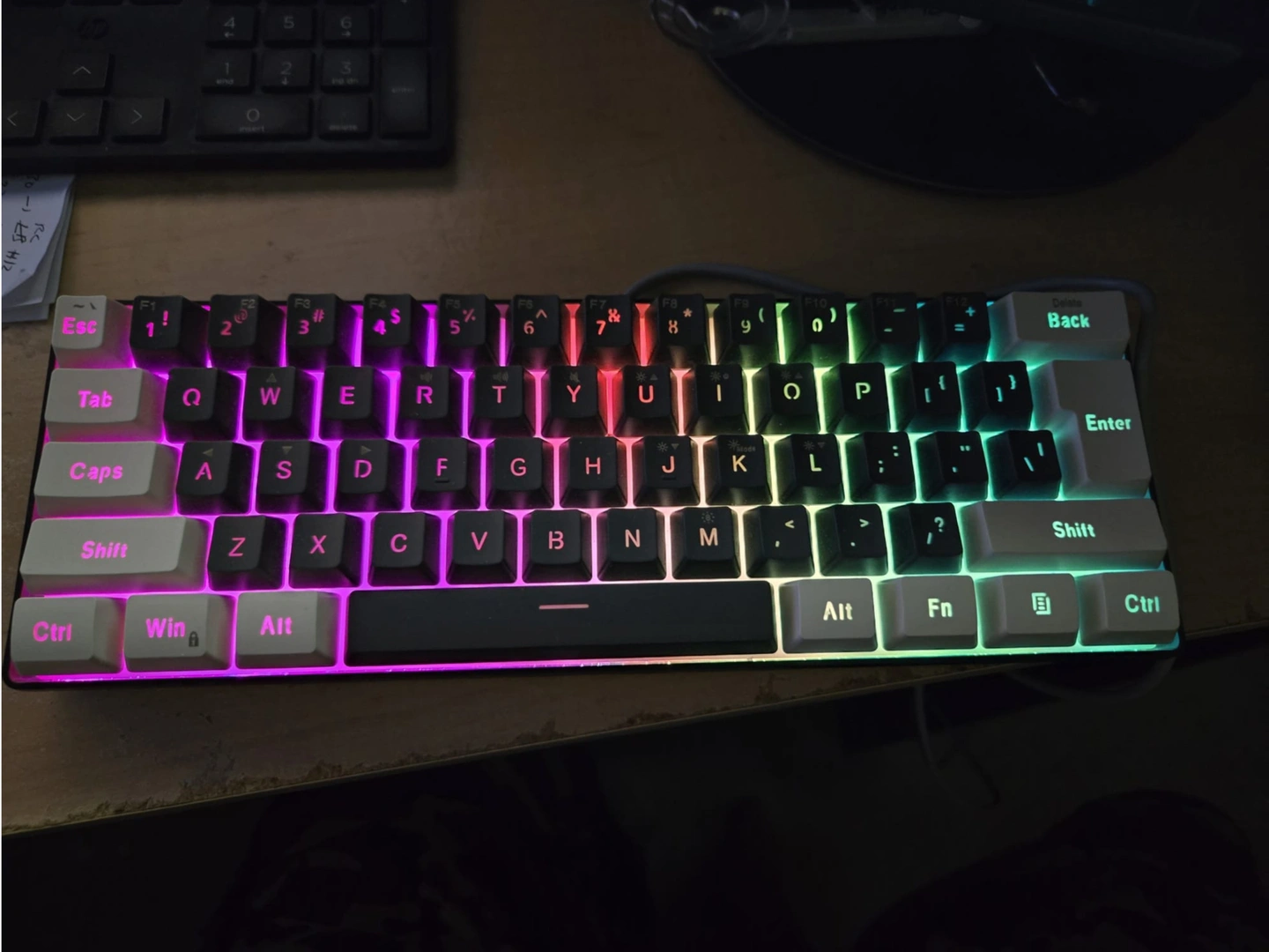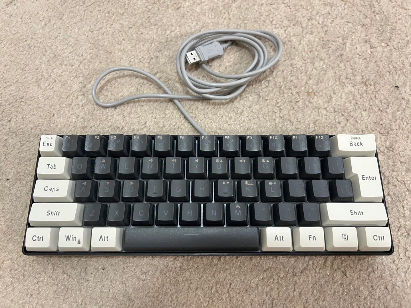 61-key mechanical keyboard. RGB backlit. USB wired connection. Compact design. Black and white keycaps.