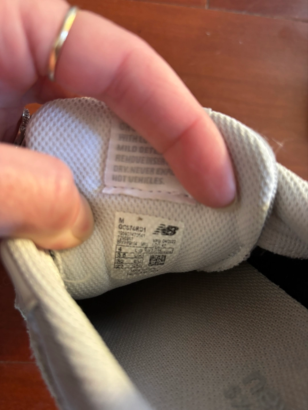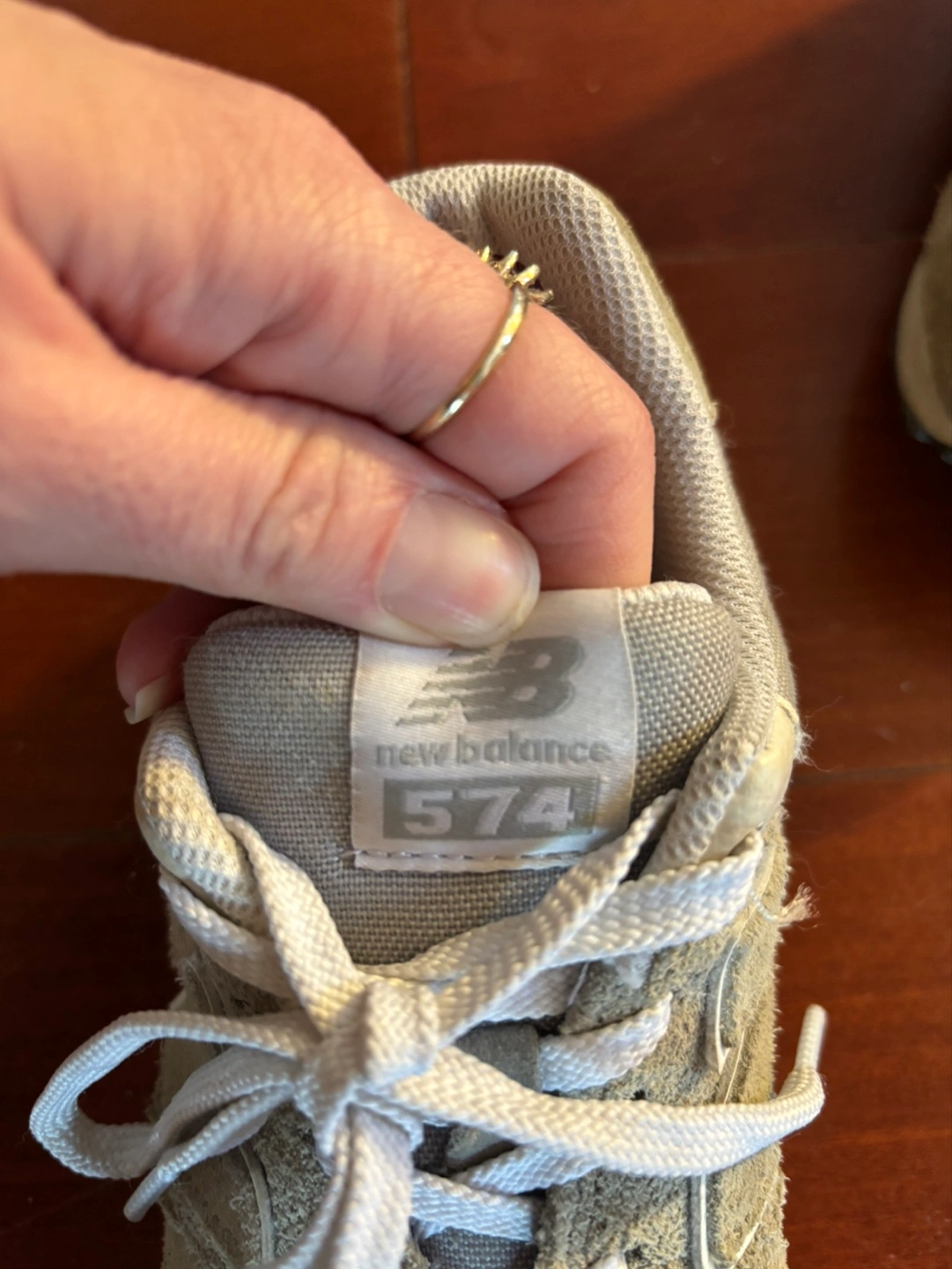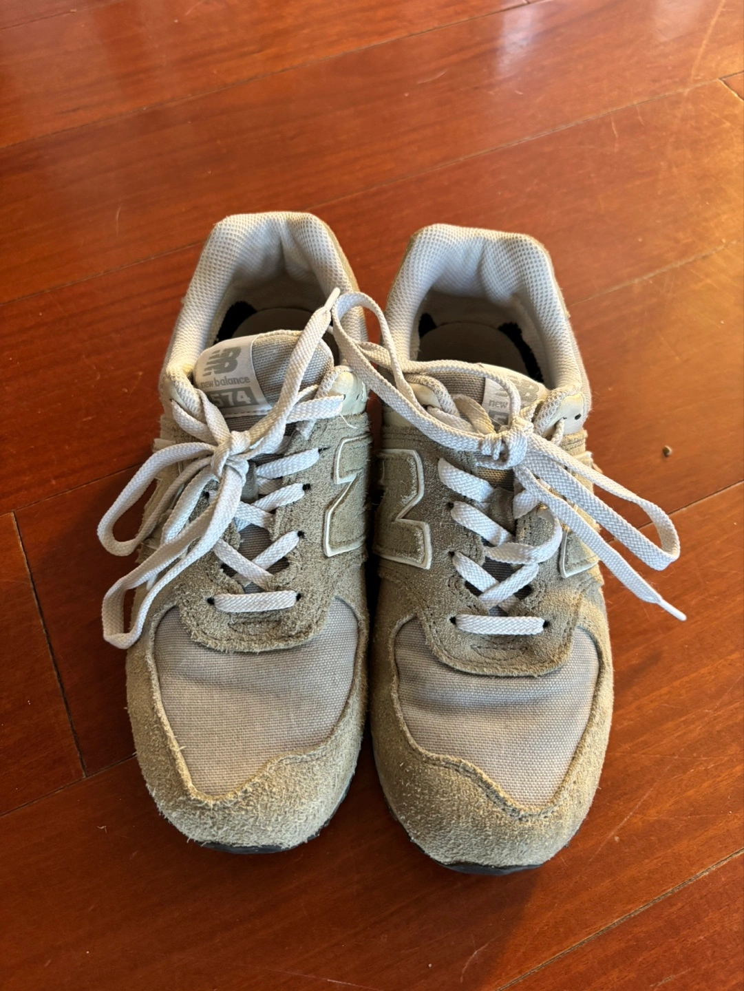 Women's New Balance 574 sneakers. Beige suede upper. White laces. Pre-owned condition.