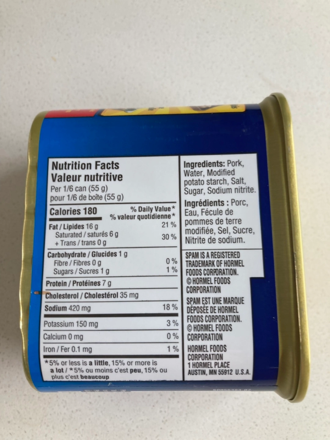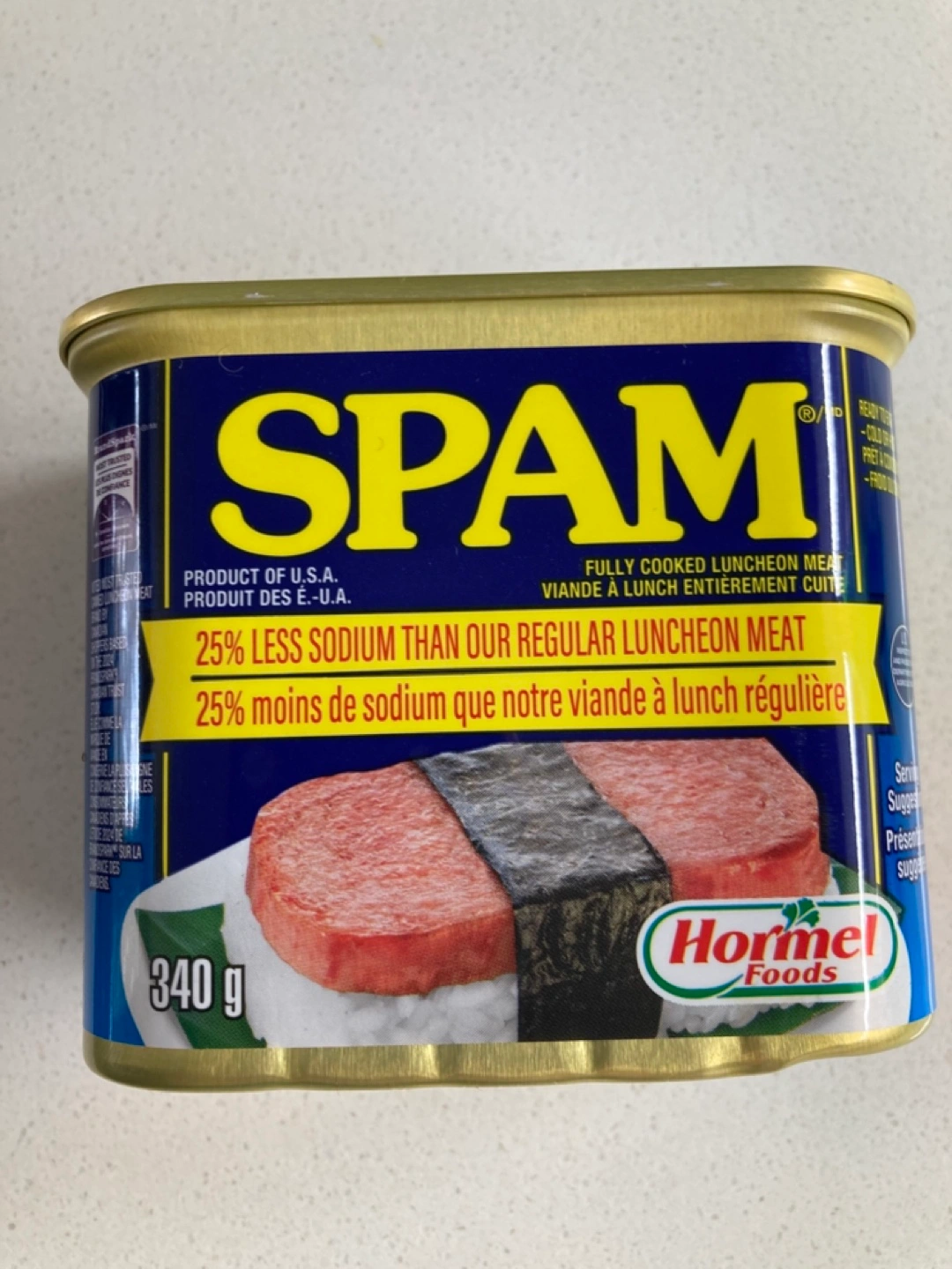 340g can of Spam luncheon meat. 25% less sodium than regular Spam. Fully cooked. Product of the U.S.A. Expiry 2029. Available for pickup, or I can also meet downtown as needed. 🌺Please also check out my other items— I love to bundle! 🥰