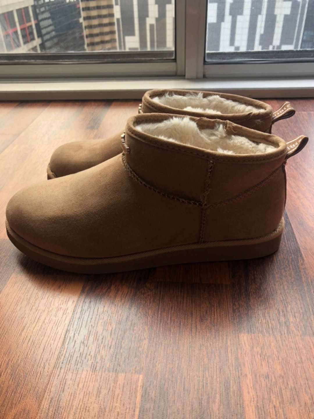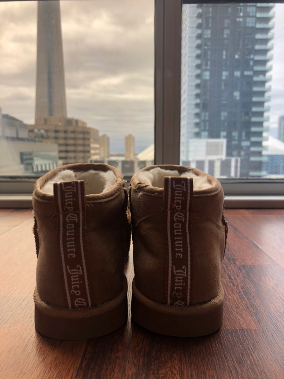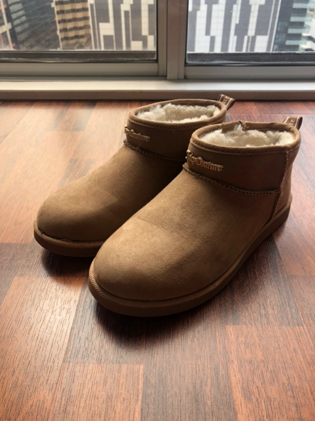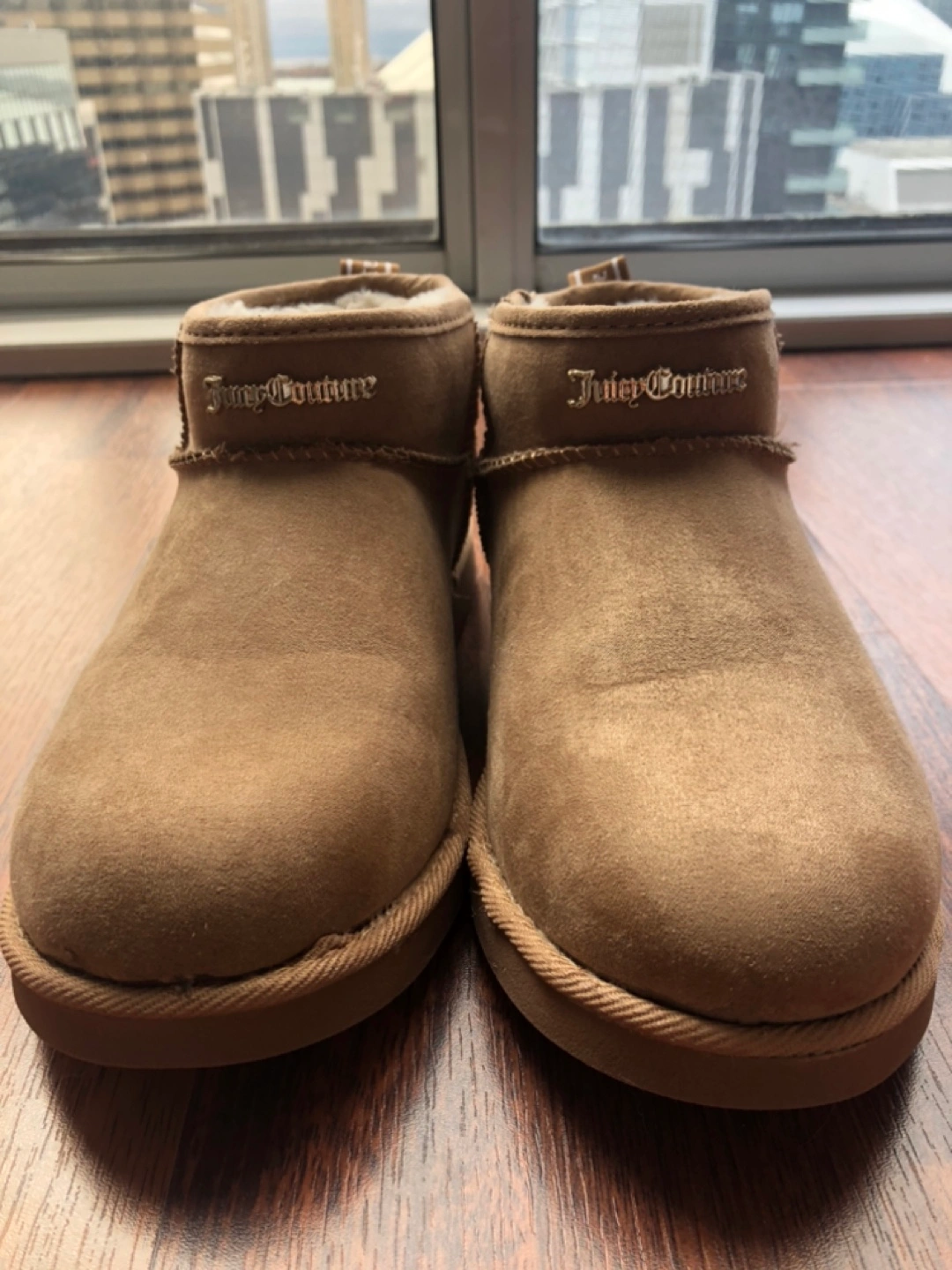 Pair of women's Juicy Couture ankle boots. Brown suede upper. Faux fur lining. Comfortable and stylish. Brand new.