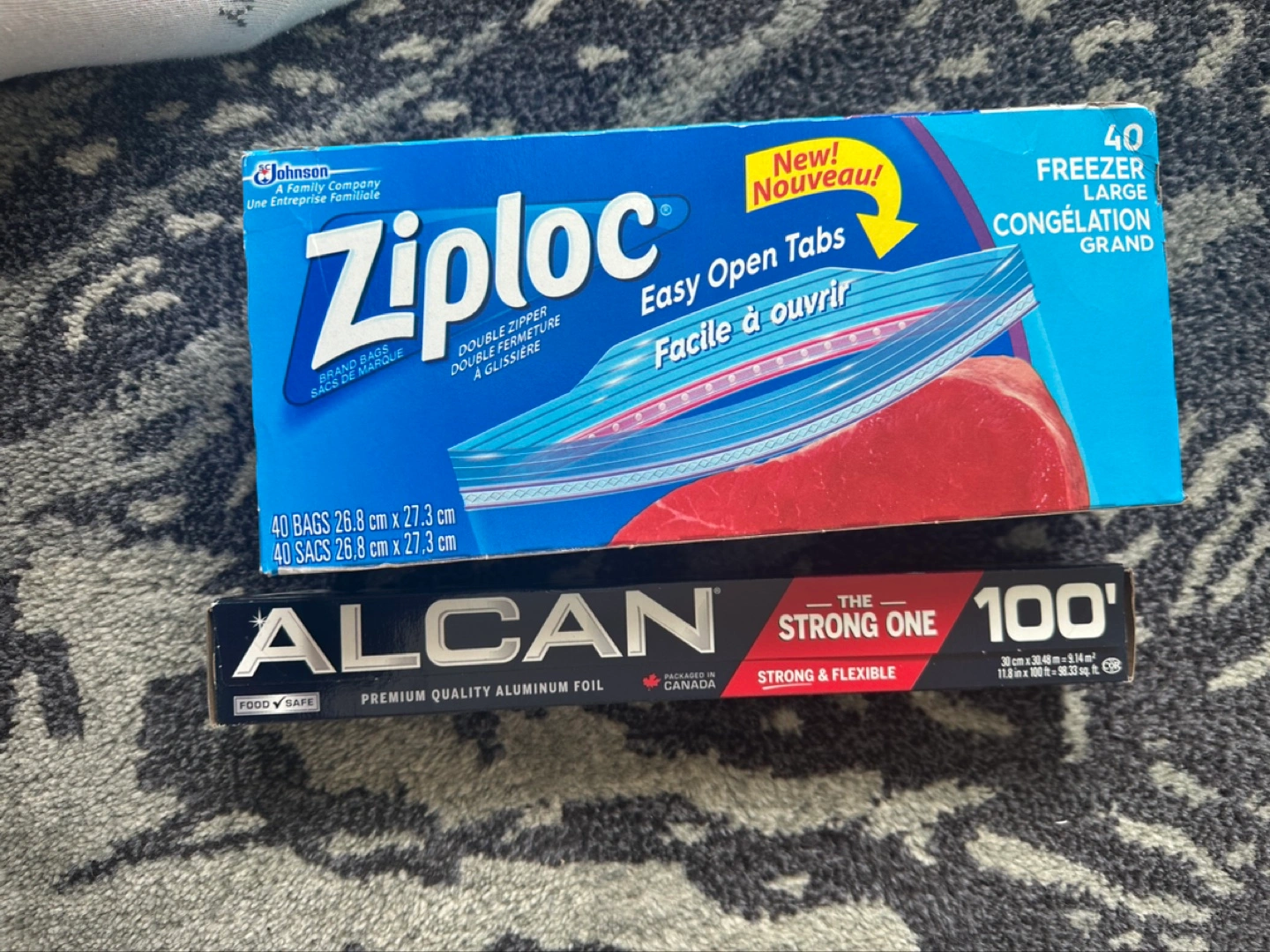 Bundle includes one box of Alcan premium quality aluminum foil and one box of Ziploc brand freezer bags. Both unopened / sealed just doing spring cleaning and I don’t use these products. The aluminum foil is retailing for 8.49 at no frills - https://www.nofrills.ca/en/foil-wrap-100-ft/p/20030018_EA Ziplocks probably values around 10.