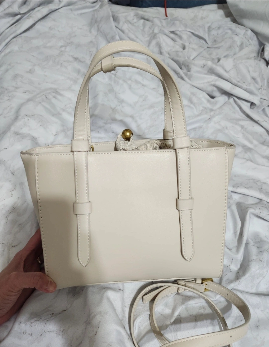 Adorable cream-coloured handbag. Features two top handles and a detachable shoulder strap. Interior drawstring closure. Gold-toned hardware. Used twice.