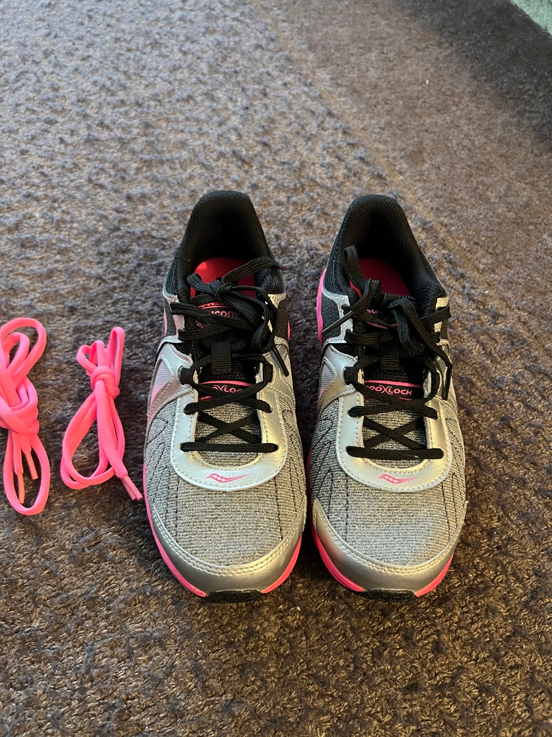 Girls' Saucony Kotaro running shoes. Size 3 1/2 medium. Silver, black, and pink colour scheme. New in box. Pink laces included. Firm price