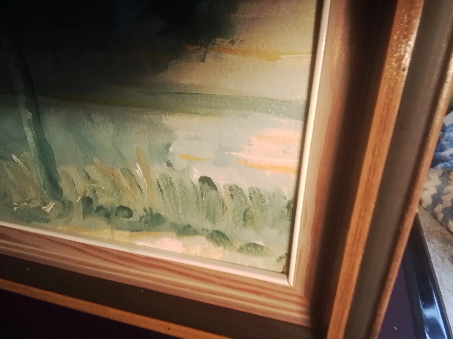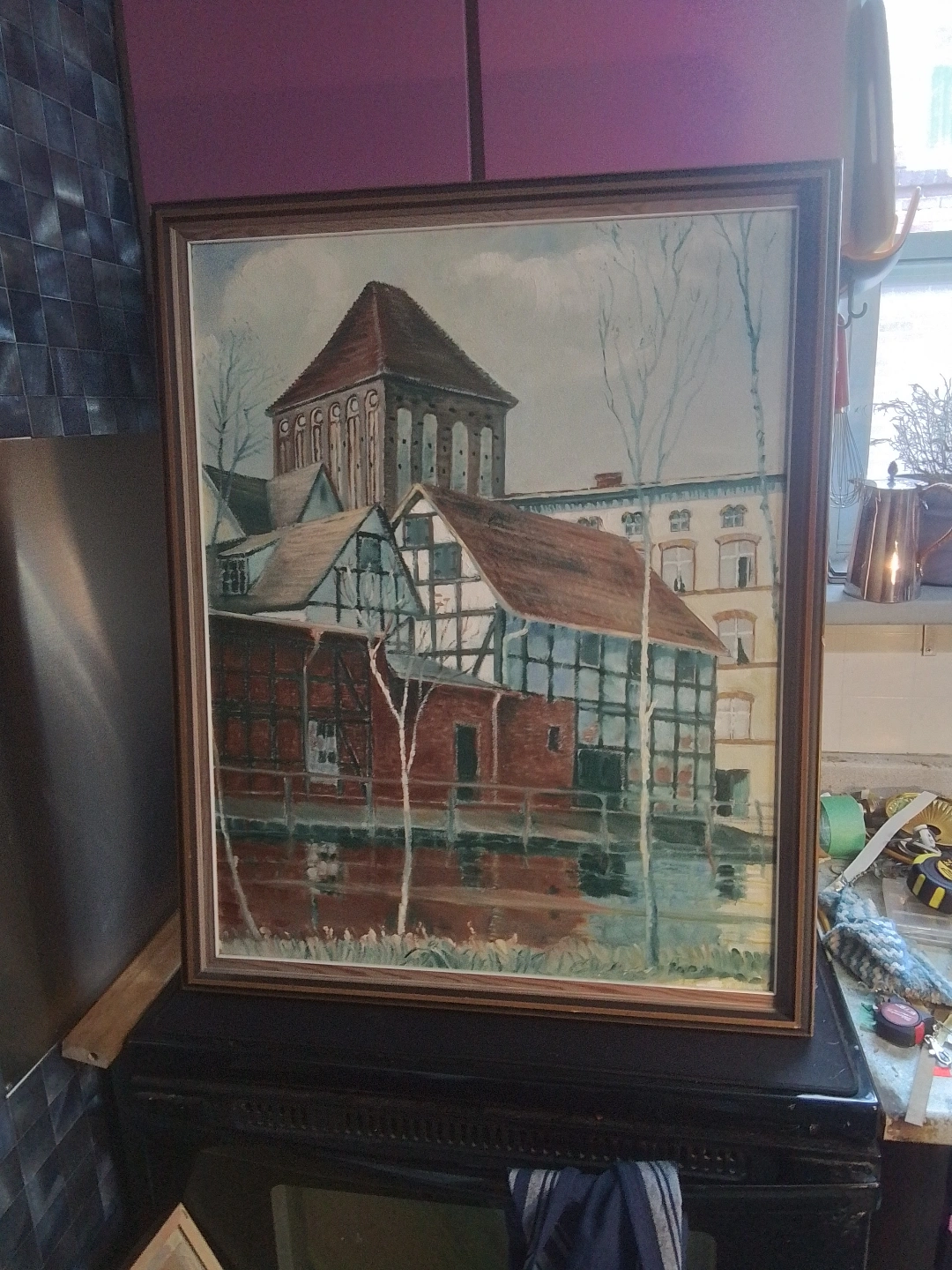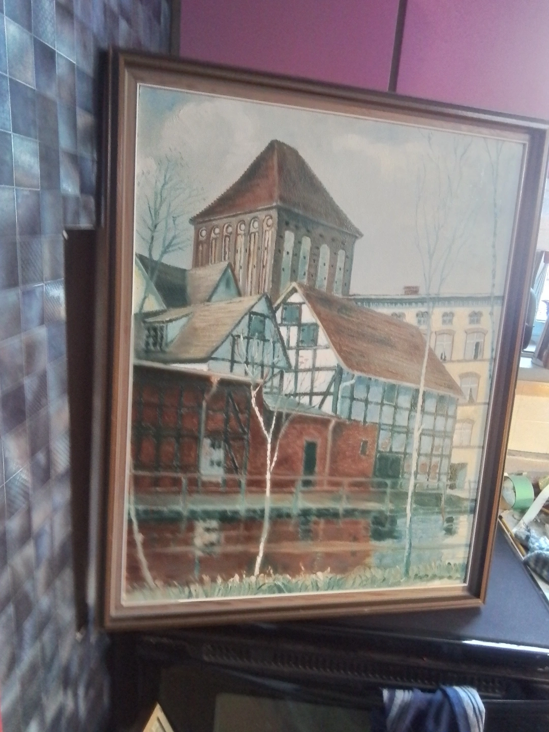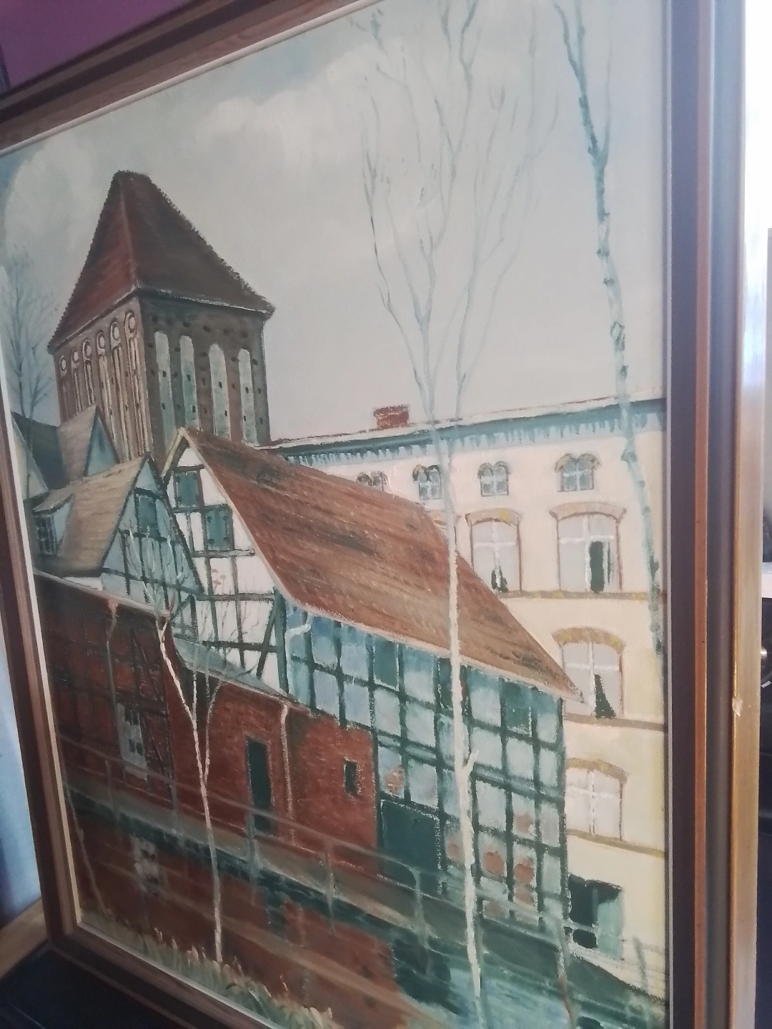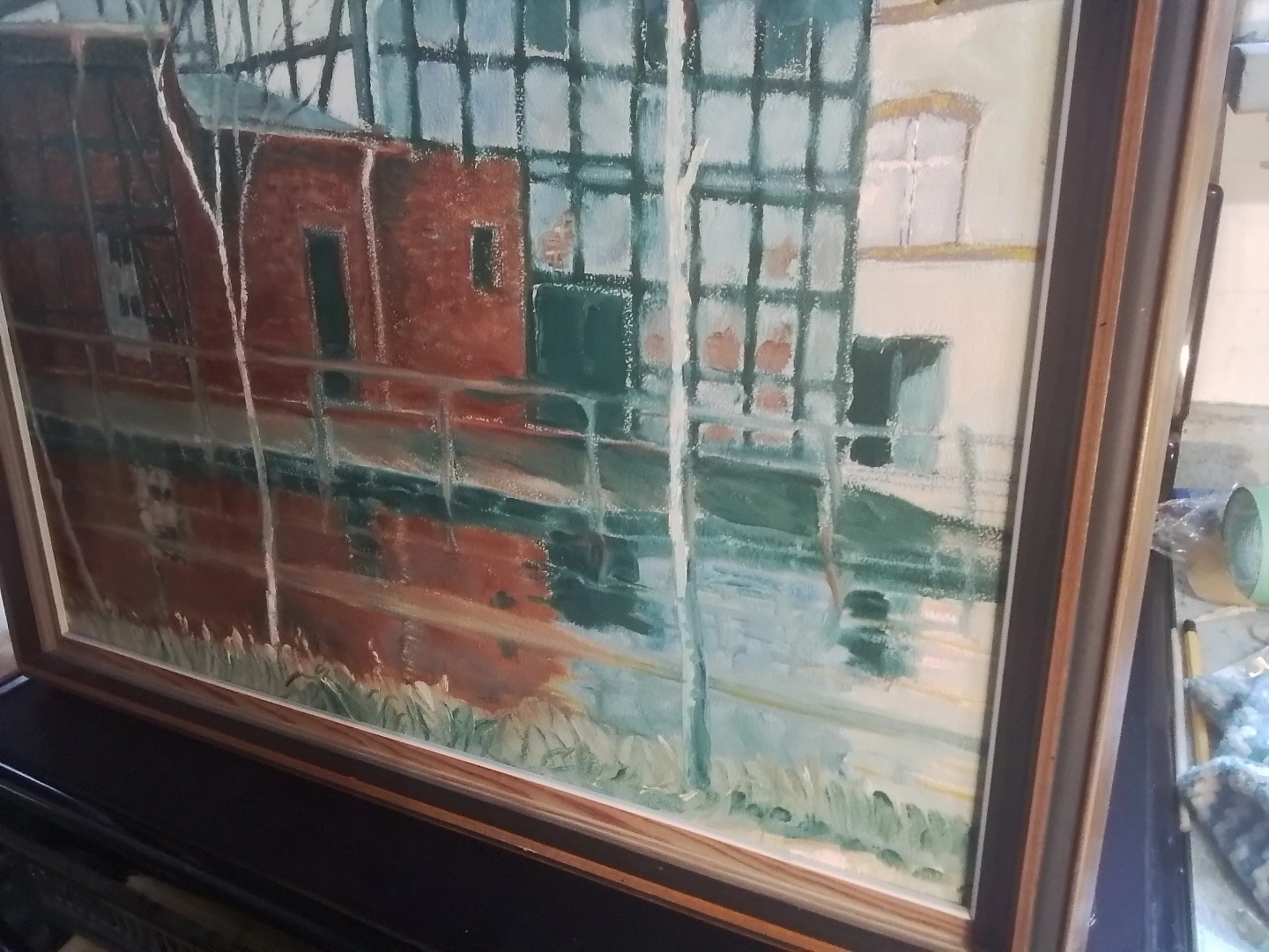 Vintage Framed Painting of European Village Original Framed Oil Painting This is a framed original painting that depicts a European village. It has a brown wood frame. The painting is signed. The painting is in good condition. Framed painting on board. Frame 34x27 Measurements: 30x23 Isn't it lovely? If the ad is still up, the item is still available! Large framed painting. Depicts a European village scene with buildings and a waterway. Wooden frame. Pickup at Young Street and Steels Ave