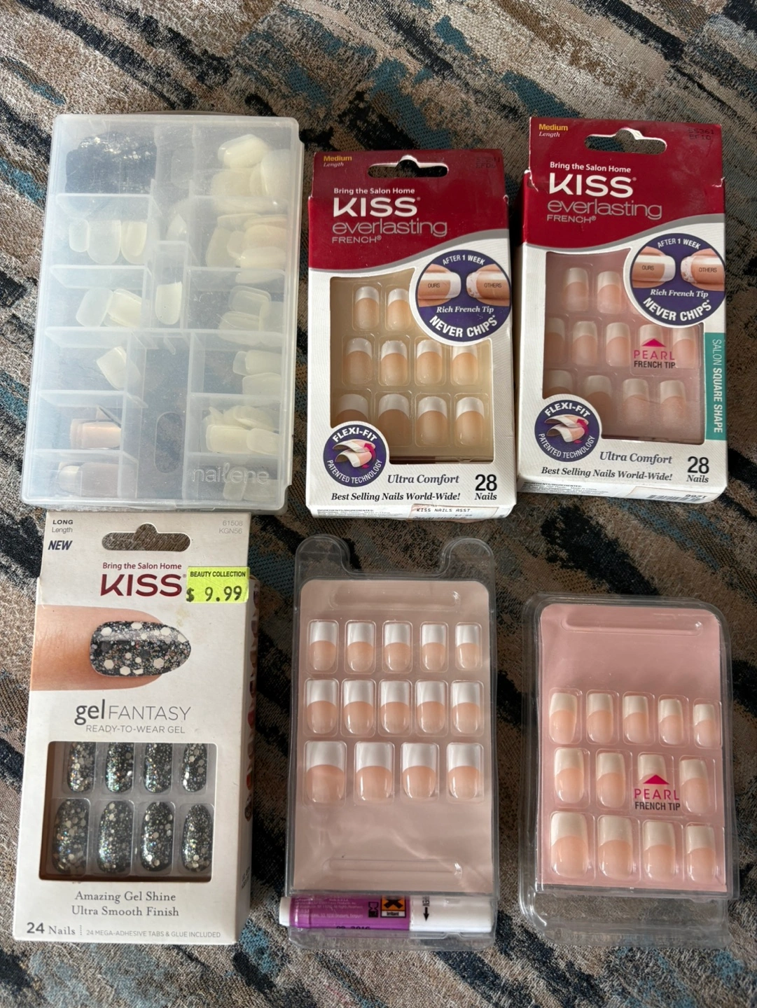 Bulk lot of KISS brand press-on nails. Includes various styles and colours. Some French manicures, some glitter. Several packages unopened. Great for variety! Price is for bundle