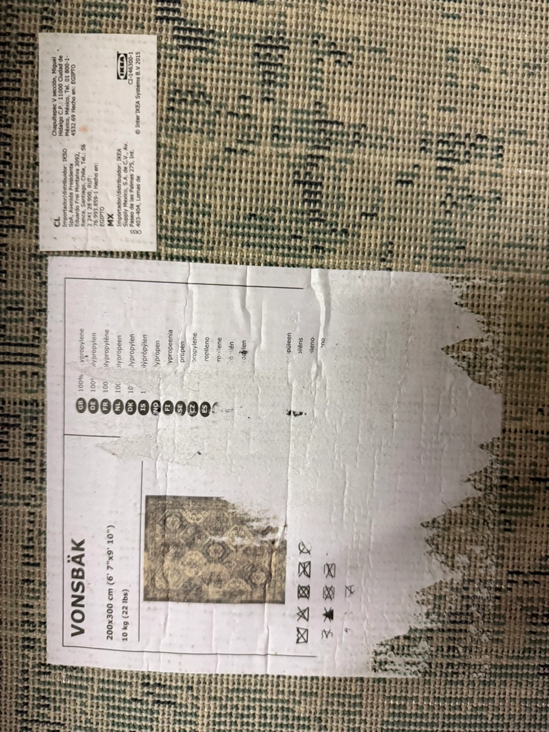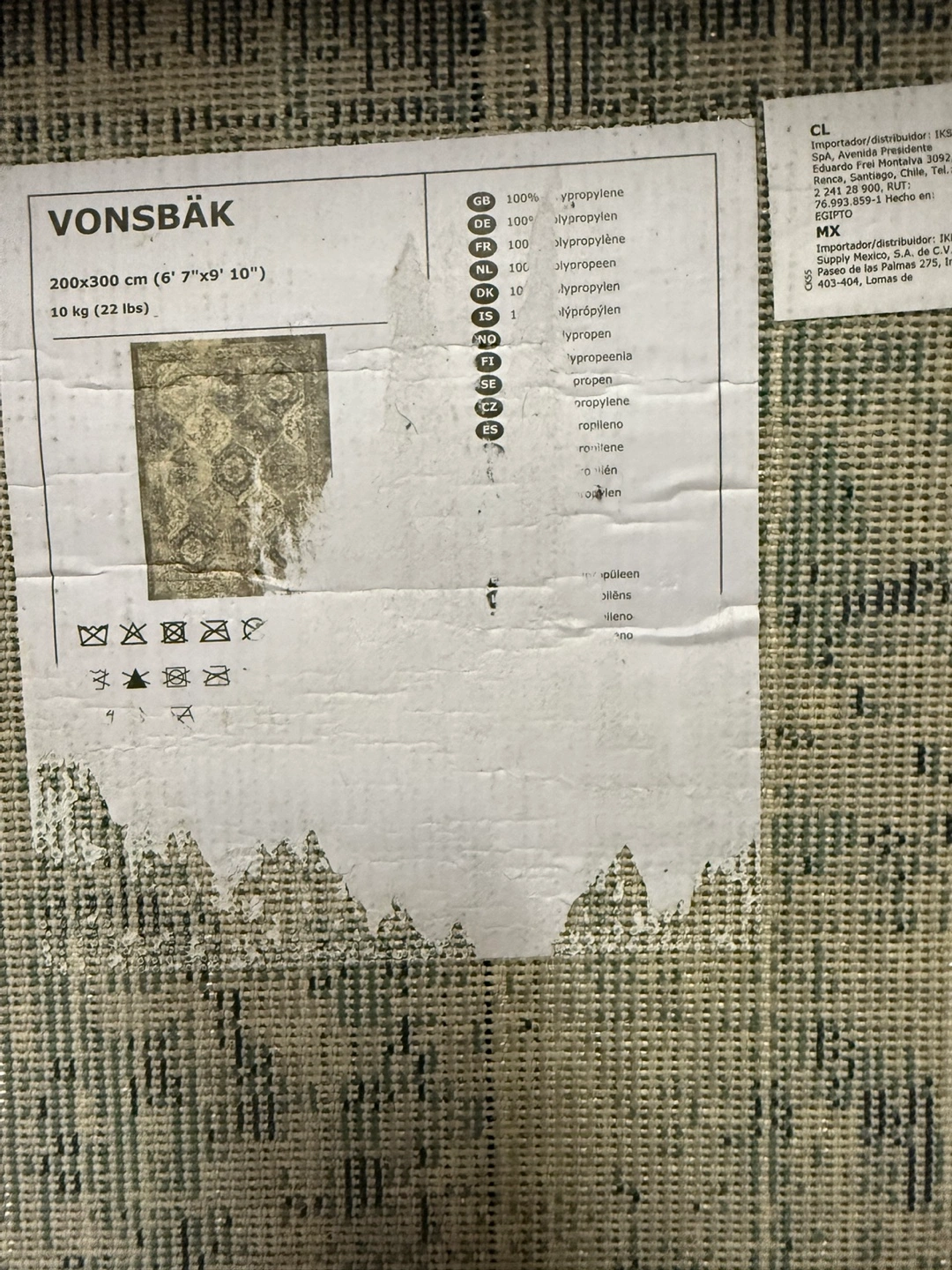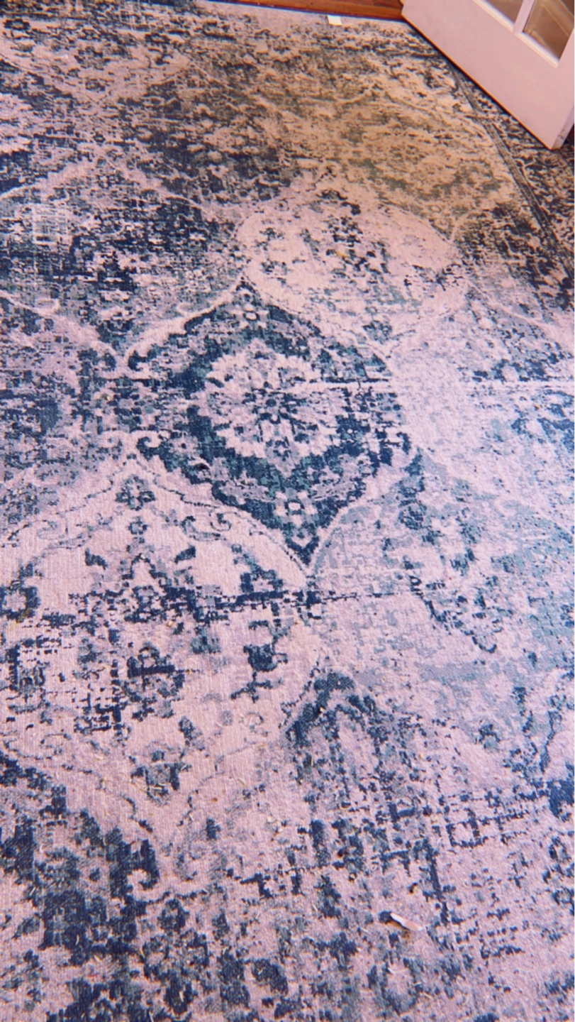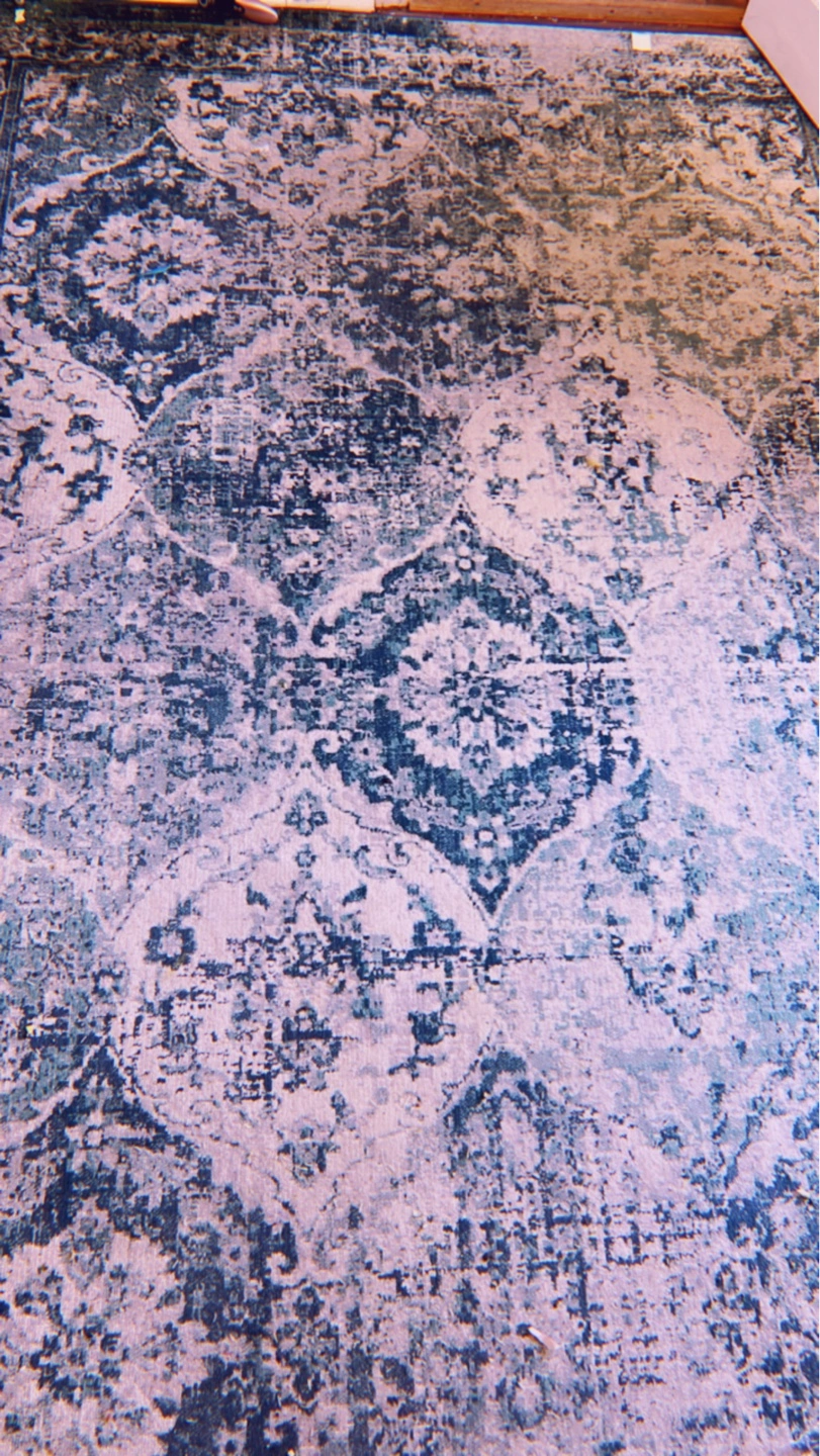 Lovely area rug, greyish-blue and white colour scheme. Features a repeating pattern. Soft and comfortable underfoot. Adds a touch of elegance to any room.