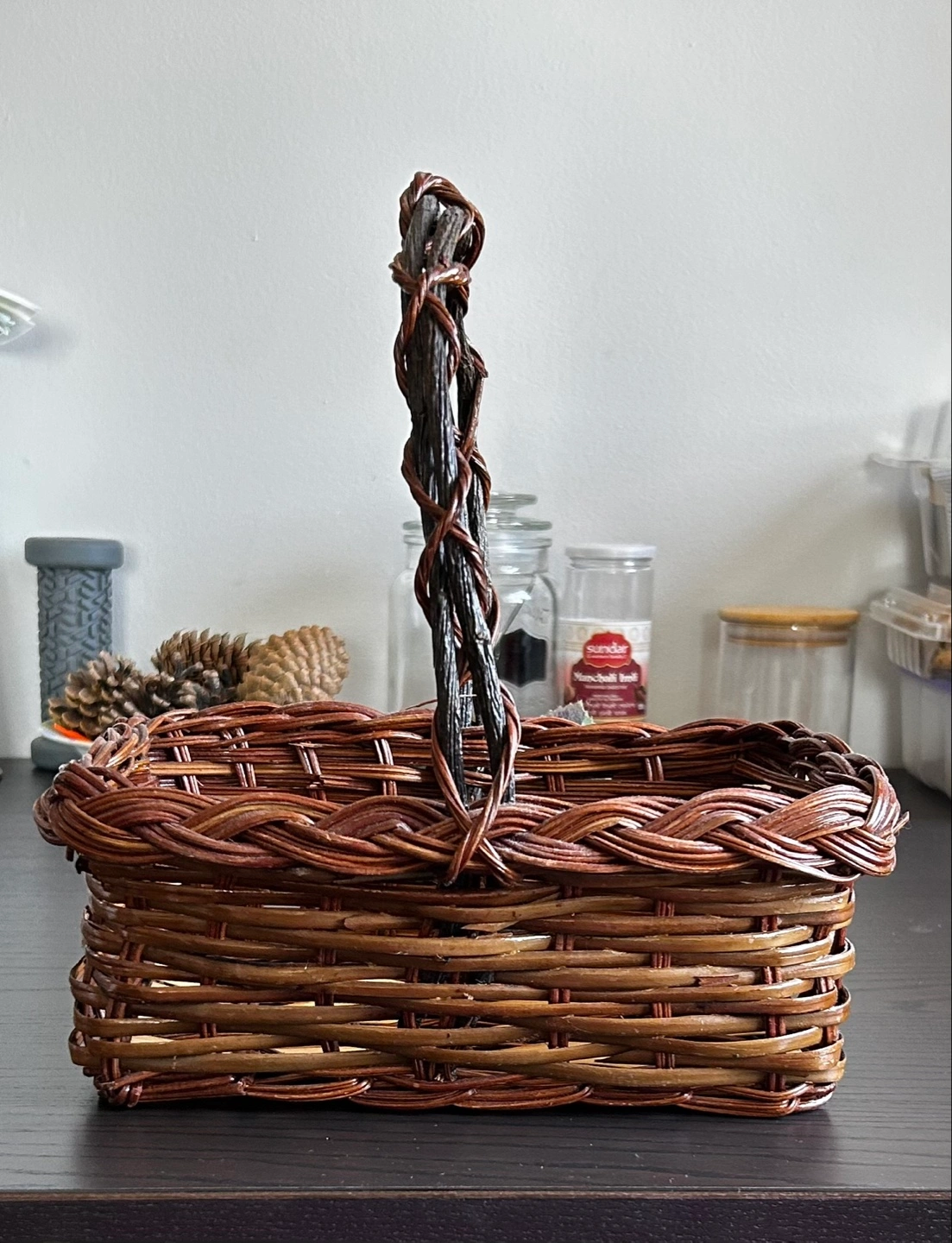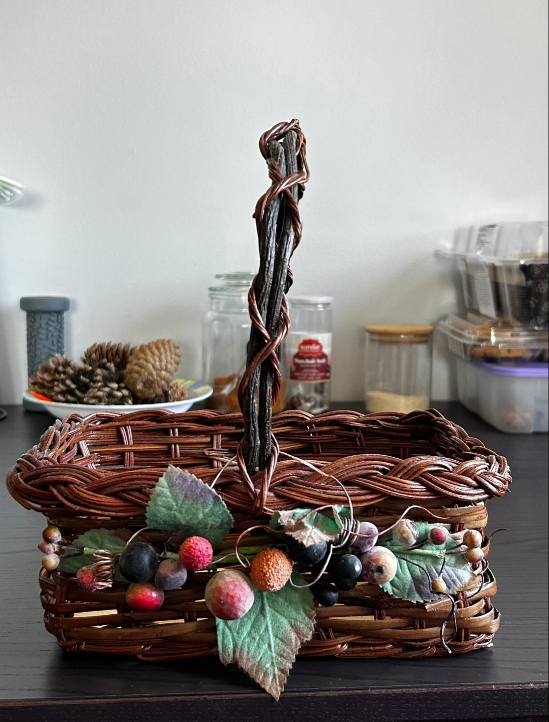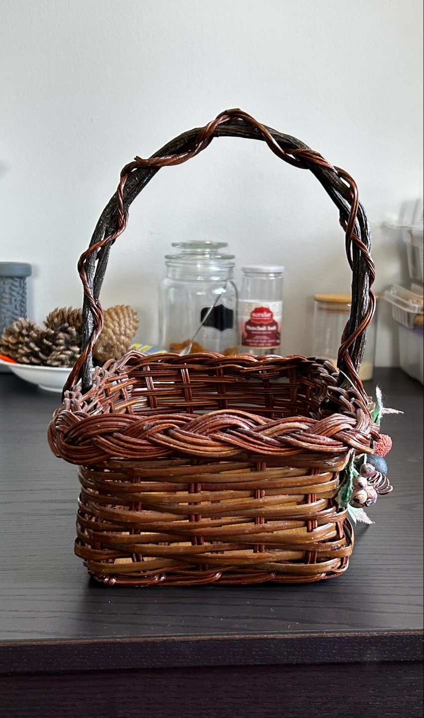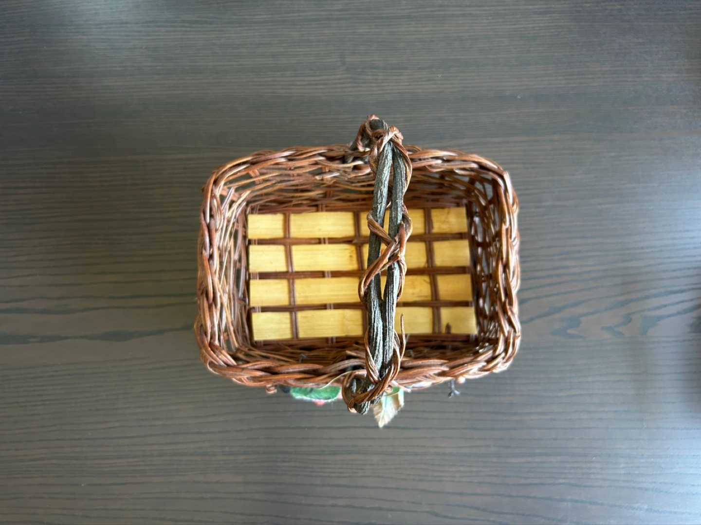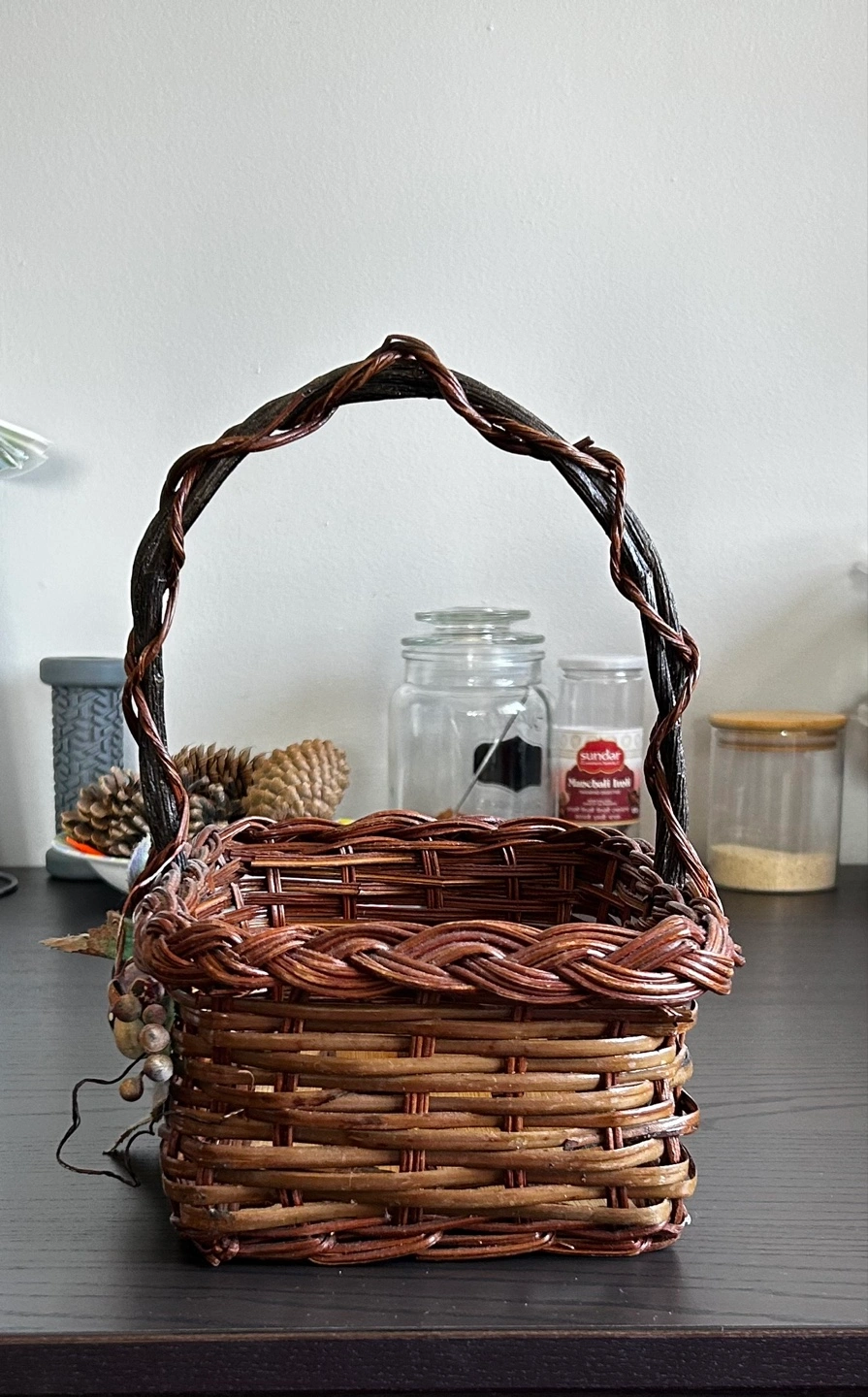 Small, rectangular-shaped basket. Features a woven willow design, twig handle, and decorative berry accents. Perfect for small gifts or home decor.