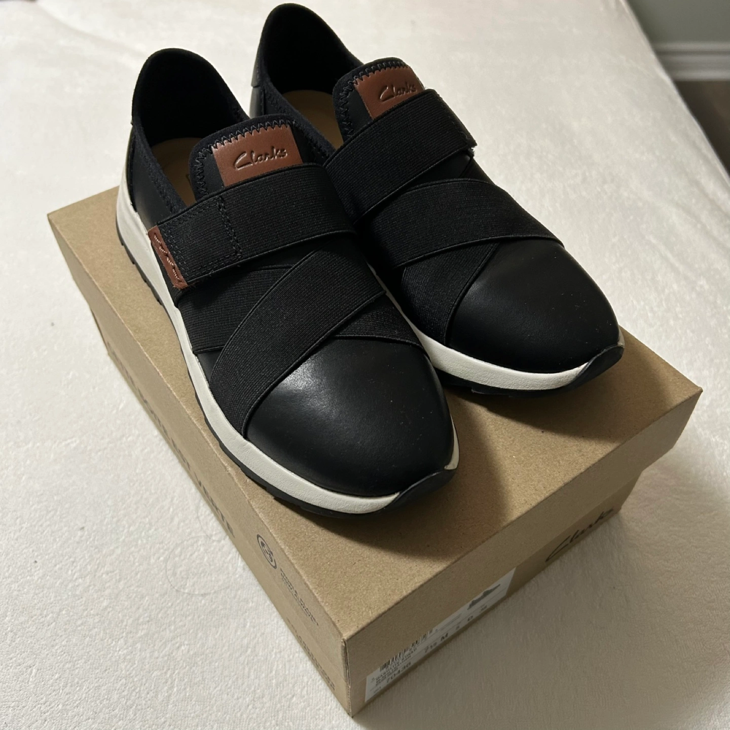 Black leather slip-on sneakers. Cross-over strap design with velcro. Plush in-sole and sturdy heel, ideal for arch support. Bought these to help with my plantar fasciitis, but too tight on me as I have wider feet. Used ONCE to commute back & forth from work (then replaced with work sandals). Originally $120 from Walking On A Cloud.