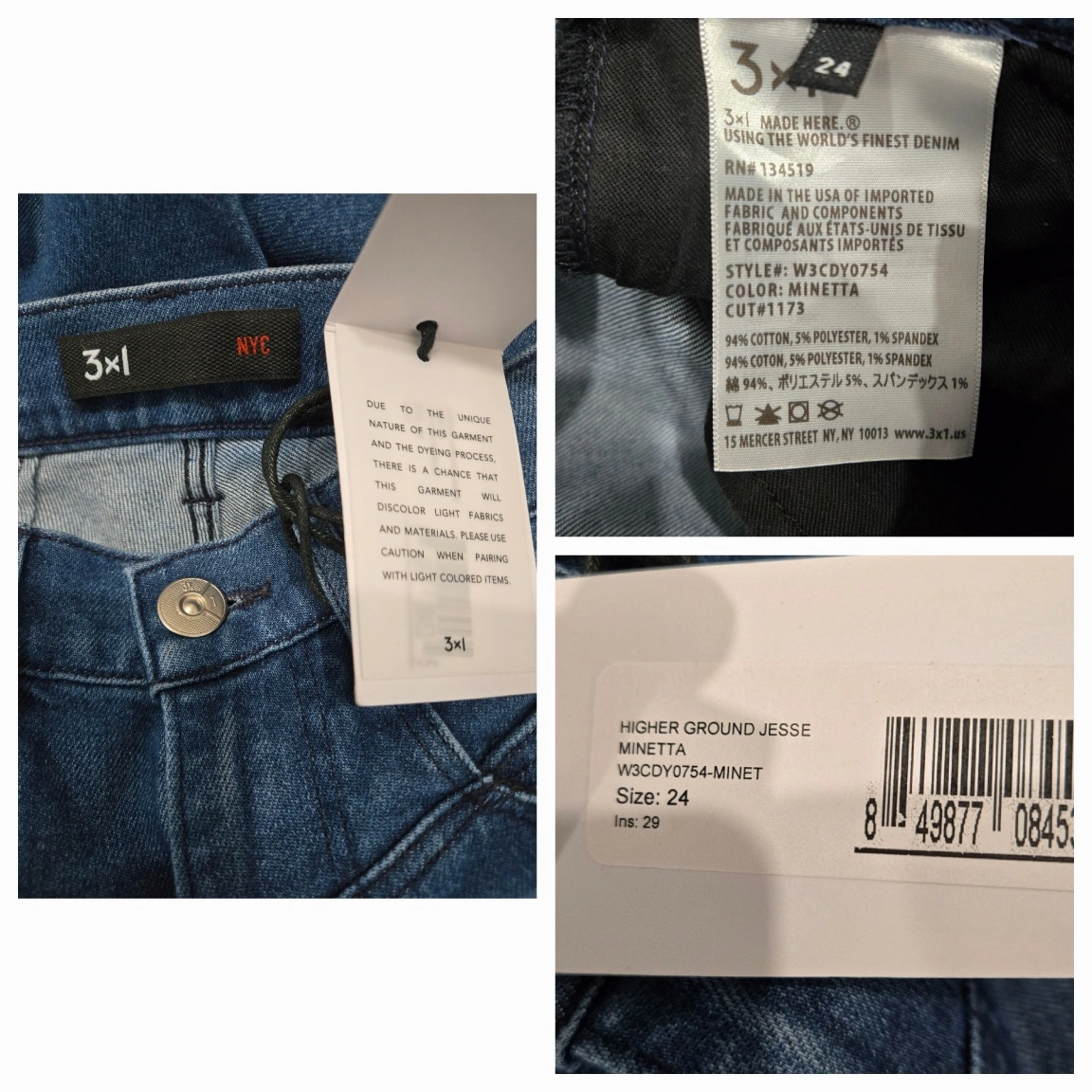 BNWT 3x1 NYC Higher Ground Jesse Minetta Jeans Size 24 Approximate full measurements are shown in the picture. Condition: BNWT Fabric: 94% cotton, 5% polyester, 1% spandex Slim to skinny leg opening High rise Four pockets with belt loops Zip fly with button fastening Stretch and flexible Made In USA Original Retail Price: $275 USD (approximately $444 CAD including taxes at the current exchange rate) Pick Up : North York Finch Subway Station Or Near Downtown Subway Line or Near Queen East and Logan Update : If you are a Downtowner (especially in the Queen East area) and need or want to try on items to make sure they fit, arrangements can be made to meet at my storage unit. You can also have a look at my other unlisted designer items at the same time. Bundle 3 or more items to receive discounts. Discount prices will vary depending on the items you bundle.