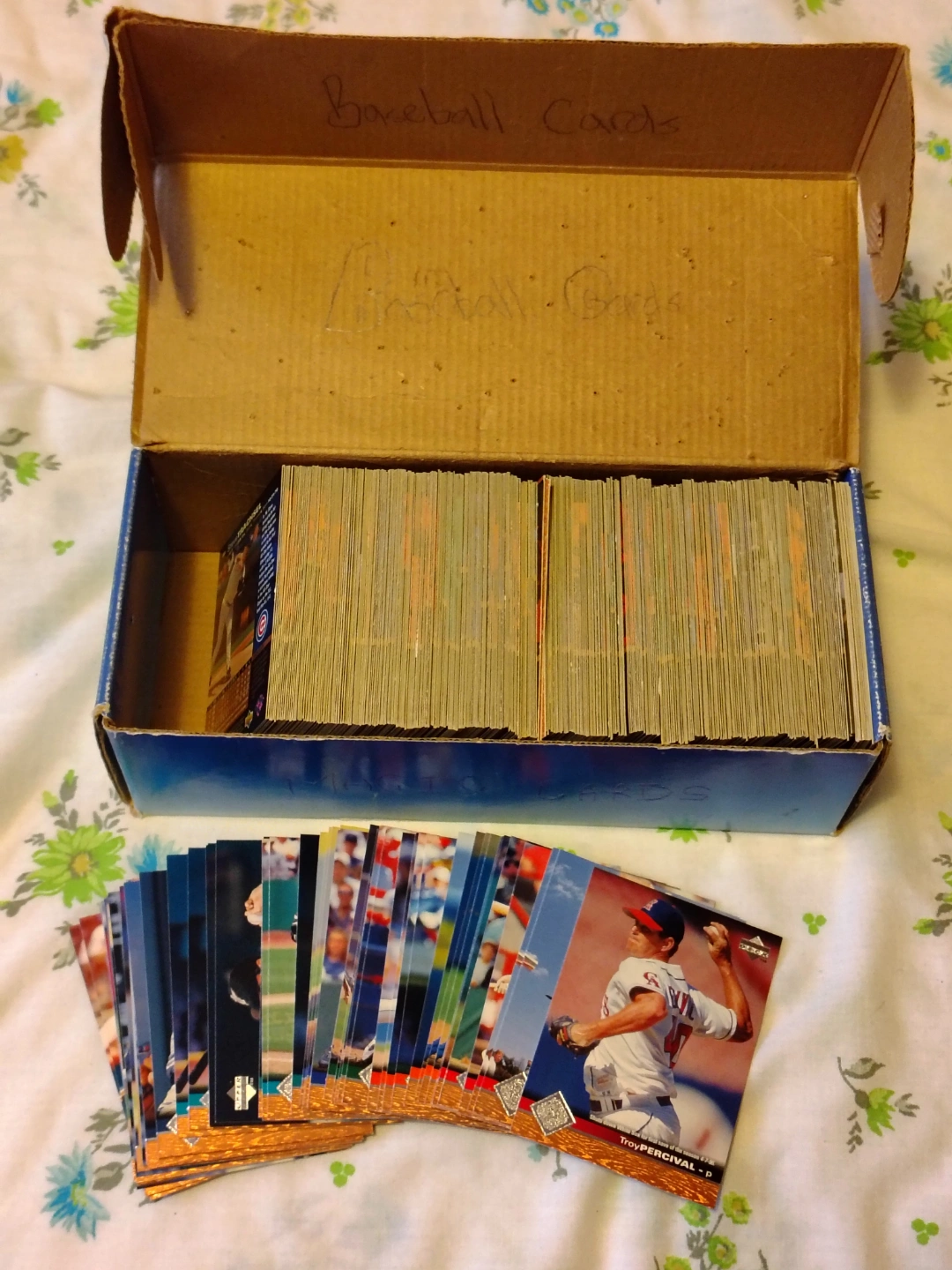 Collection of baseball cards. Mostly in a cardboard box, some loose. Appears to include 1997 Upper Deck cards. 1997 Upper Deck set Base and Inserts Pick up location Victoria park and Lawrence ave area All cards are in great condition