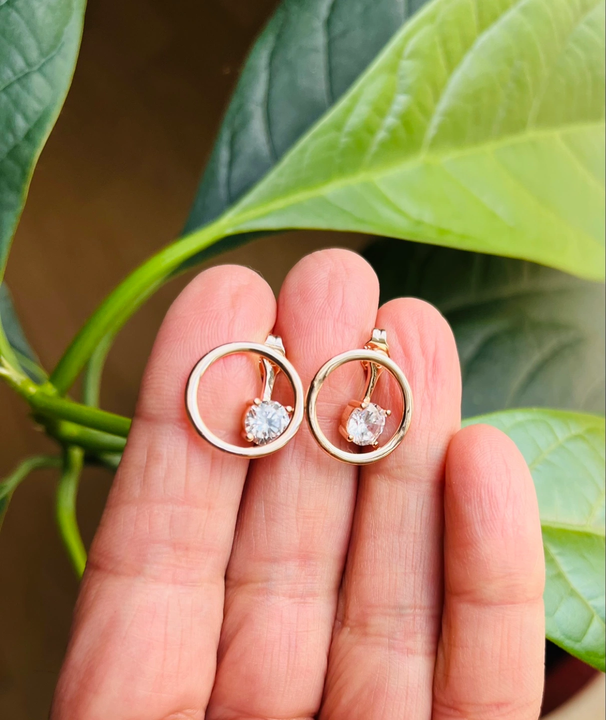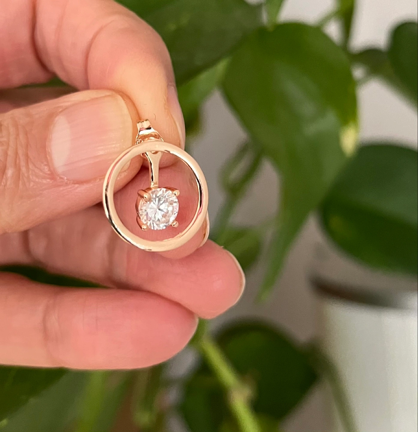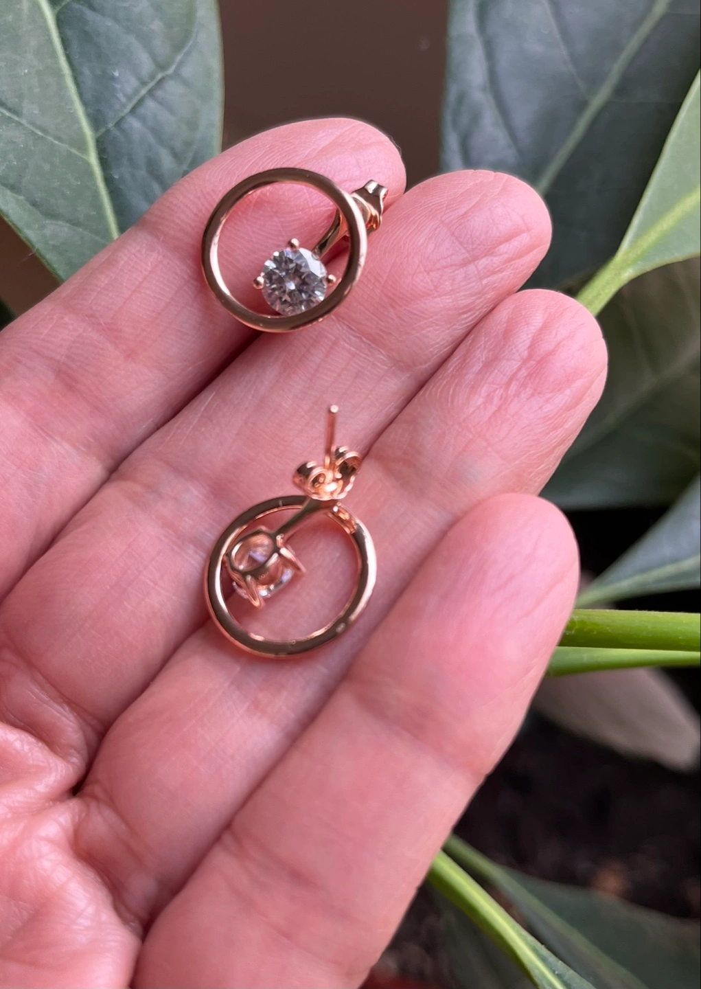 Elegant rose gold plated pendant and earring set. Features a small, clear stone in a circular setting. Minimalist design. Looks great with casual or formal wear. Pendant measures approximately 2cm.