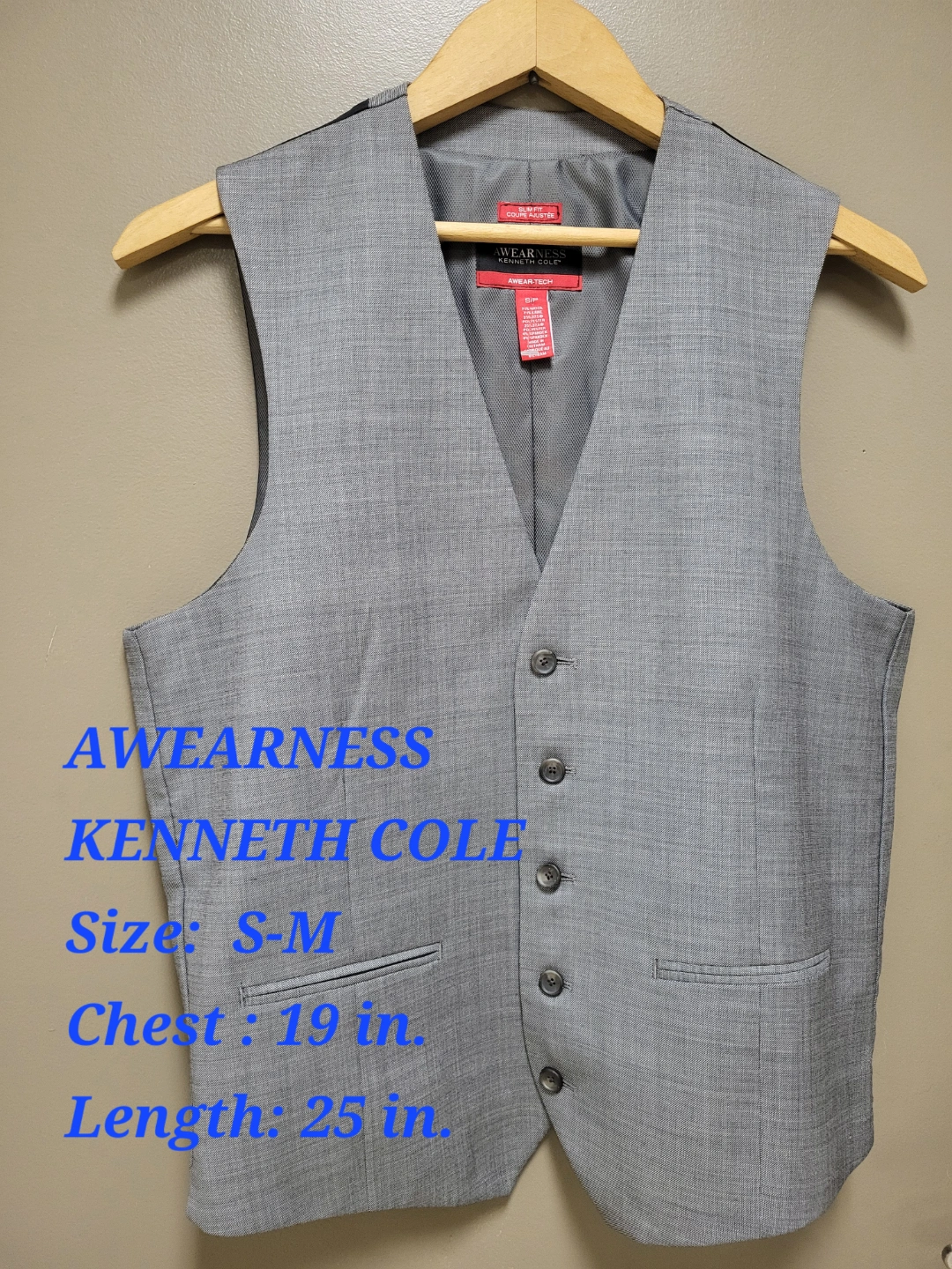 Kenneth Cole Reaction Men's Grey Suit Vest. Size S-M Men's grey vest. Slim fit. Size small-medium. 71% wool, 25% polyester, 4% spandex. Size Measures: 19 inches across the chest and 25 inches in length. Note: The original price is way more + Tax Here, Price is the lowest/firm to go away faster. If you like, please call/ text for a faster response. 647 855 6217 MEET UPS: 1. Tim Hortons at Jane Park Plaza 2. Any subway station from Kipling to young and Bloor NOTE: If u like, please see my other ad postings. like leather shoes, dress shirts,pants, jeans, Tennis/Squash Rackets, Exercise/Bike stuff, and more….. Mostly, brand name stuff is new or in the new condition to go away in about half price. Thanks for your time.