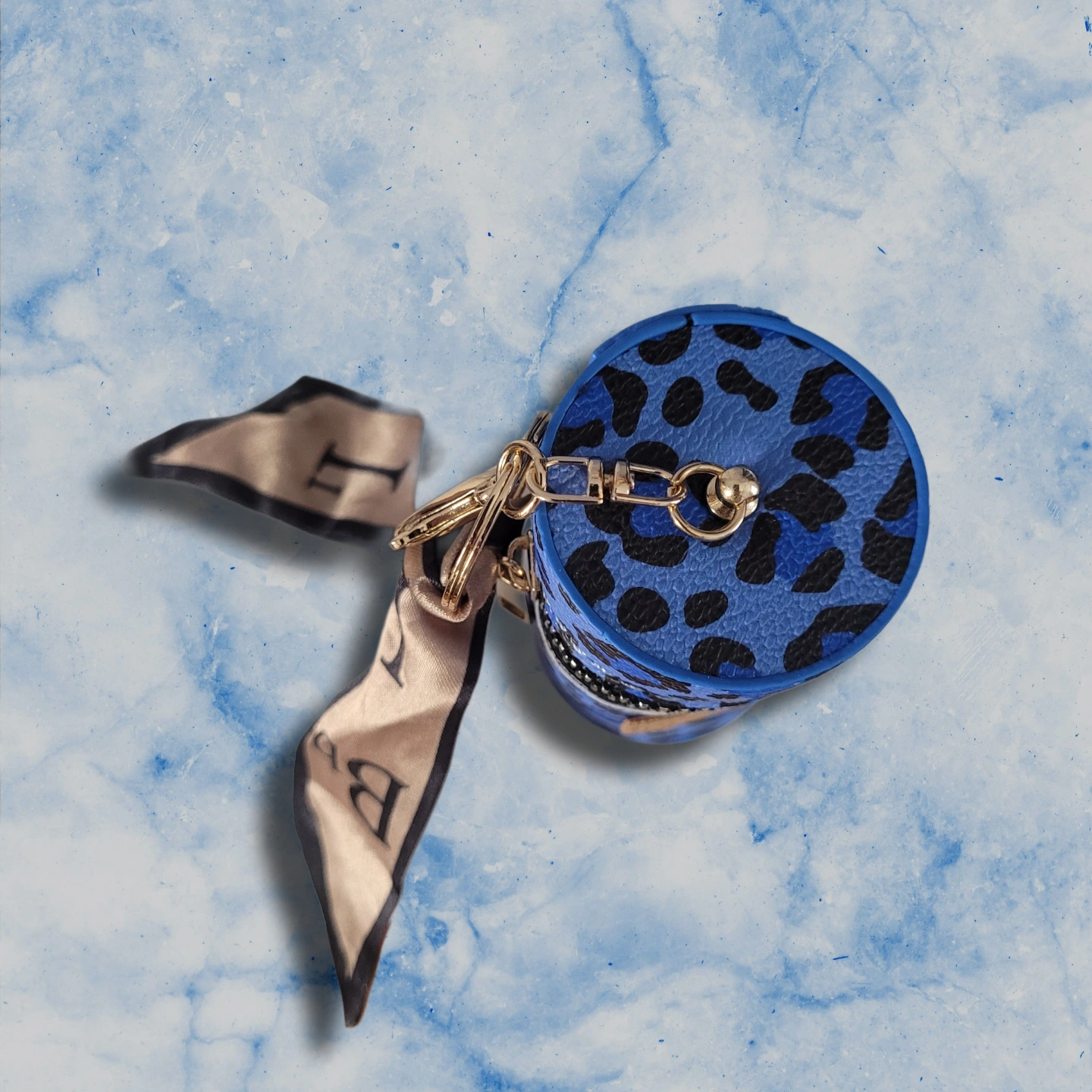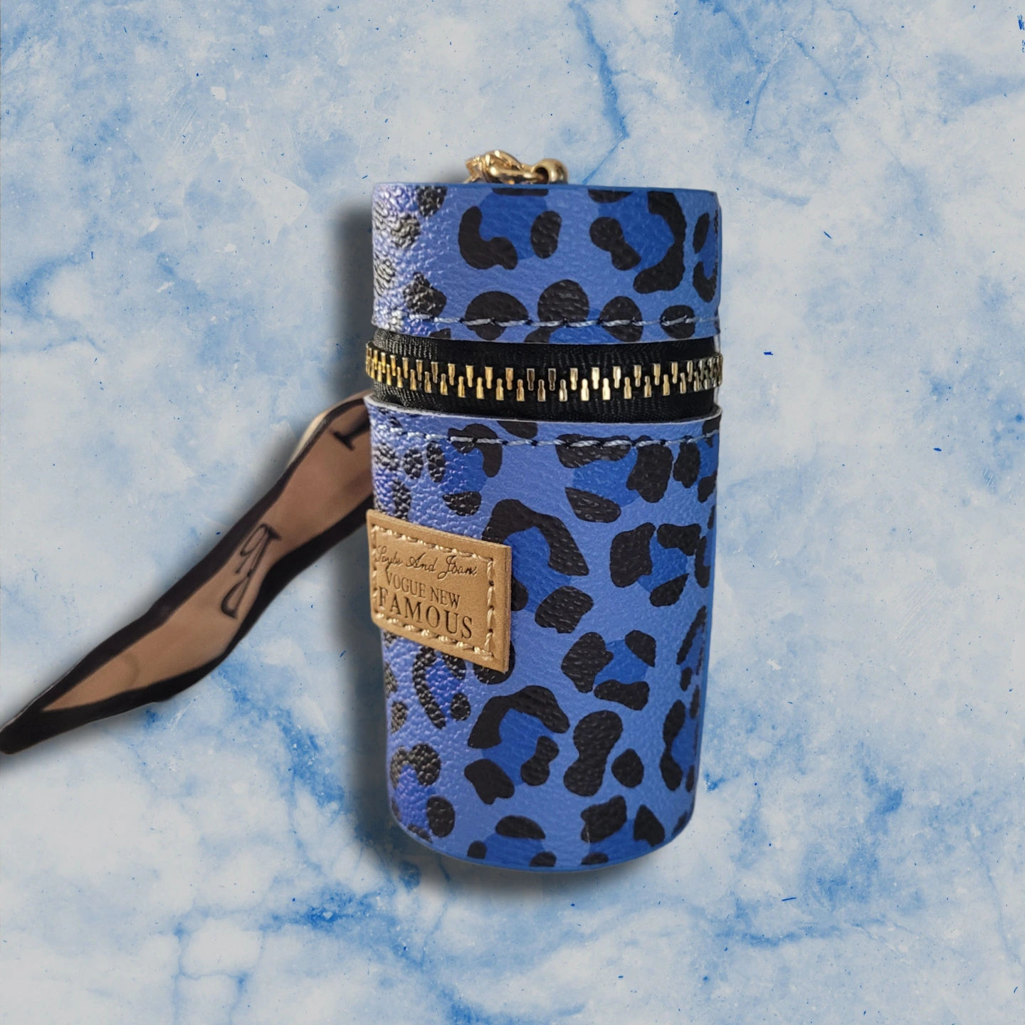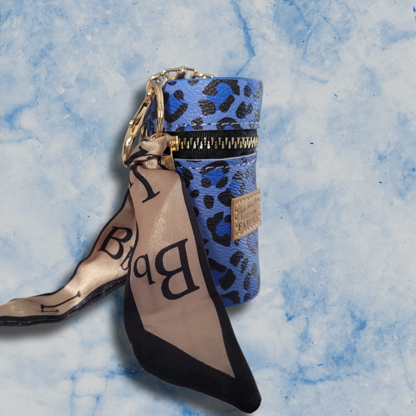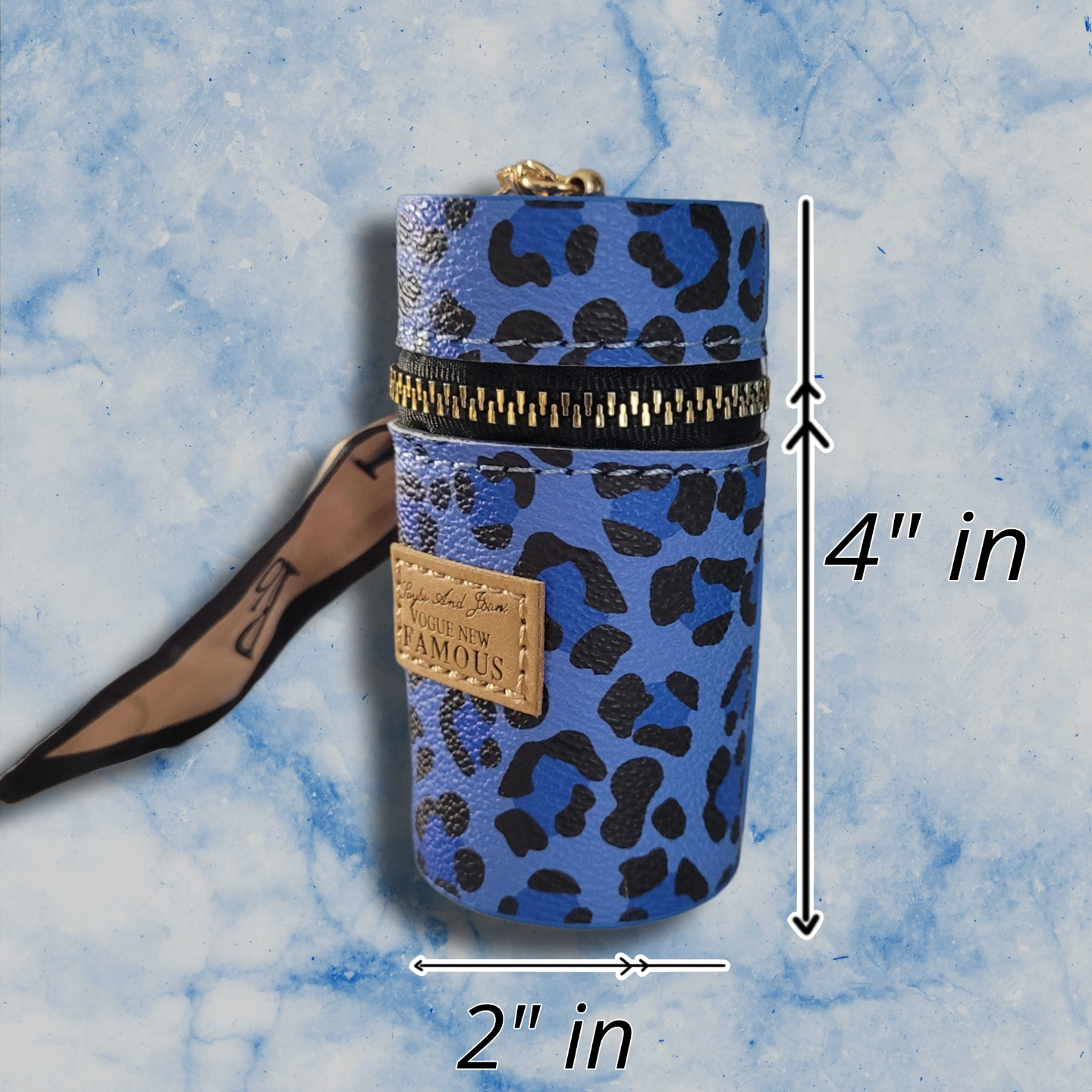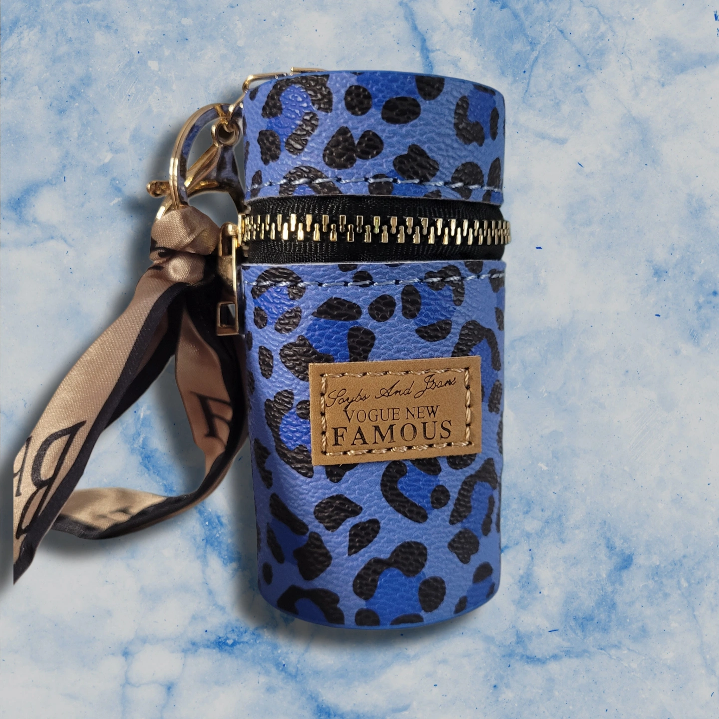 Embrace the essence of style with this small zippered pouch, showcasing a striking blue leopard print design and radiant gold-toned hardware. With its fabric accent and compact dimensions of approximately 4 inches tall and 2 inches in diameter, it's designed for versatility. Equipped with a key loop and lobster clasp, it effortlessly attaches to your belt loop, purse, tote bag, or backpack. Perfectly crafted to hold your essentials—credit cards, lipstick, cash, jewelry, keys, perfume, gum—this pouch is a statement of both practicality and individuality.