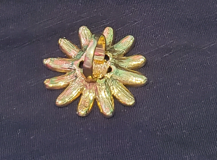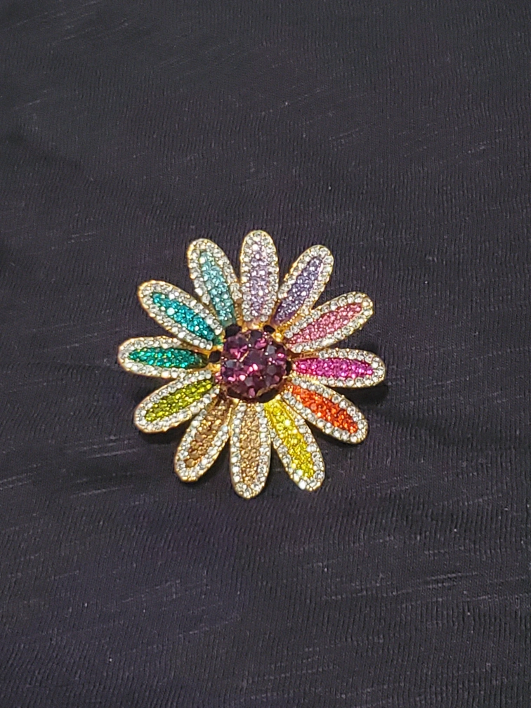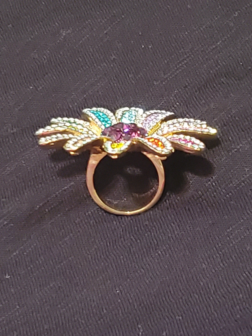 Large cocktail ring. Features a colourful flower design. Gold-toned band. Rhinestone accents. Unique piece.