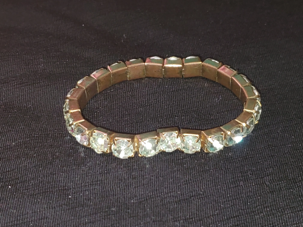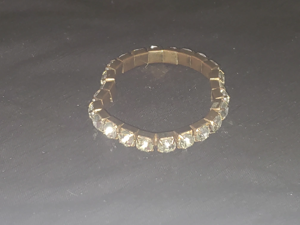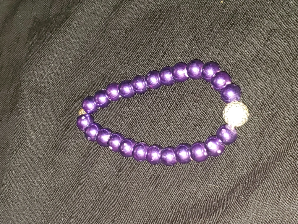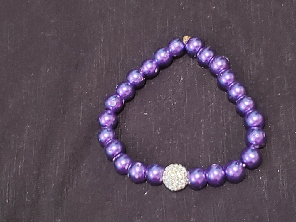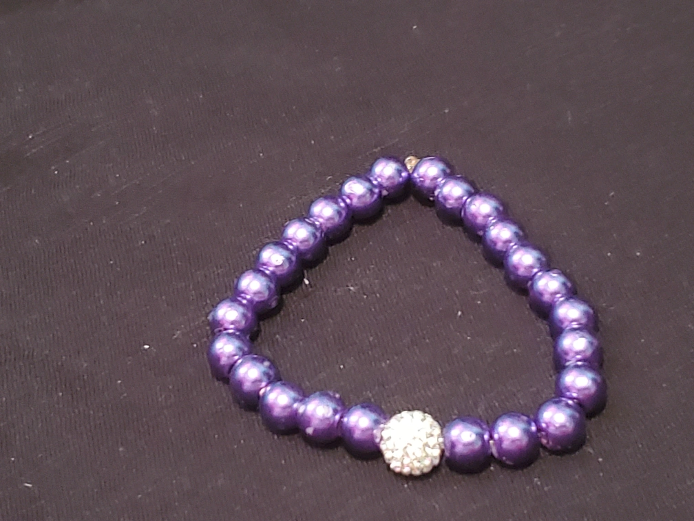 Assorter bracelets available. One features clear rhinestones on a gold-toned band. One features purple pearls with a rhinestone accent bead. One features a silver wrap around design All are stretchy bracelets. Different colours and styles also listed $1 each.