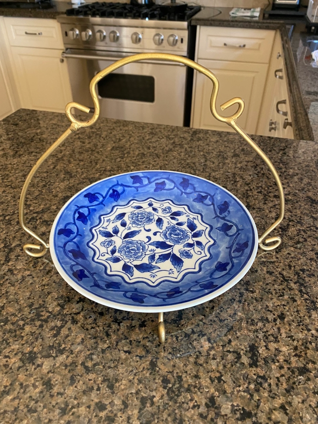 This is a Beautiful GANZ blue and white porcelain dish. Floral design. Gold-tone metal stand with a handle. Perfect for serving or display. 10 inches in diameter.