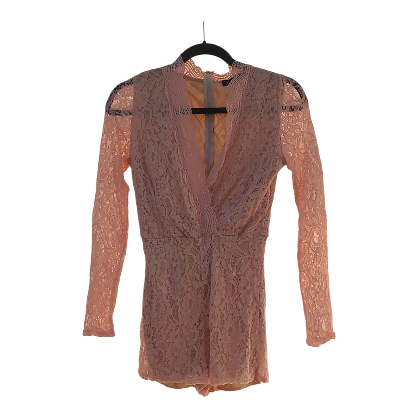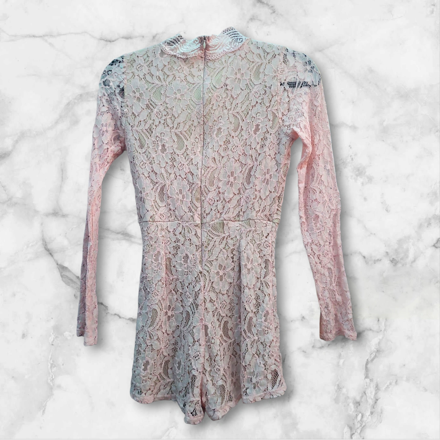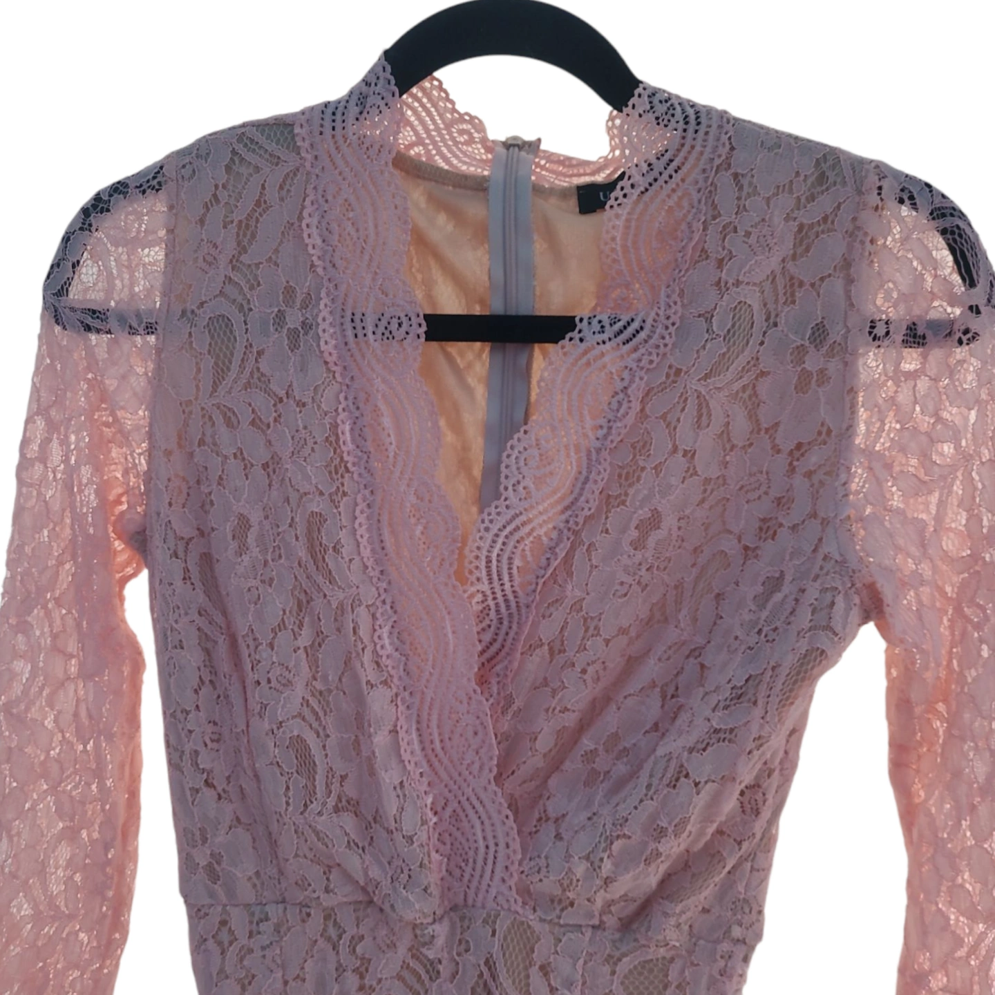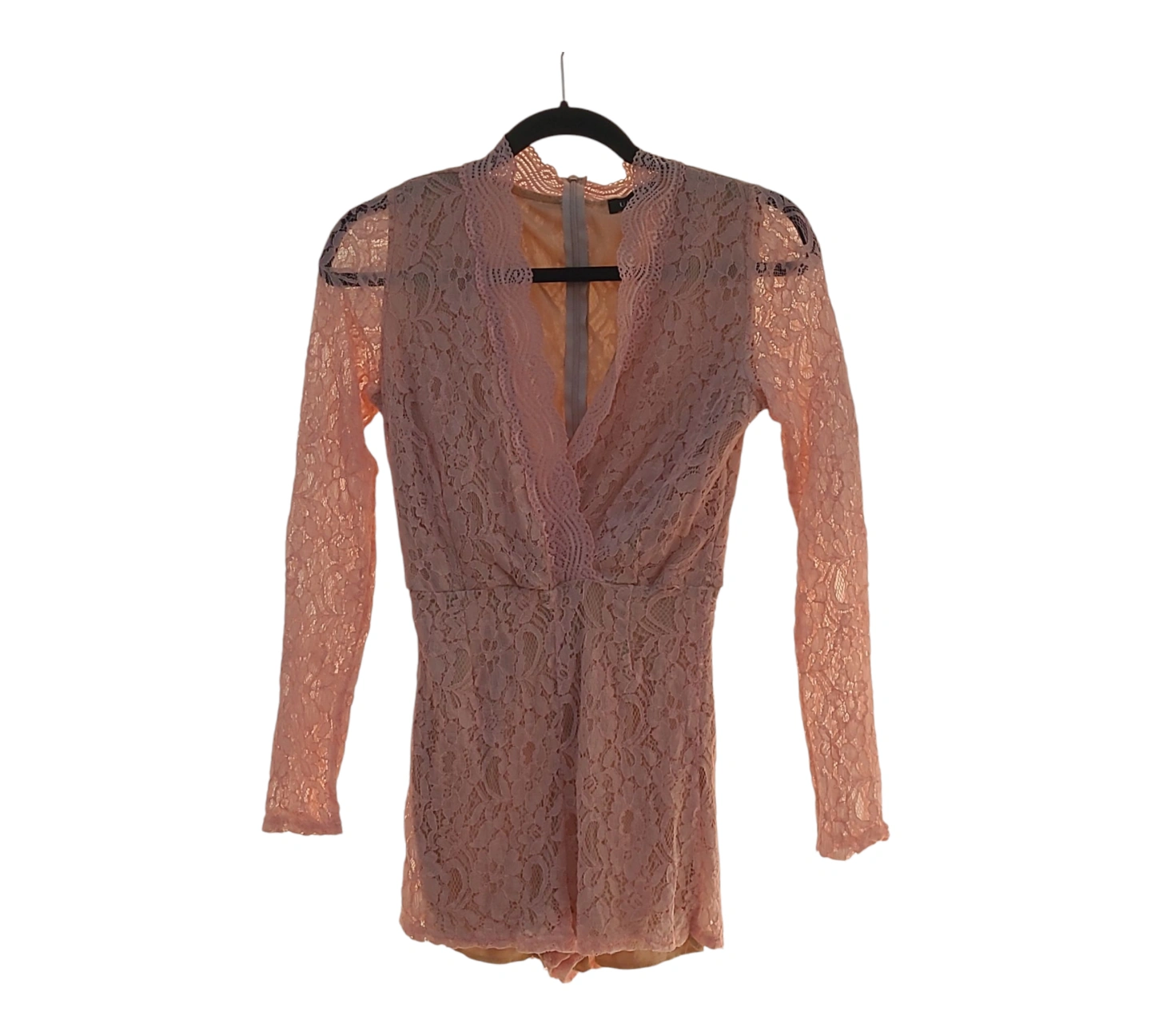 Pretty blush pink lace jumpsuit with long sleeves and a deep crossbody V-neck. It features a back zipper closure and is lined in the shorts and upper torso (the sleeves are unlined). This outfit is perfect for special occasions, dancers, Halloween costumes, or stunning, unique formal attire.
