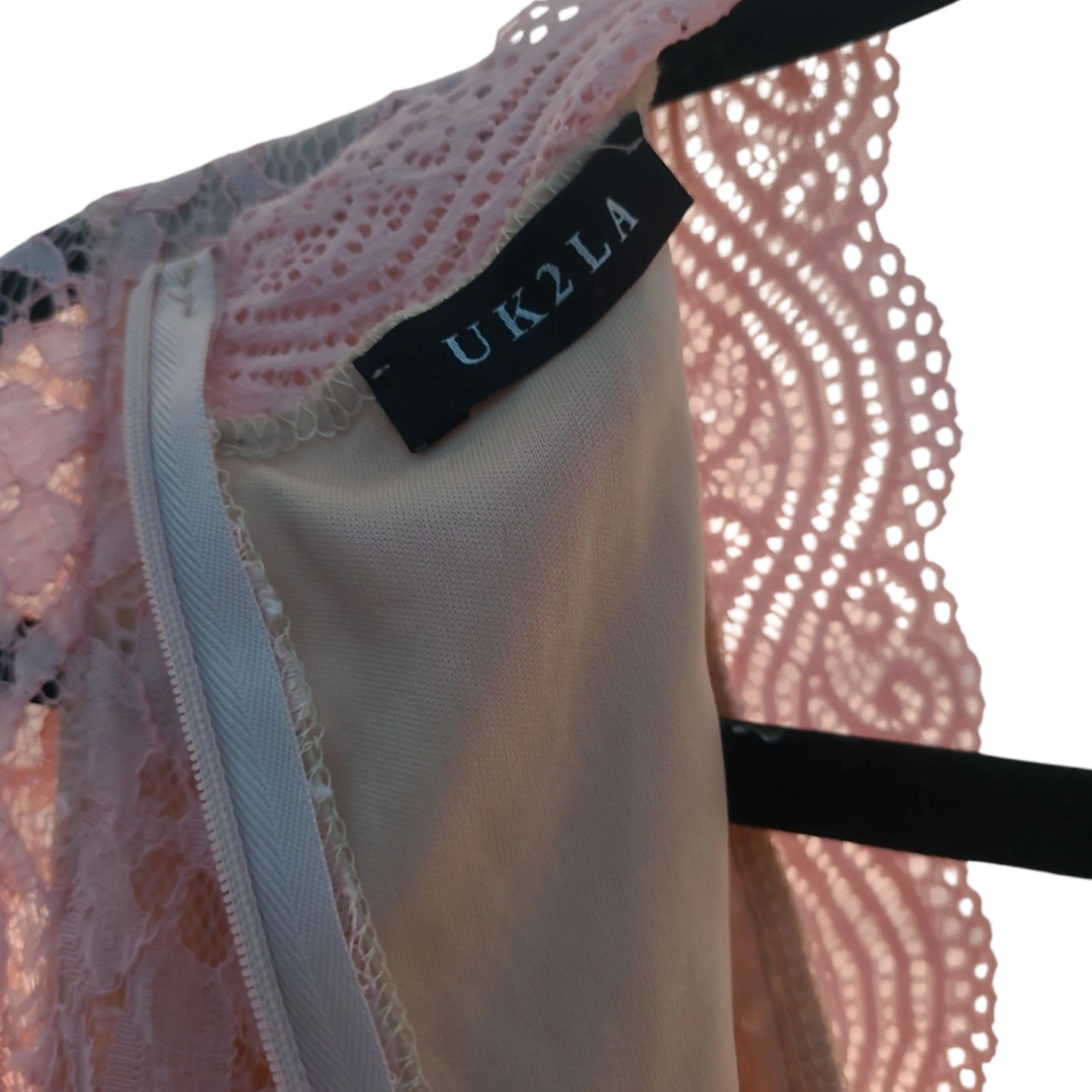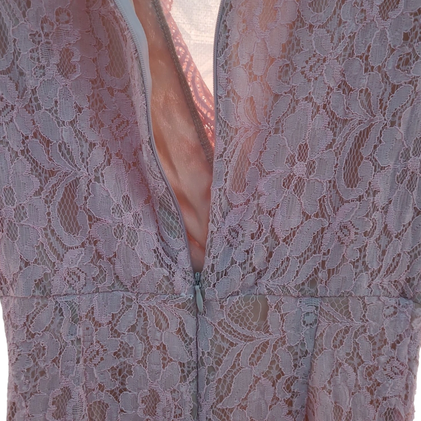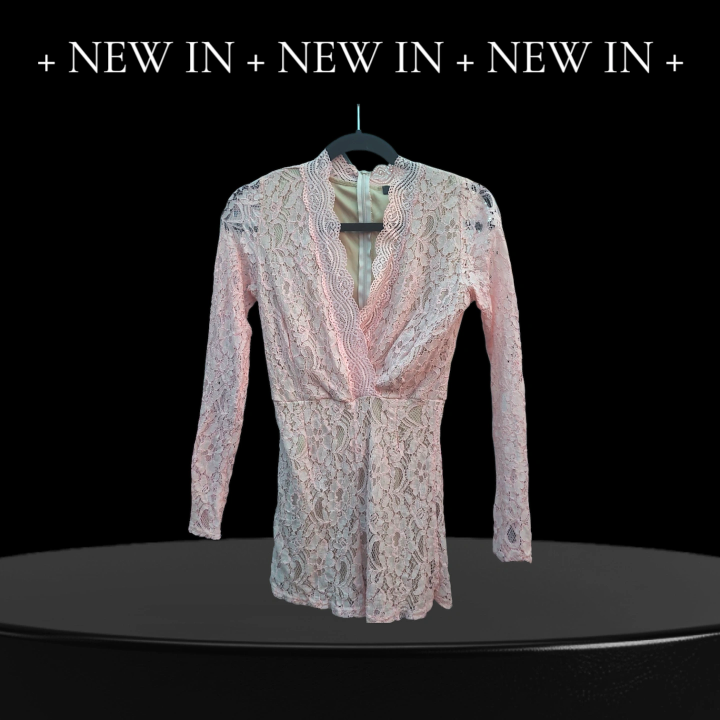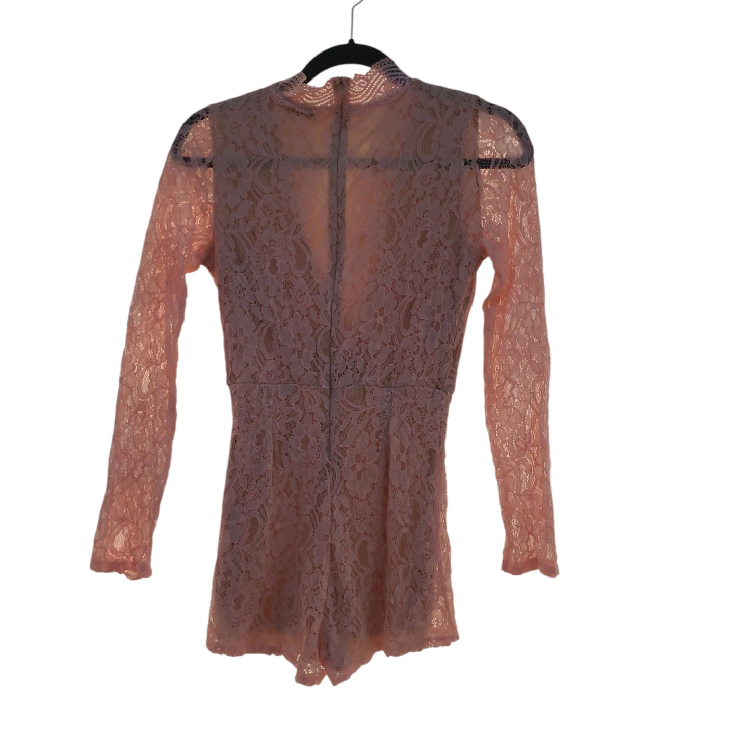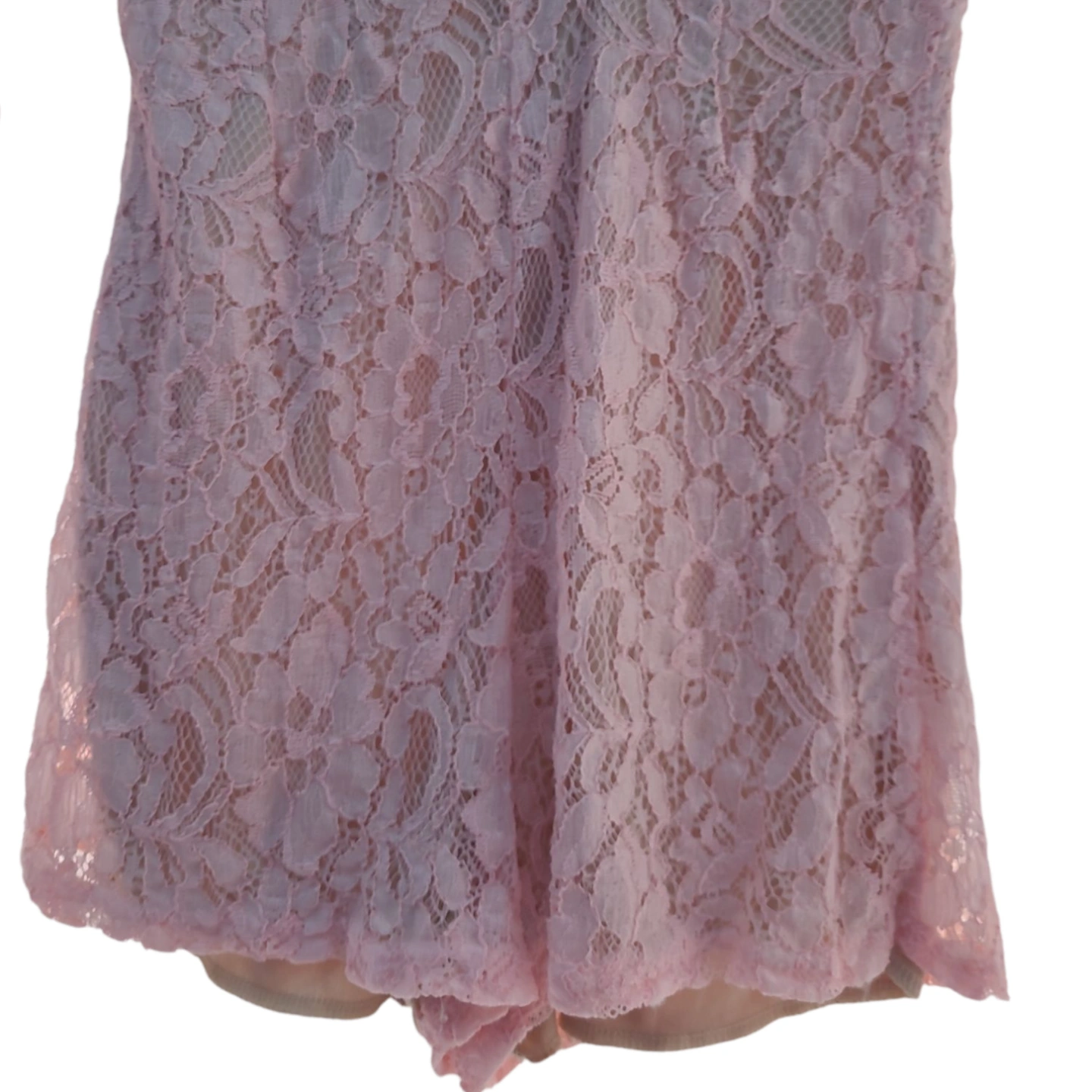 Pretty blush pink lace jumpsuit with long sleeves and a deep crossbody V-neck. It features a back zipper closure and is lined in the shorts and upper torso (the sleeves are unlined). This outfit is perfect for special occasions, dancers, Halloween costumes, or stunning, unique formal attire.