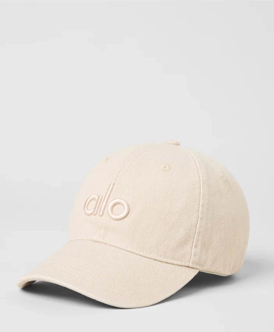 Beige cotton baseball cap. Features embroidered Alo Yoga logo. Adjustable back. brand new with tags still in package