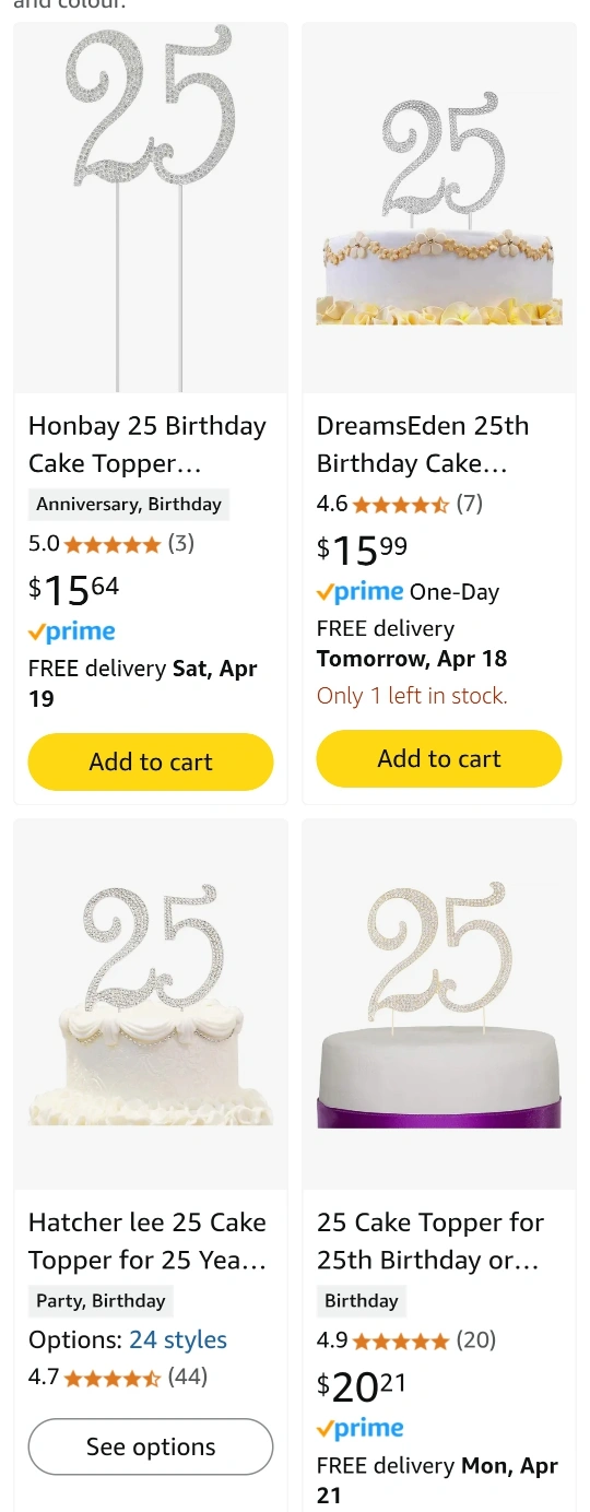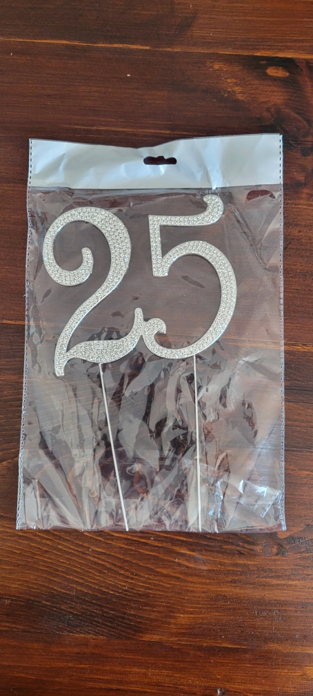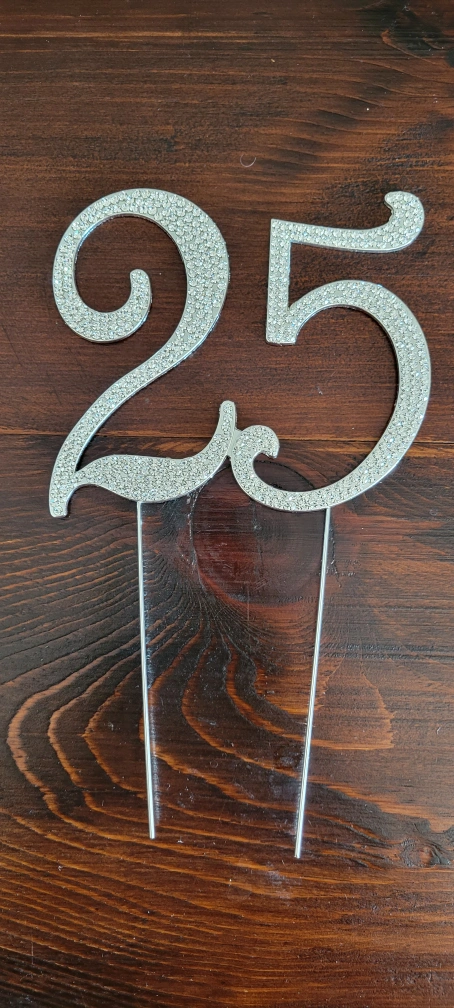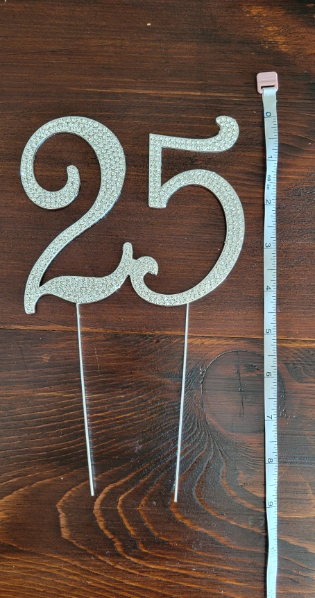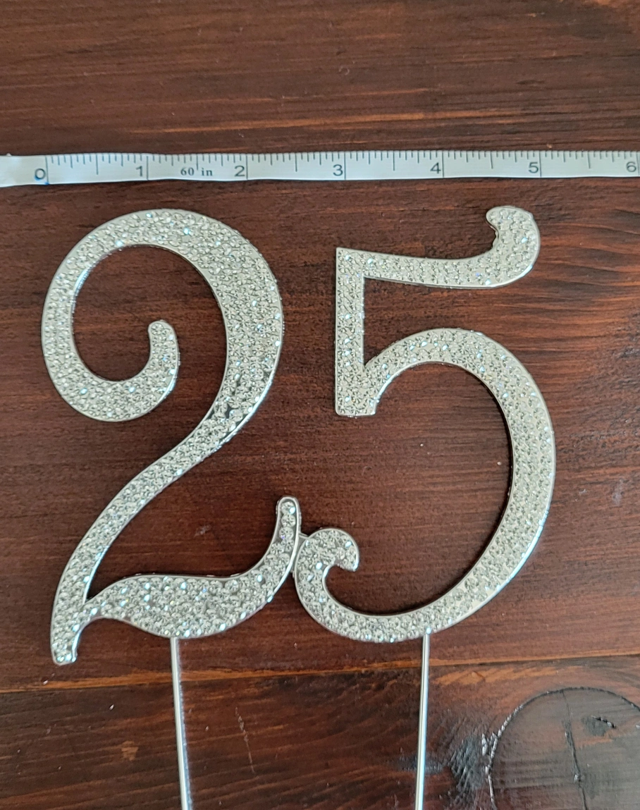5 x 9" Silver number 25 cake topper. Rhinestone accents. Metal wire inserts for easy placement. Perfect for a 25th birthday or anniversary celebration! Check out my other listings and bundle to save. ๐๐ป๐ธ Cash and pickup only on Brimley and Eglinton Rd E. in Scarborough.