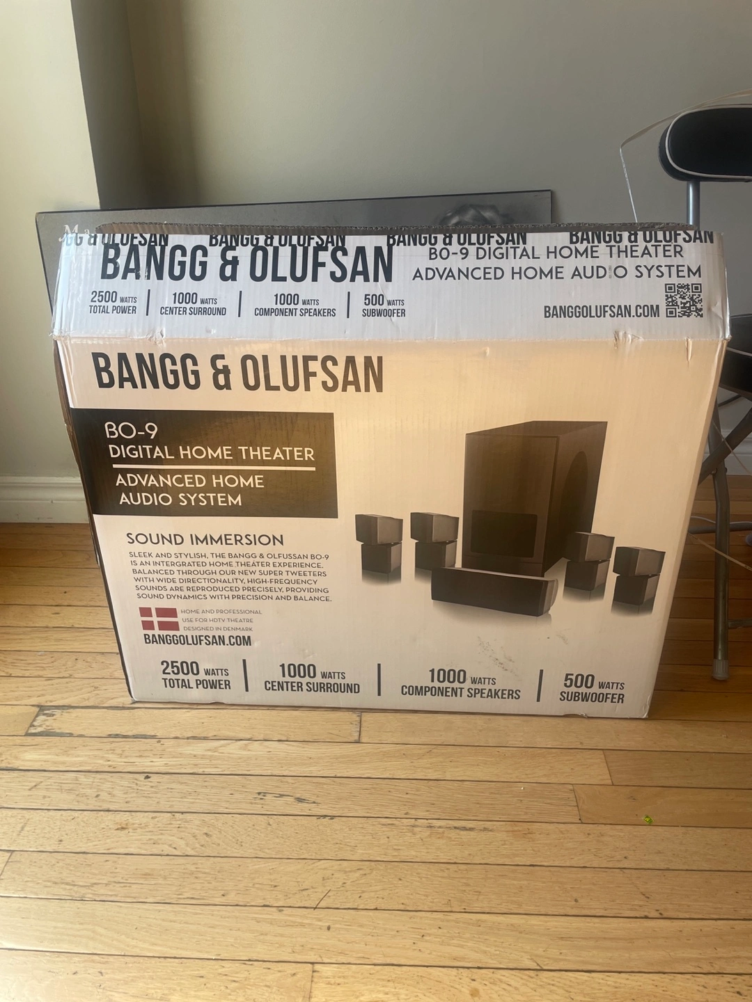 digital home theatre system. Includes subwoofer, center and component speakers. Sleek and stylish design. Powerful sound. Unopened box, never used.