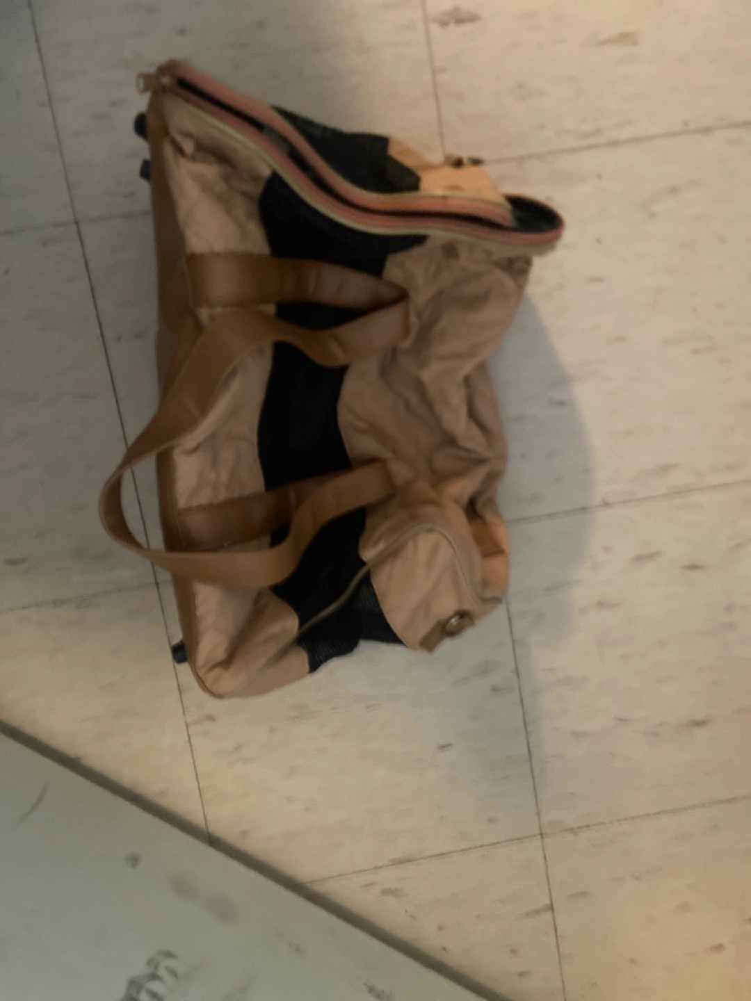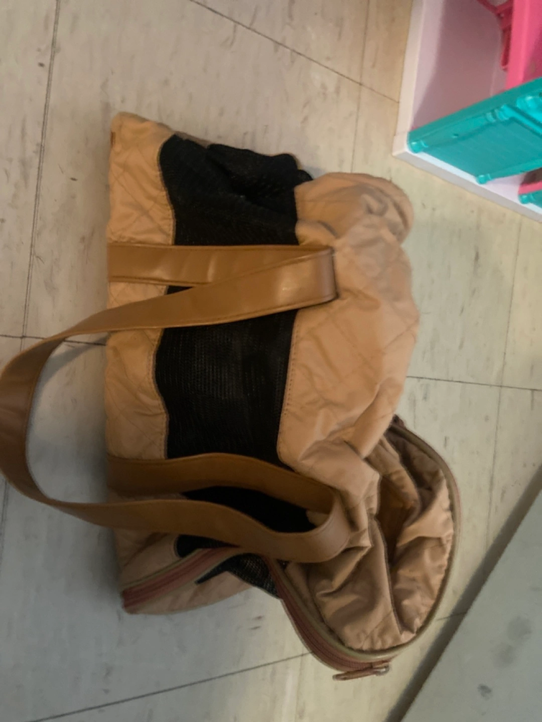 Beige quilted pet carrier. Features a mesh window and brown leatherette handles. Zipper closure. Great for small animals.