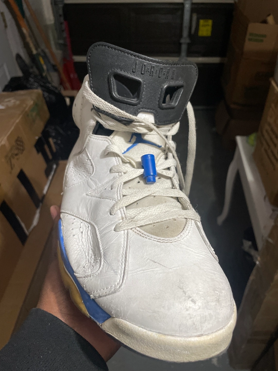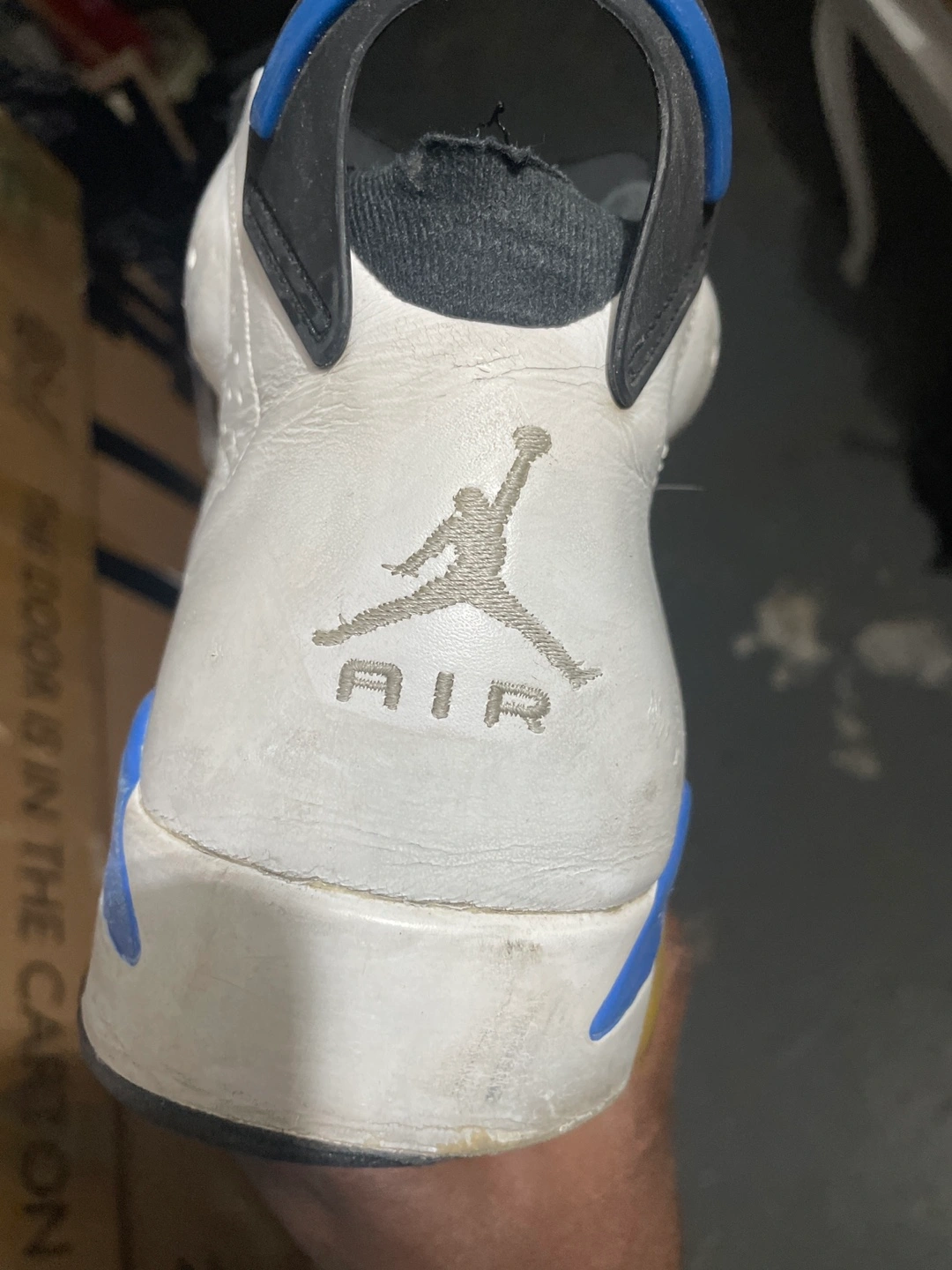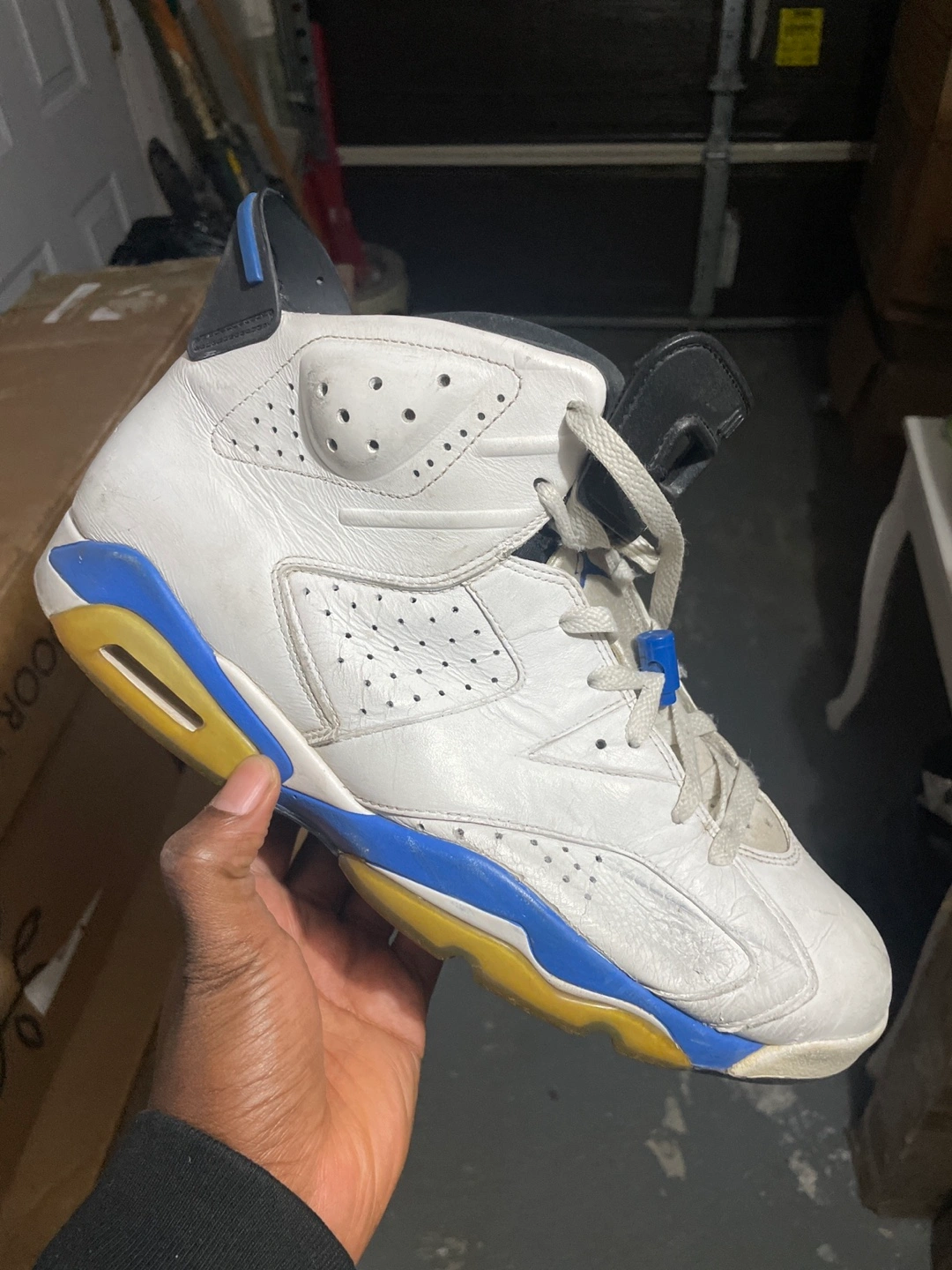 Men's Air Jordan 6 Retro basketball shoes. White leather upper, blue and yellow accents. Pre-owned, shows some wear.