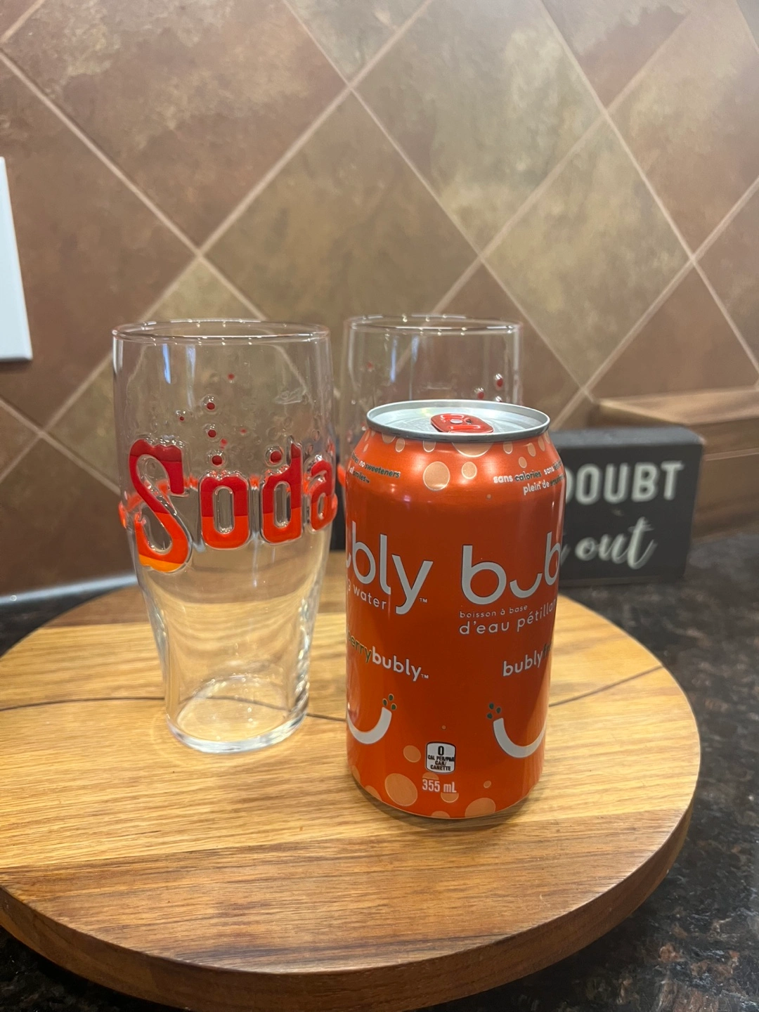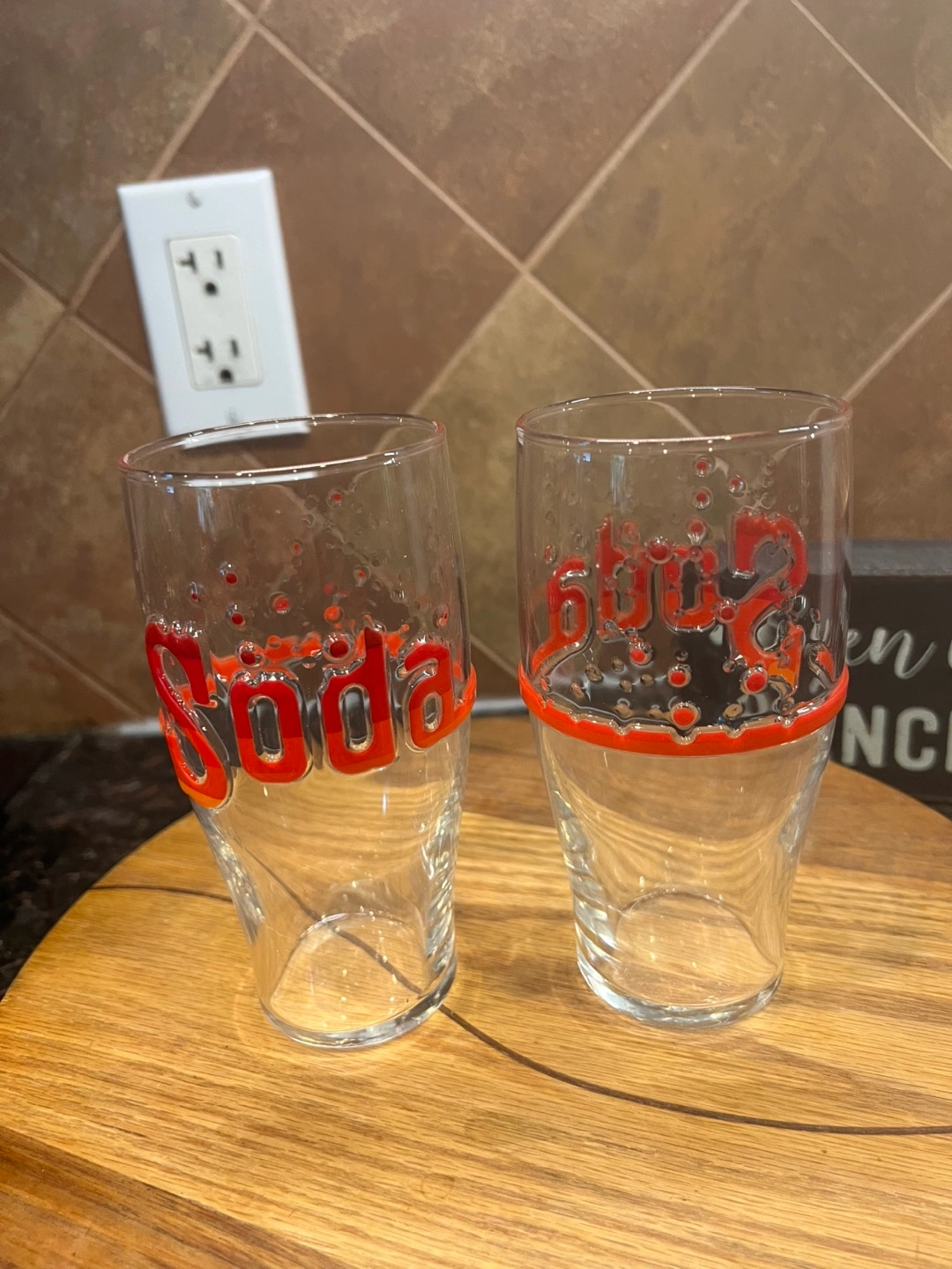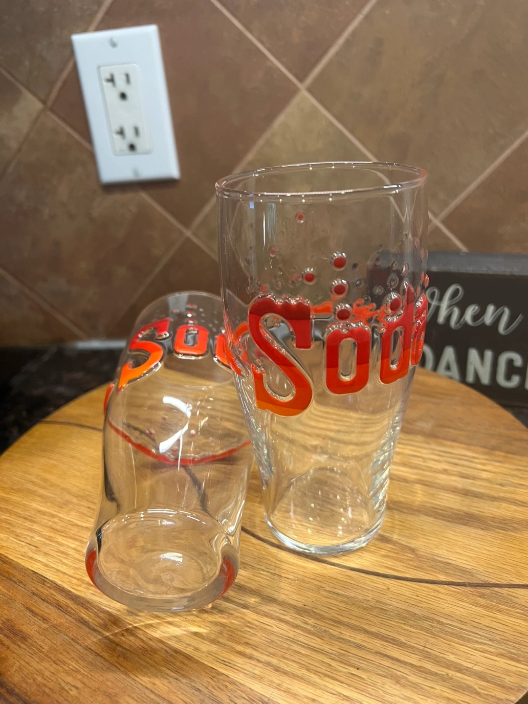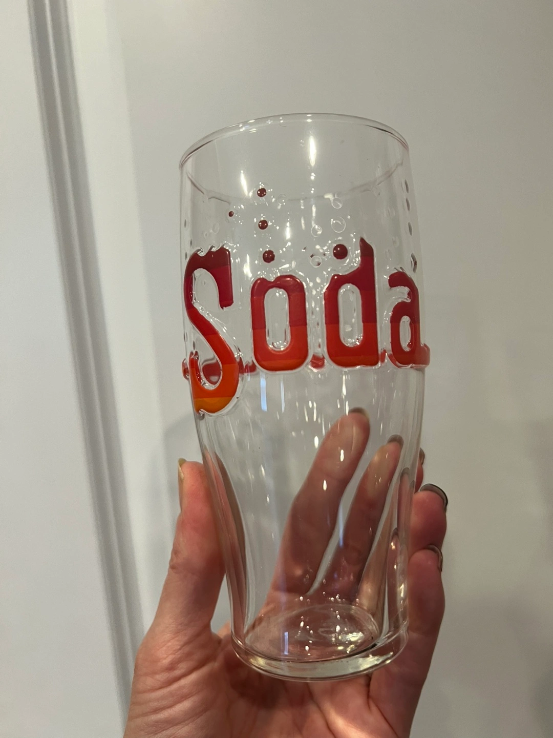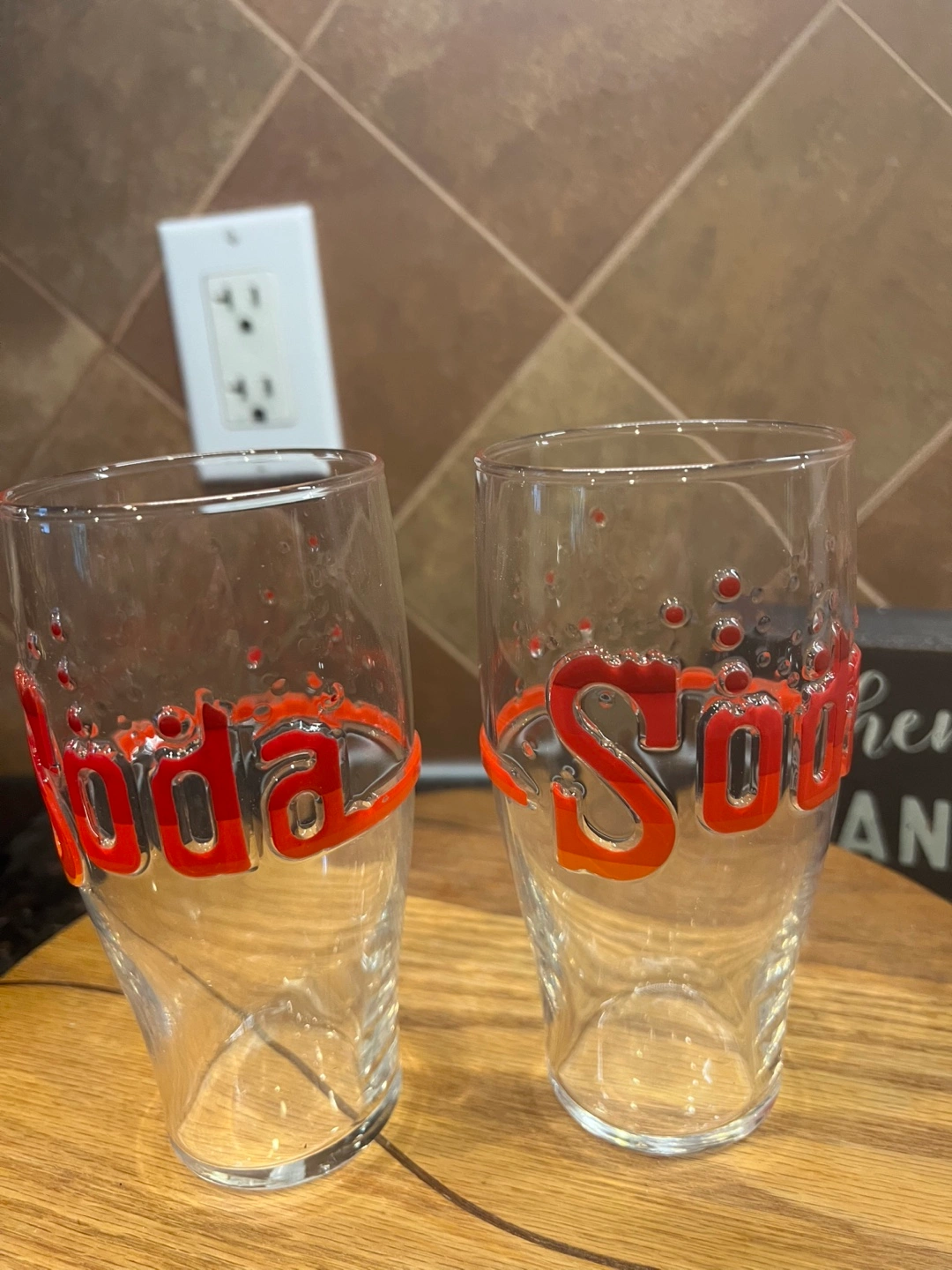 Vintage inspired Soda glasses Set of 2 Perfect for enjoying your favourite fizzy beverages Each glass features a vibrant soda design, reminiscent of classic soda fountain aesthetics Great condition *Can of Bubly for size reference* Asking $5 for both/Sold as a set Interested? Message me and please check my other listings…