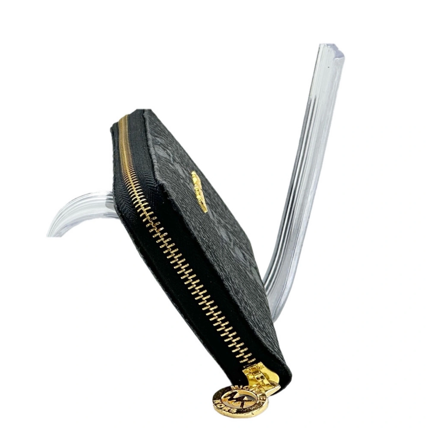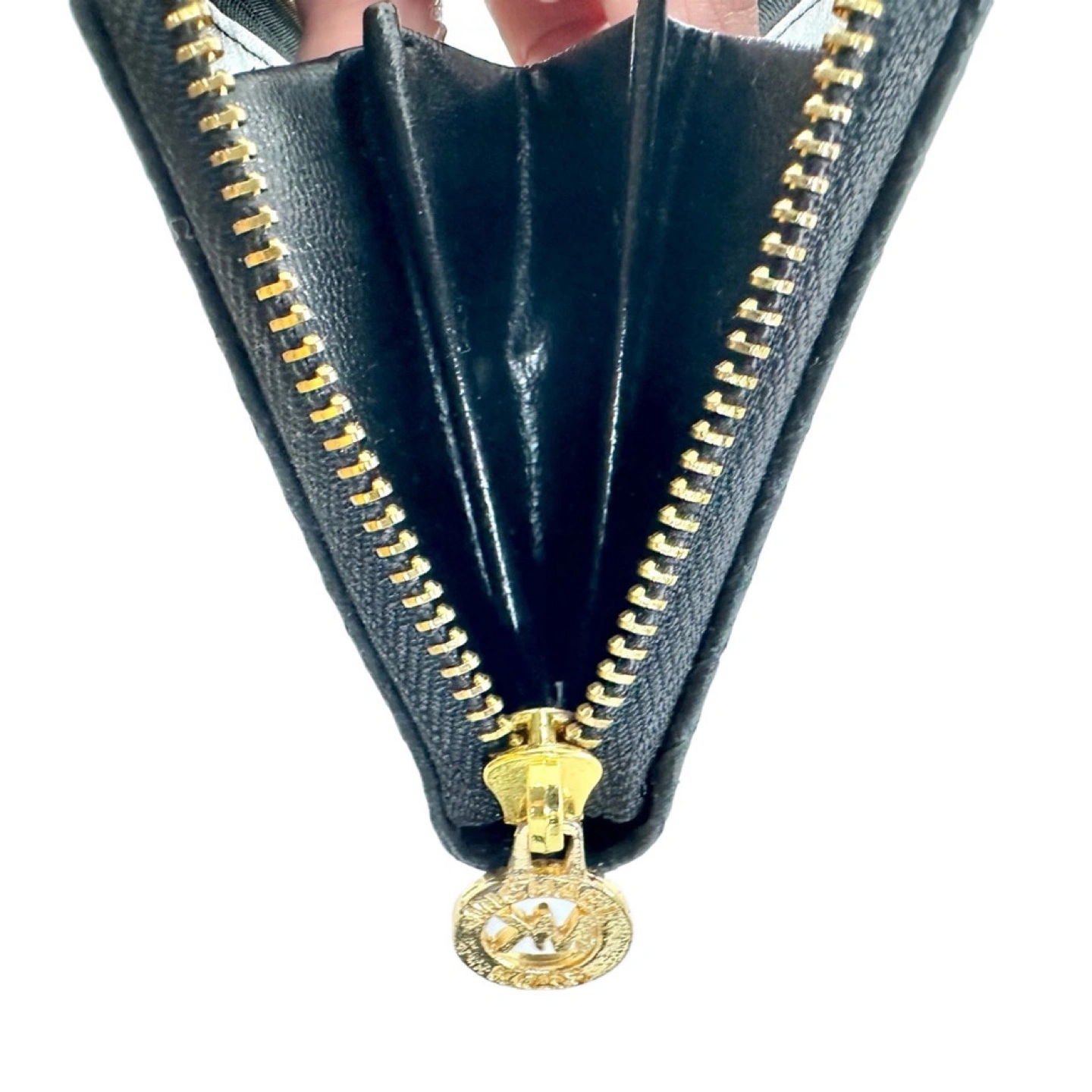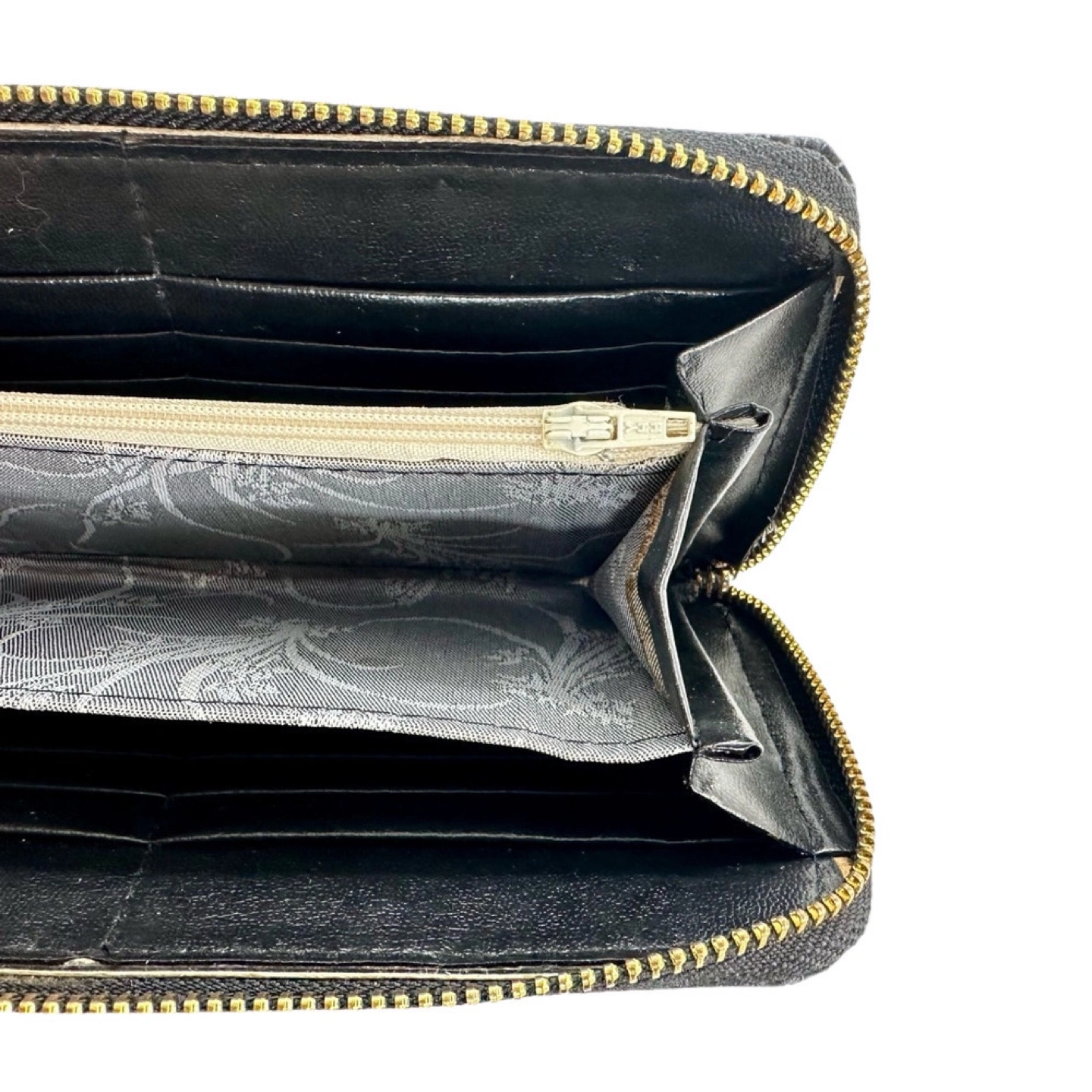 Black python embossed leather zip-around wallet. Gold-toned hardware. Multiple card slots and compartments. Zipper closure.