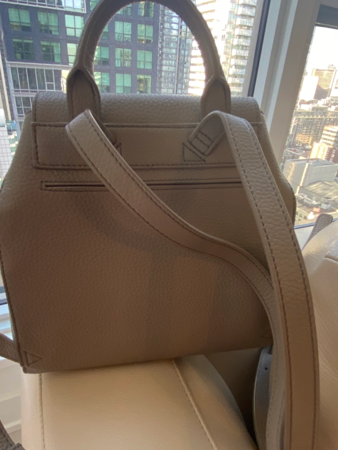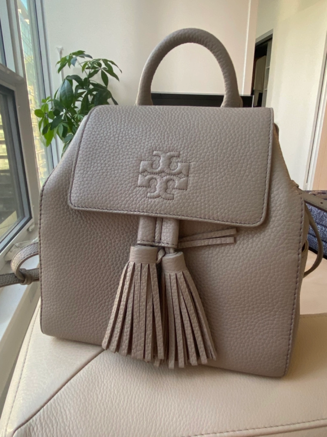 Used 1 time. Beautiful mini backpack. Pebbled leather. Top handle and adjustable straps. Drawstring closure. Two tassels. Interior zipper pocket.