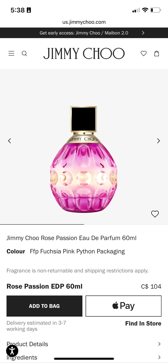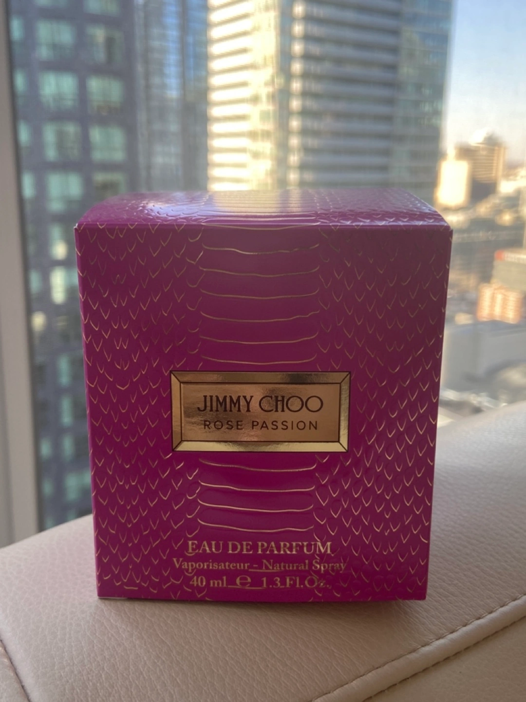 40ml Eau de Parfum spray. Beautiful purple bottle. New. Full bottle Jimmy Choo Rose Passion Eau de Parfum 40ml is a rich floral fragrance that perfectly encapsulates glamour. Taking inspiration from the allure of the French Riviera, this fragrance captures the essence of beauty and luxury of this famous vacation destination. To begin with, the composition opens with refreshing notes of coconut water coupled with the exoticness of the frangipani flower.