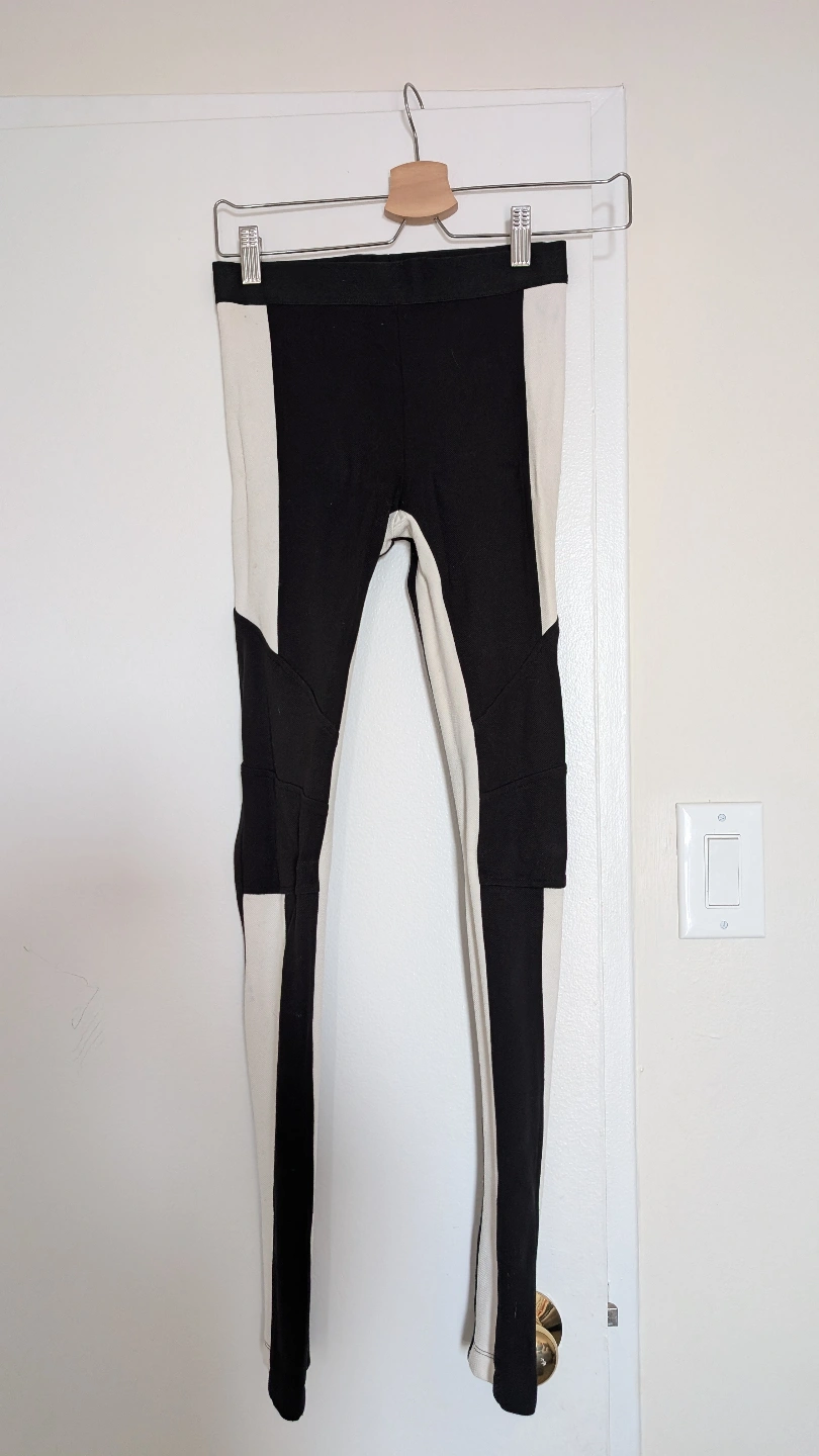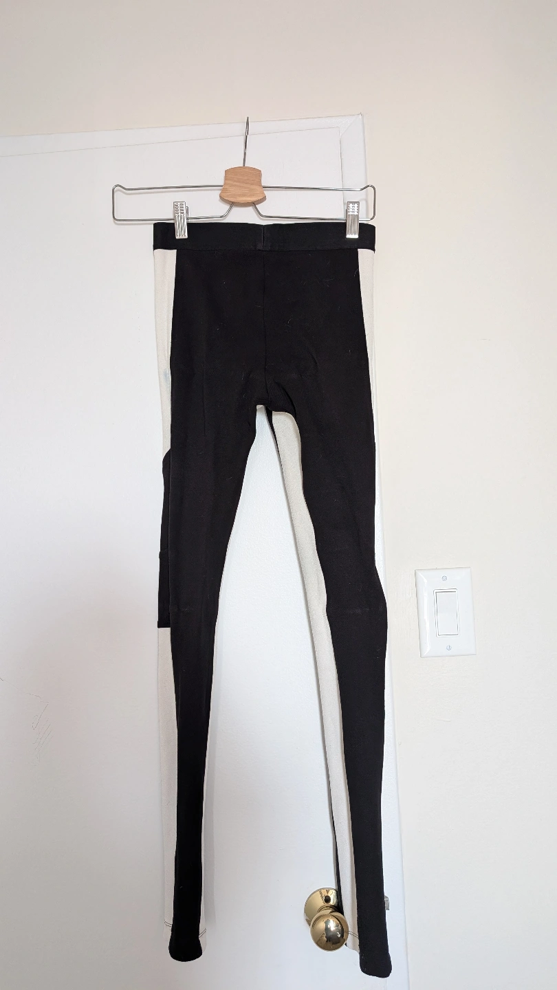 BCBGMAXAZRIA leggings. Size xx small. Black and off-white colour-blocked design. Stretchy fabric. Excellent for layering or casual wear.