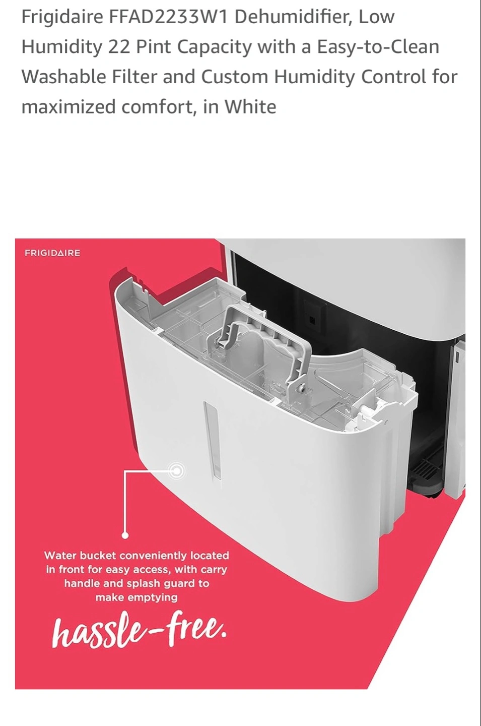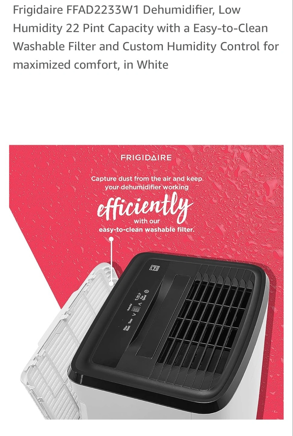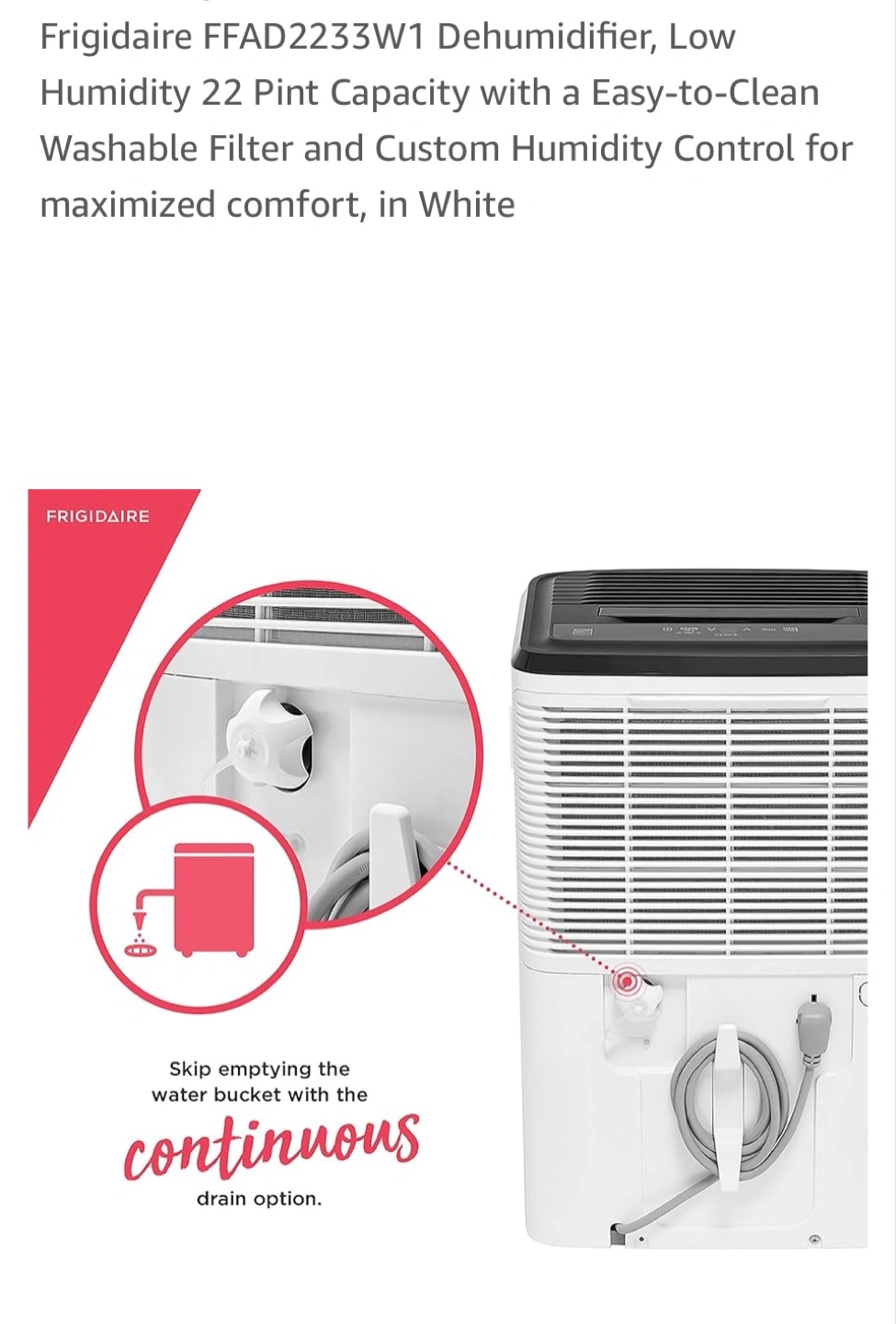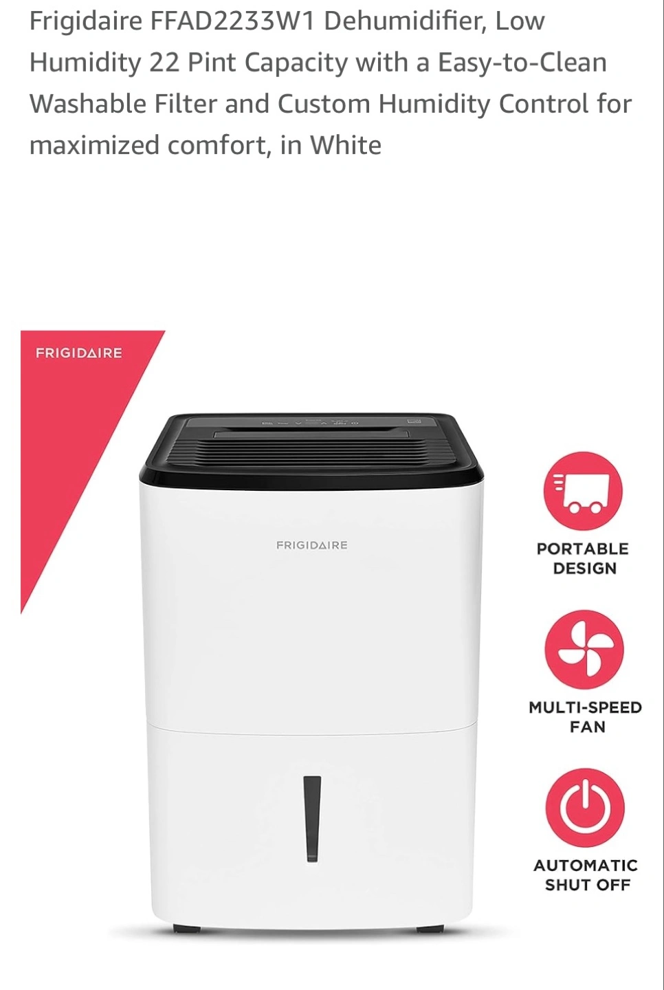 Portable dehumidifier, 22-pint capacity. Features easy-to-clean washable filter, custom humidity control, and multi-speed fan. Automatic shutoff and continuous drain option. White.