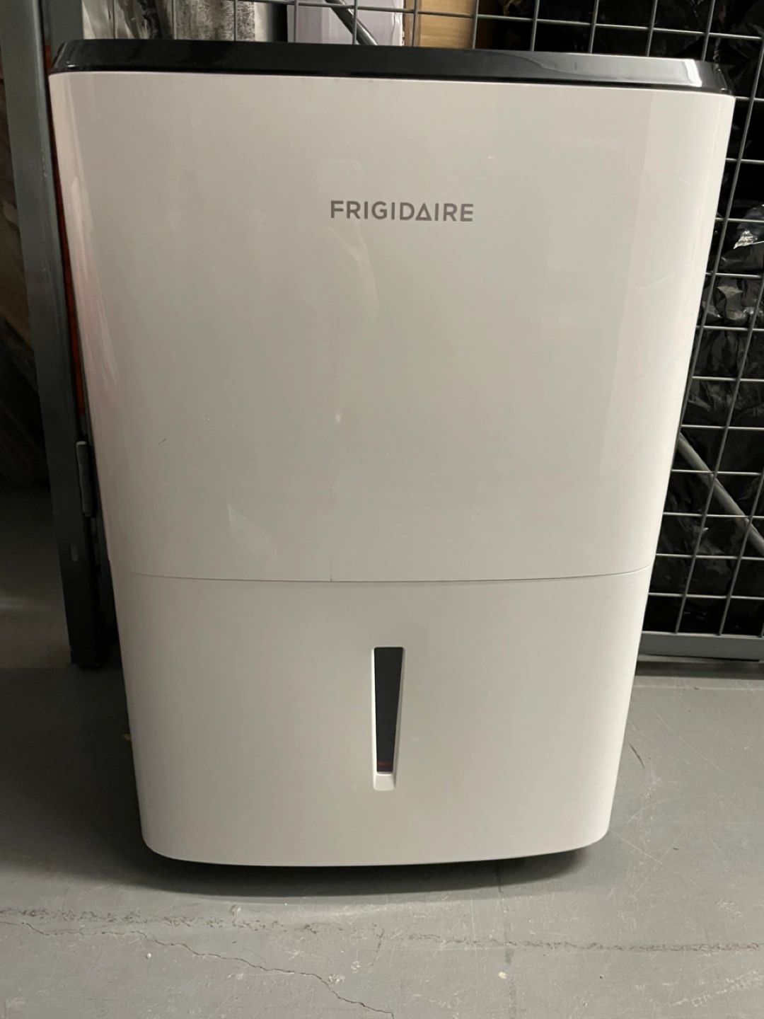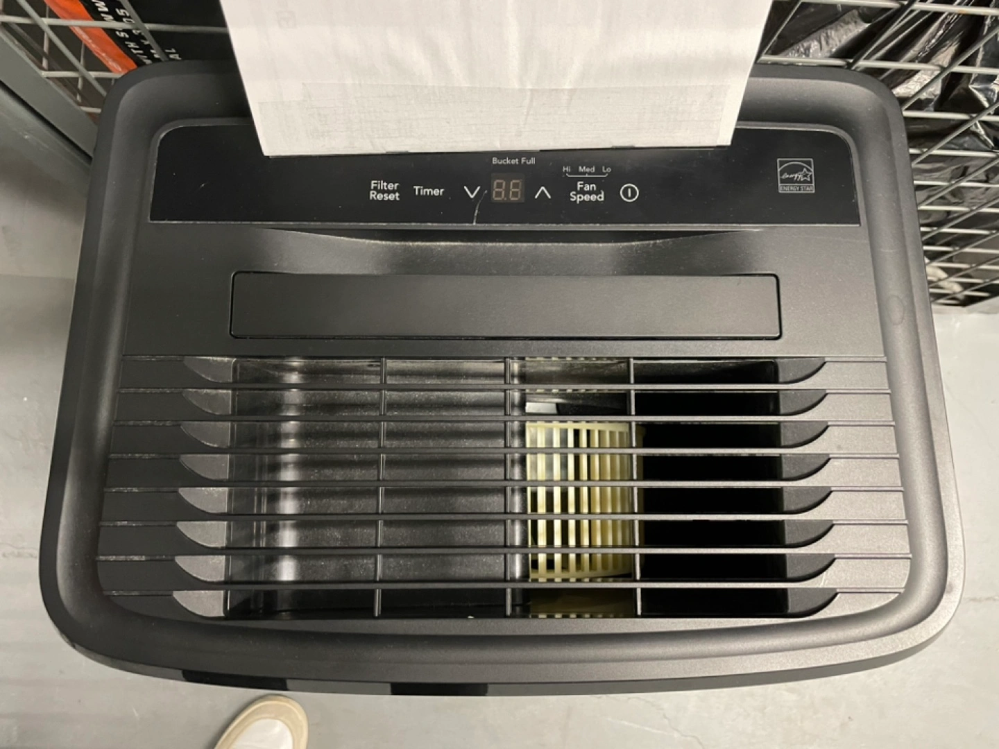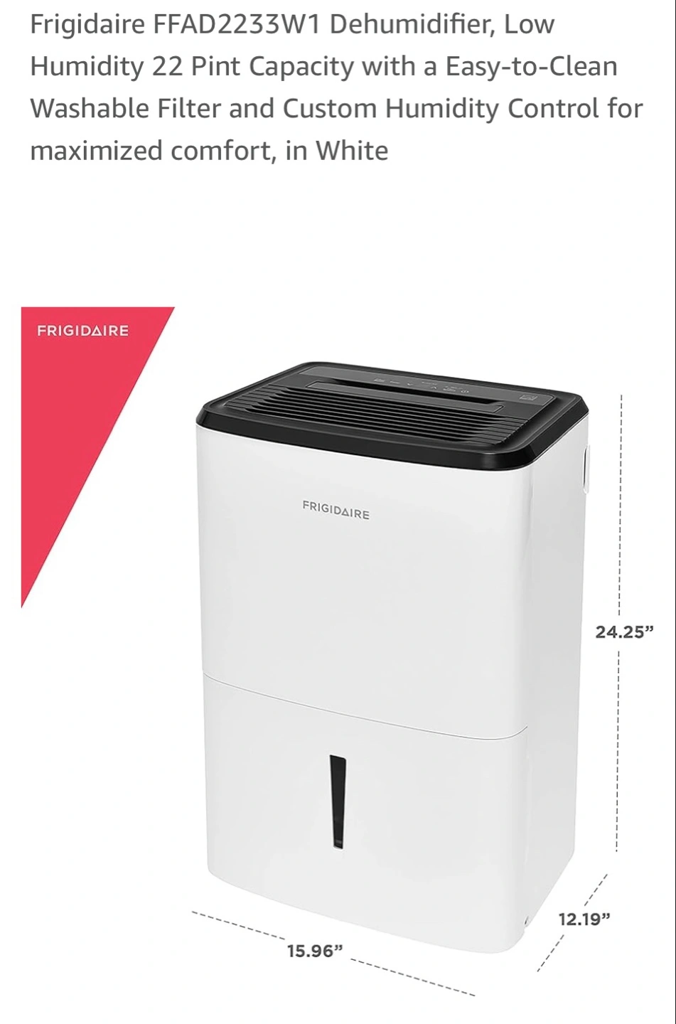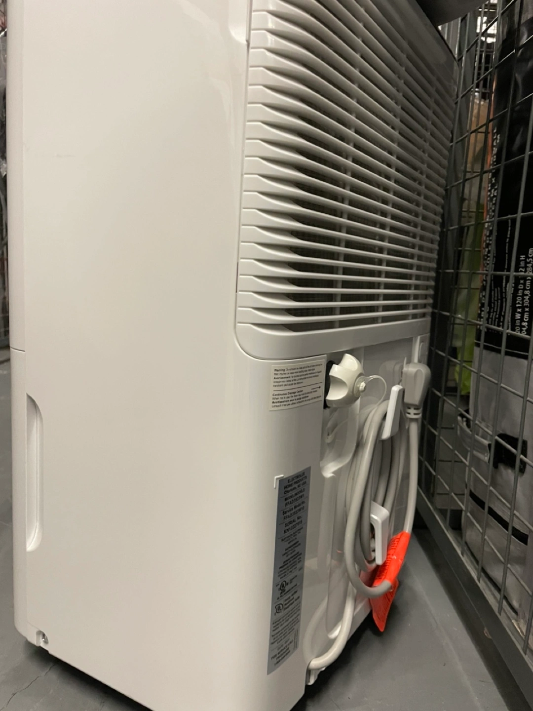 Portable dehumidifier, 22-pint capacity. Features easy-to-clean washable filter, custom humidity control, and multi-speed fan. Automatic shutoff and continuous drain option. White.