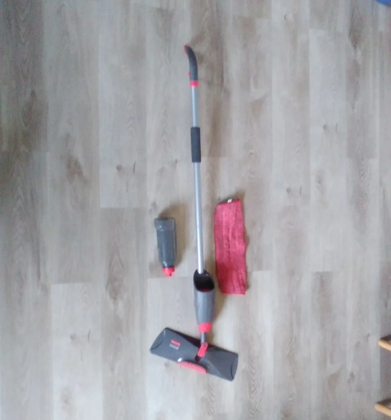 Used spray mop. Includes mop, spray bottle, and microfiber pad. Great for quick and easy floor cleaning. I swear I don't have any bed bugs. Getting rid of this because I need to find something better for cleaning textured luxury vinyl tiles