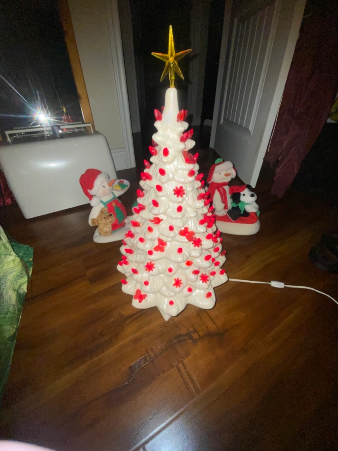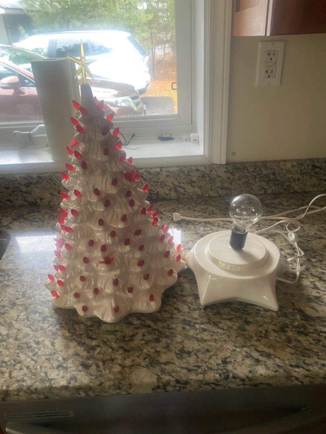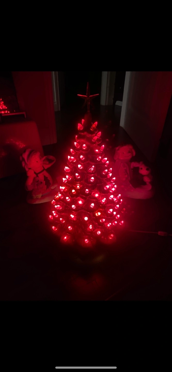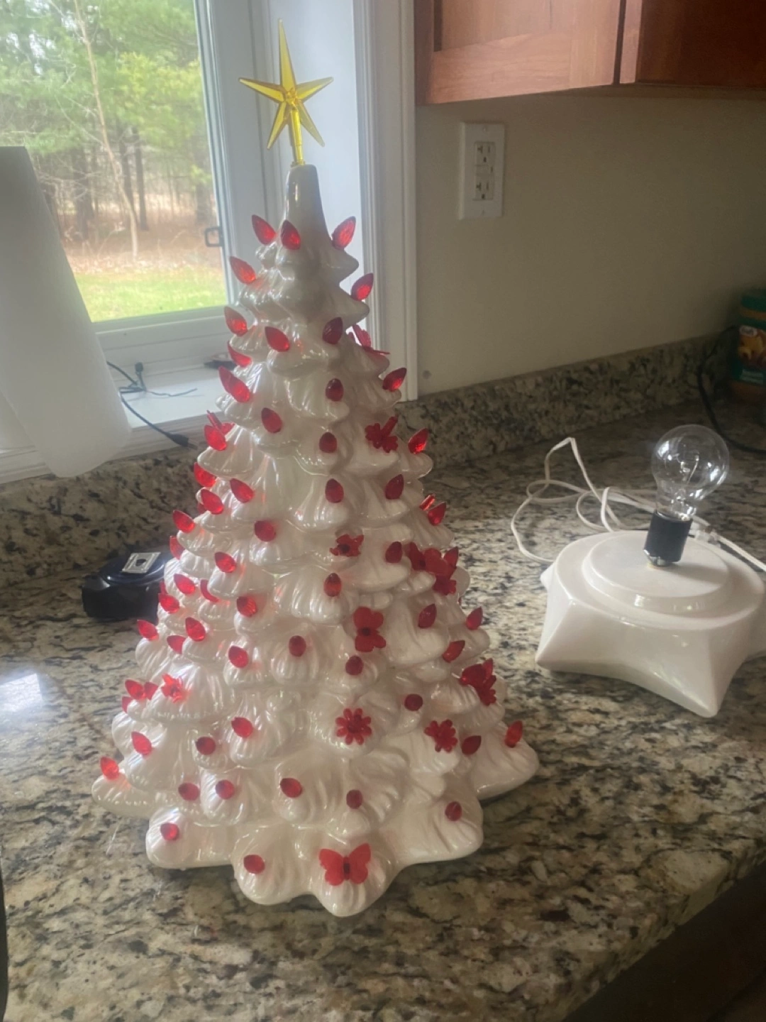 Beautiful vintage ceramic Christmas tree. Features red lightbulbs. Includes separate base. Perfect holiday decor. Has butterflies birds and bulbs . Pick up Port Elmsley